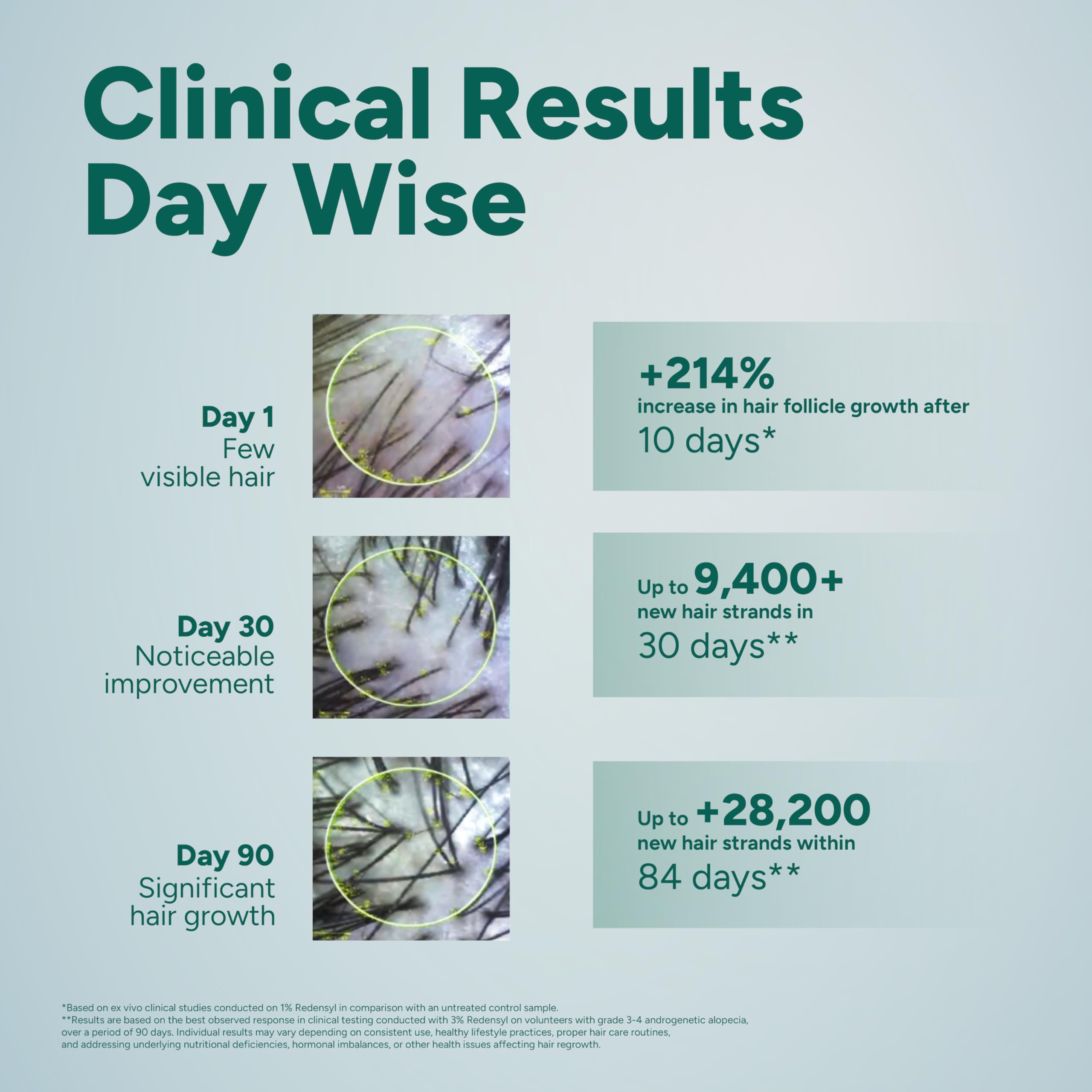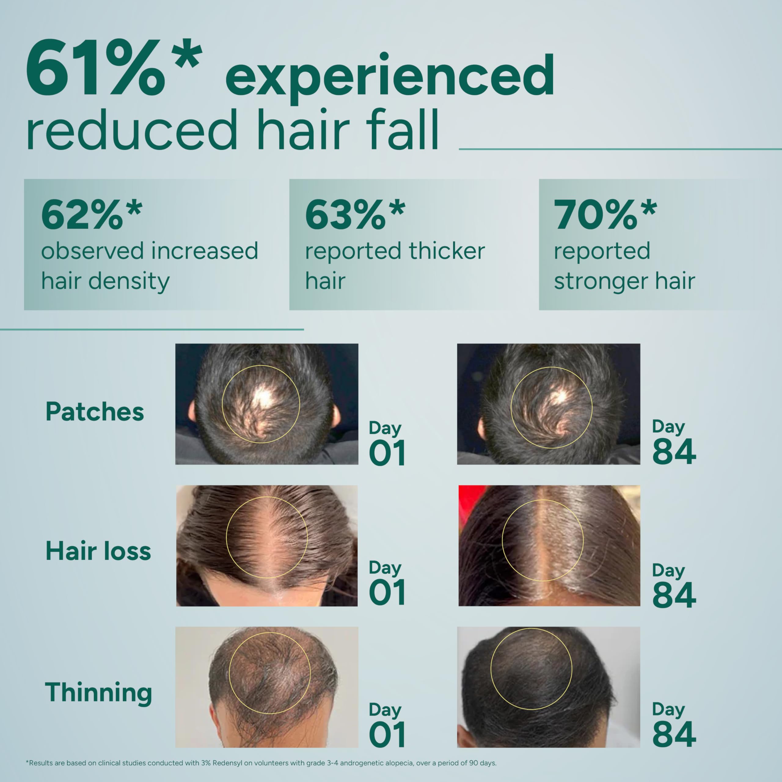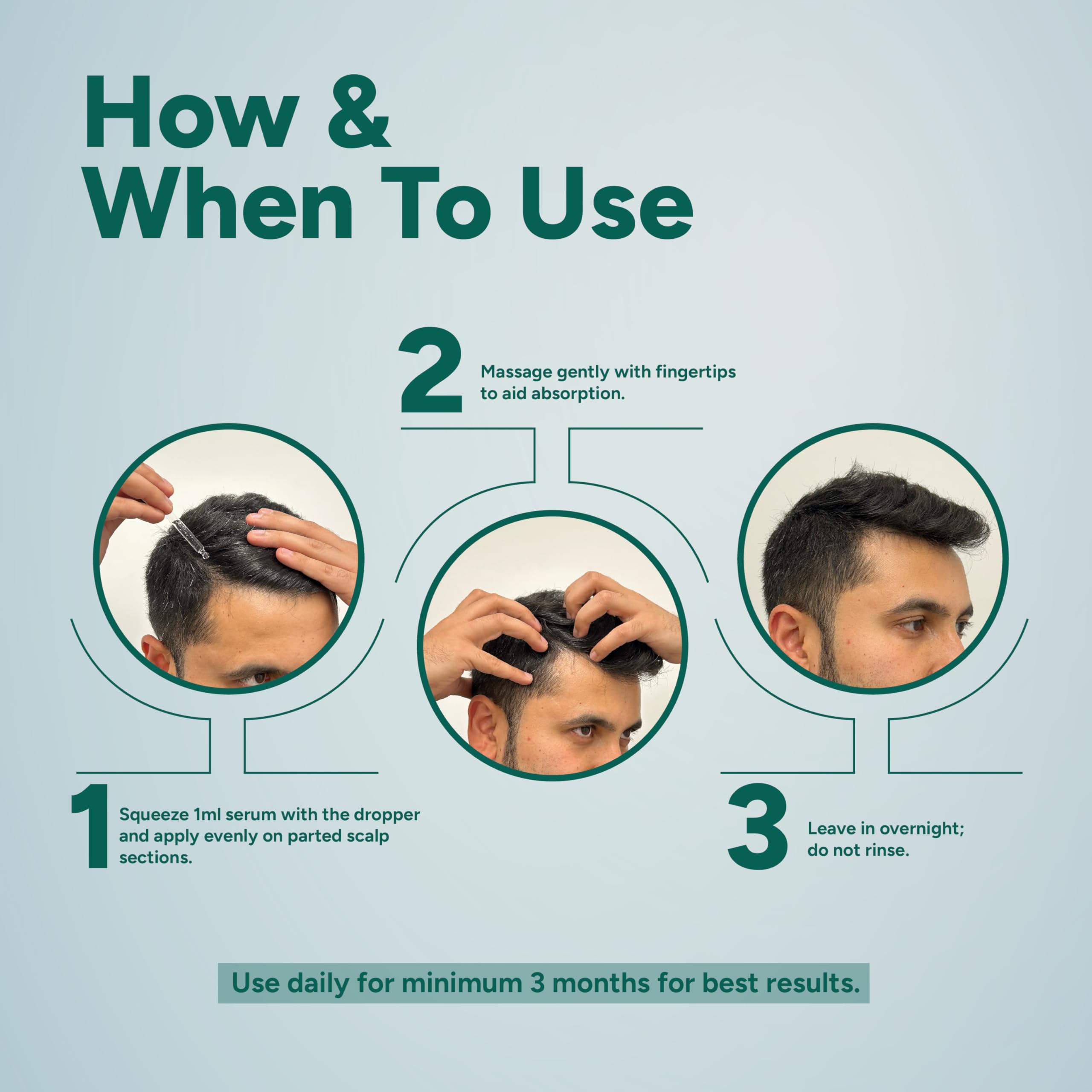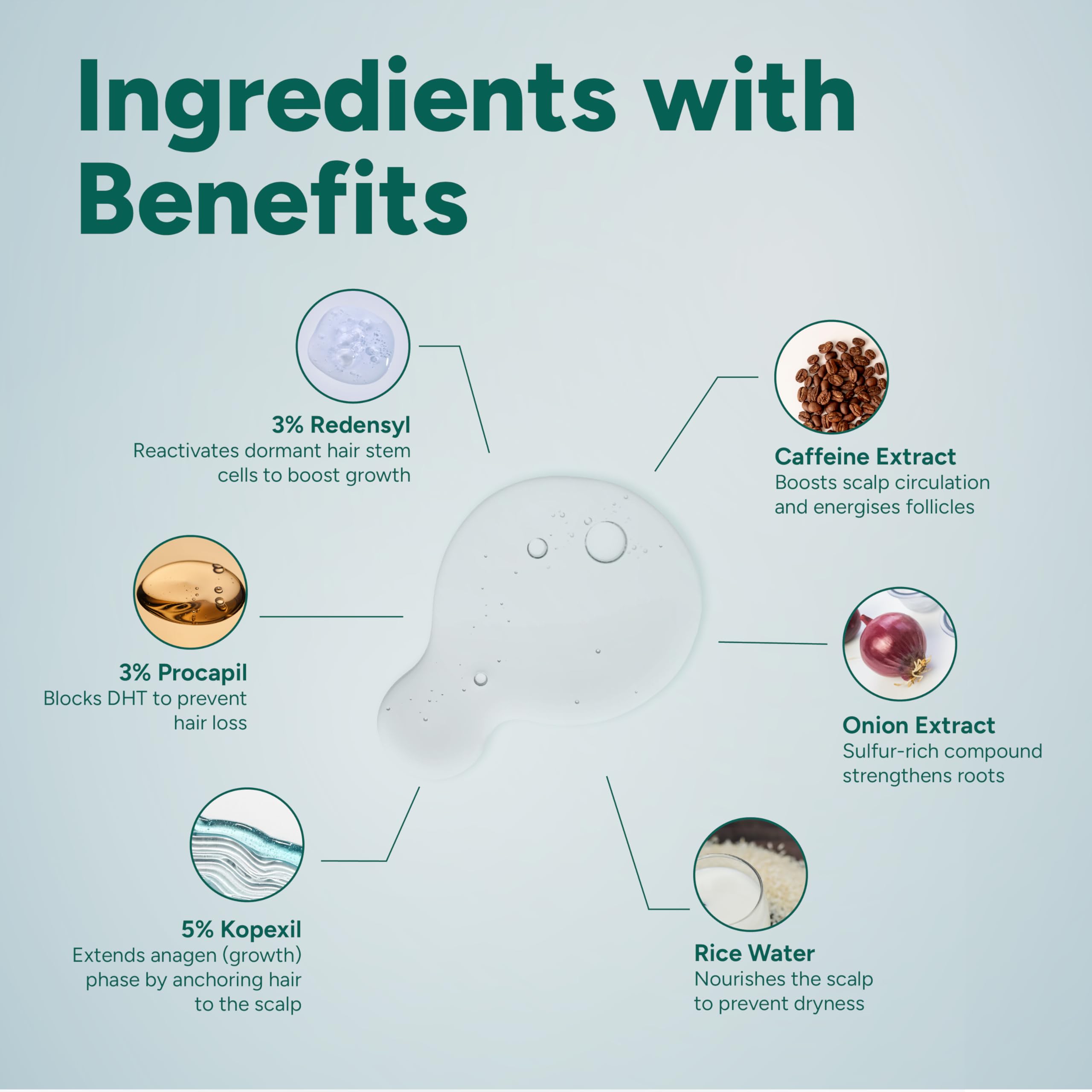 𝗦𝗖𝗜𝗘𝗡𝗖𝗘 𝗕𝗔𝗖𝗞𝗘𝗗, 𝗠𝗨𝗟𝗧𝗜-𝗔𝗖𝗧𝗜𝗩𝗘𝗦 : Our hair growth serum is powered by three scientifically proven hair growth actives that are safer than Minoxidil;3% Redensyl, 3% Procapil, 5% Kopexil and reinforced with the natural goodness of onion, turmeric, amla and caffeine. Together, they promote hair growth, extend the anagen (growth) phase, and control hair loss. They also promote thicker and more resilient strands, making your hair look more voluminous than before.