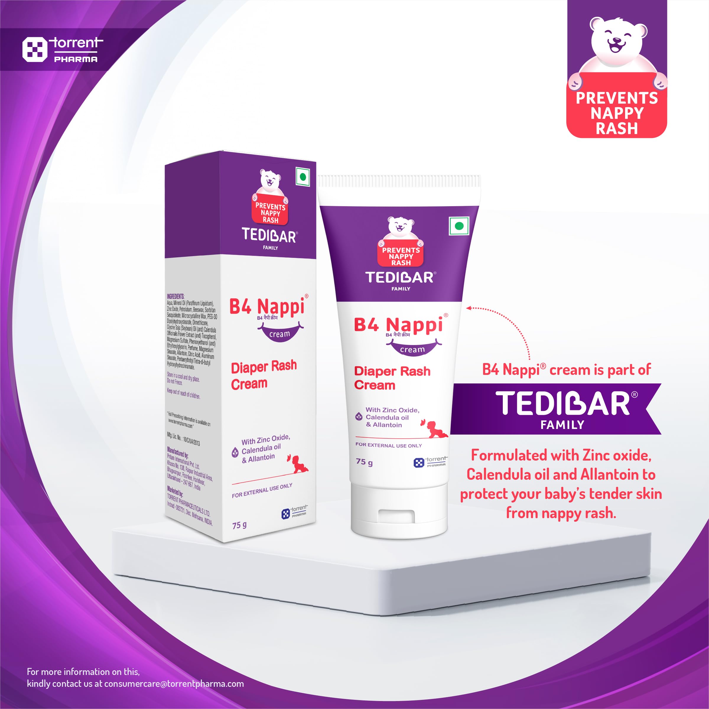 Details: B4 Nappi cream is part of Tedibar Family formulated with Zinc Oxide, Calendula Oil & Allantoin to protect your baby's tender skin from nappy rash. It is Prescribed by pediatricians.