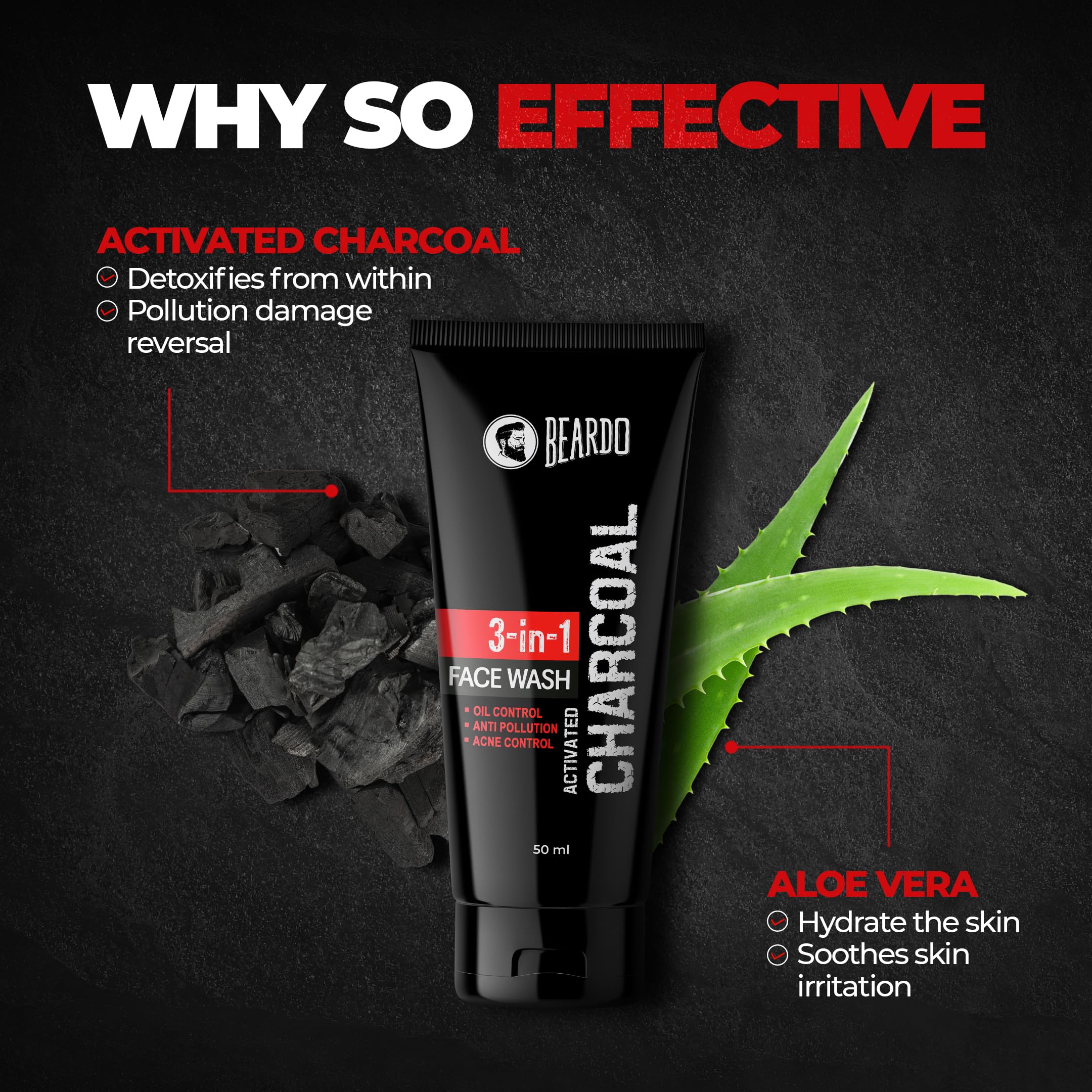 Activated Charcoal Face wash: Exposure to pollutants in industrial smoke, exhaust fumes and smog which expose our skin to toxin loads every day leave it dull, dry, sensitive, itchy and wrinkled. Beardo Activated Charcoal face wash helps remove these toxins by drawing out and trapping these impurities.