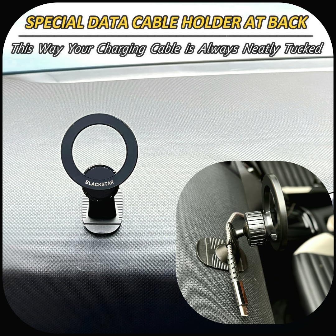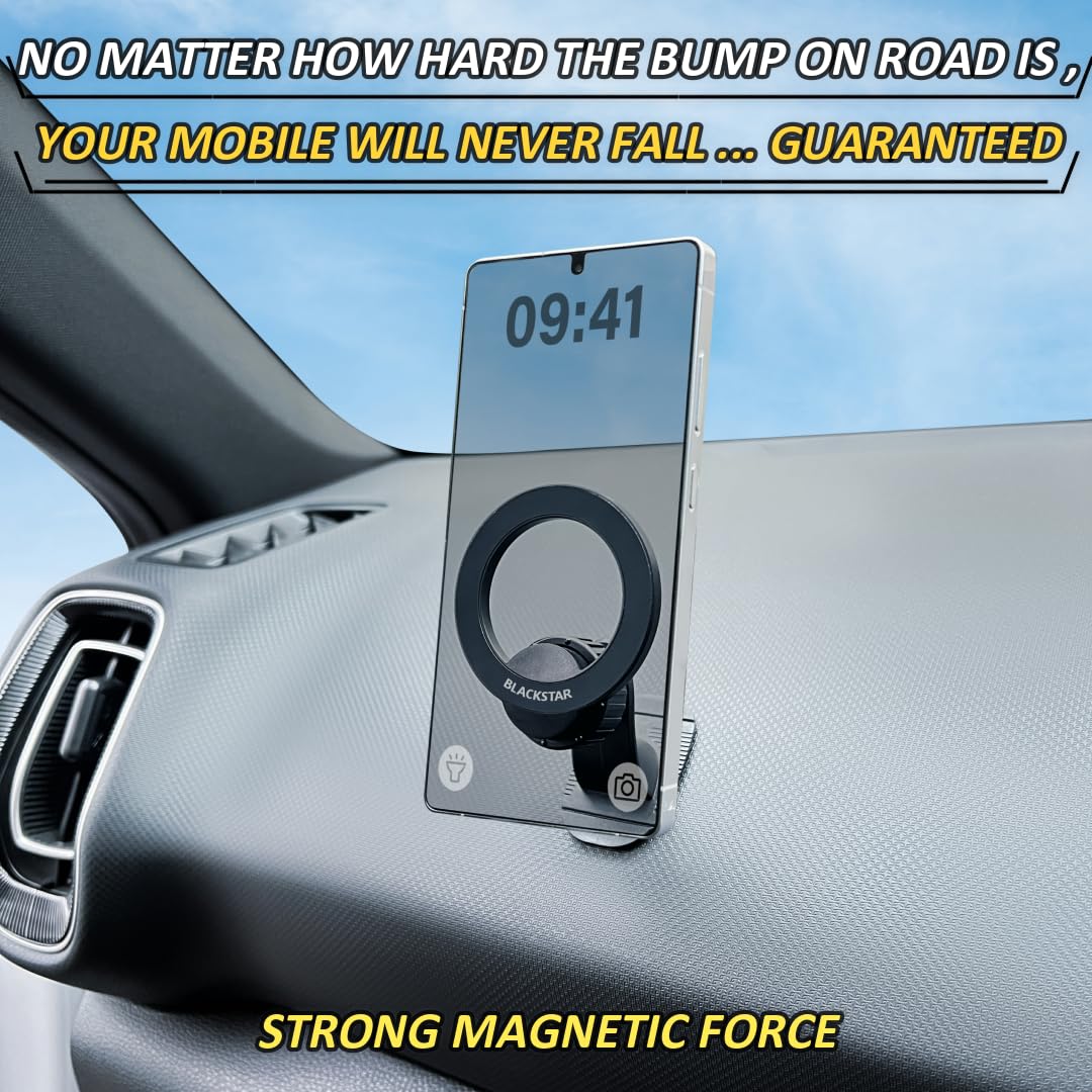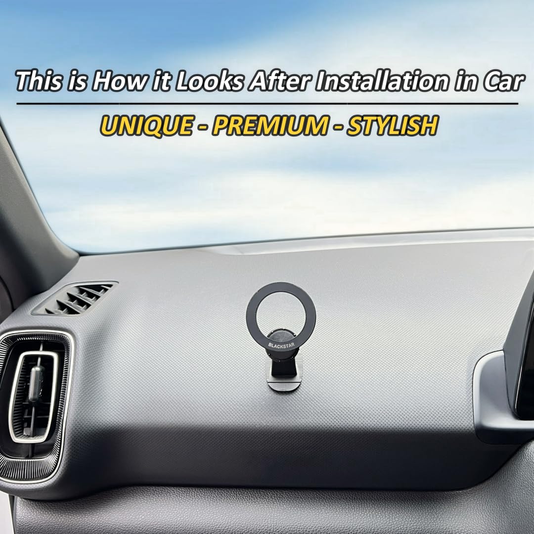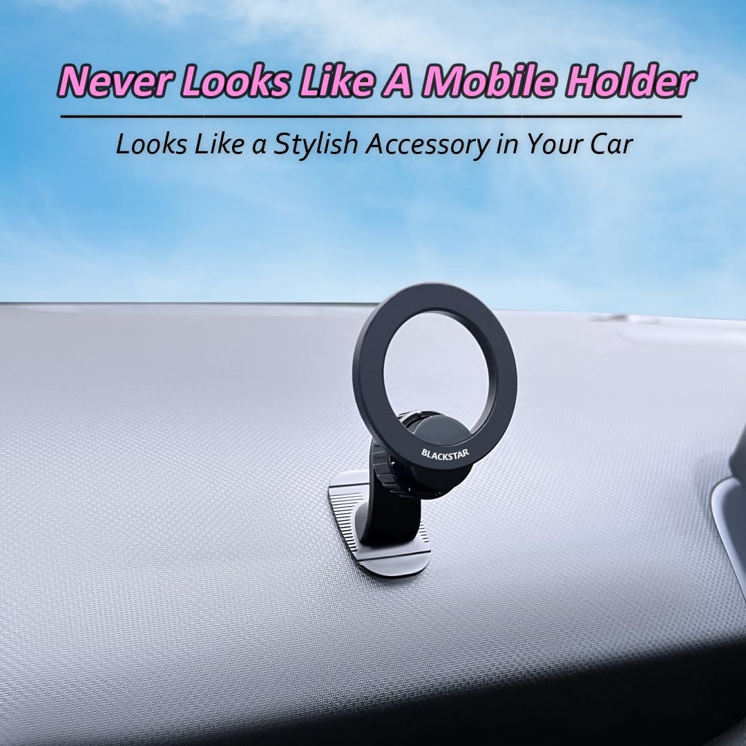 Details: Blackstar AIR-SAFE Series is Compatible Series of Magnetic Mobile Holders . This one is MagSafe Compatible Magnetic Mobile Holder for usage on DASHBOARD TOP or FRONT PART . Super Stylish Hollow Ring Design and Strong Magnetic Power - with Zero Movement and No Mobile Falling ... Just Strong Magnetic Holder Always . Why Choose This One of All of Other Blackstar Mobile Holders ? .... This is a Compatible Magnetic Mobile Holder which sticks on Dashboard Top Part or Front Part. It has Great Magnetic Force and Great 540° Angle Rotation for Comfortable Daily Usage in Car . One Hand Use Makes it Buttery Smooth to use in Car while Driving . Its Compact Size helps Keep Car Dashboard Clean and it's Stylish Design Enhances Elegance of Your Car's Dashboard ... Not Like Big Plastic Traditional Non-Magnetic Mobile Holders which cover Huge Part of Dashboard in Car and Make it Looks Ugly . And its Unlike Other Magnetic Mobile Holders - Which Make Big Promises and Fail during Actual Use Dimensions of the Product :- Magnetic Top Head : 5.8cm x 6.6cm Height ( Base to Top ) : 9.5cm Bottom Base : 5cm x 3.3cm Weight - 33 grams