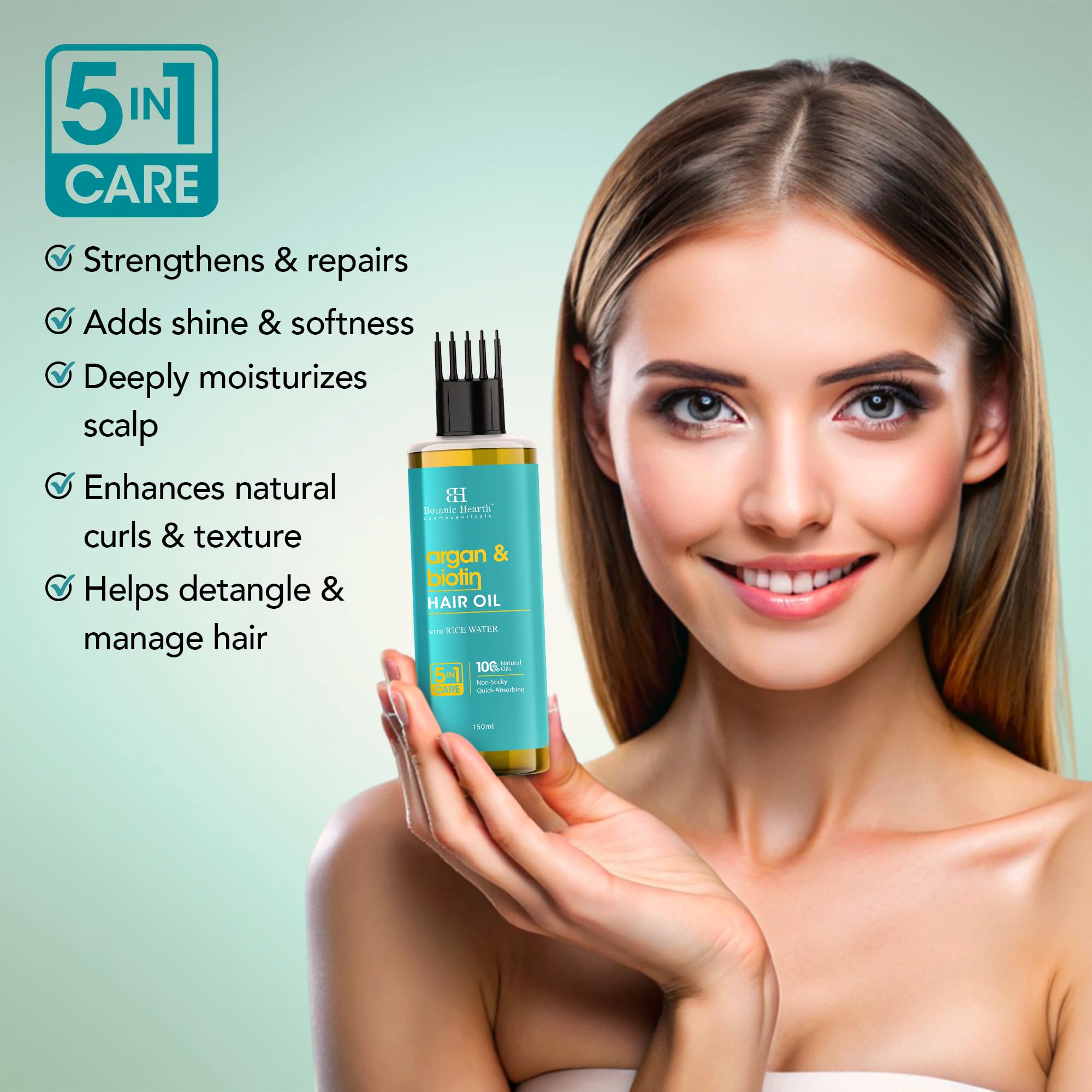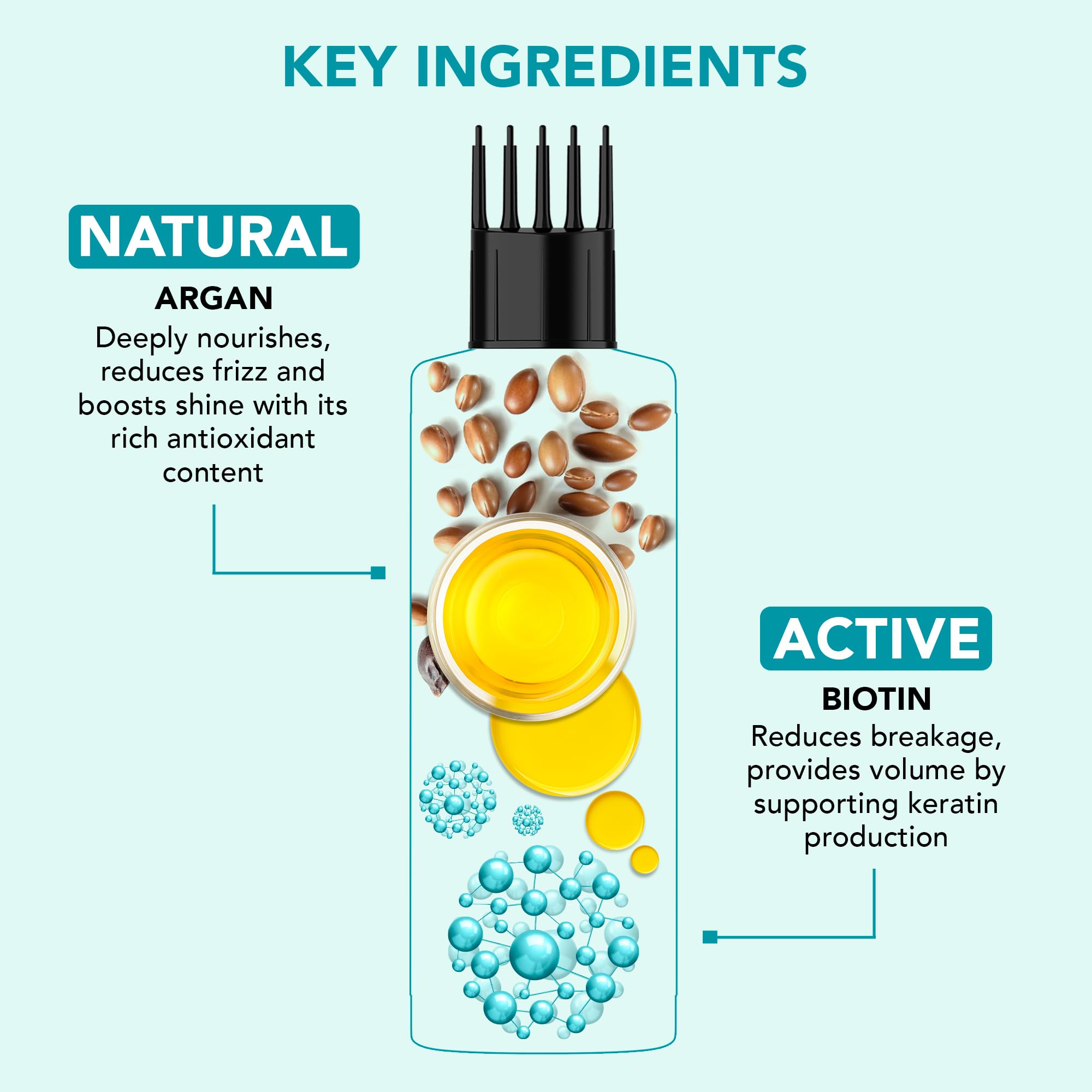 Comb Applicator: The Argan & Biotin Hair Oil for hair growth comes with hair oil applicators like comb to evenly distribute oil and smoothen knots & frizzes, making the application process effortless