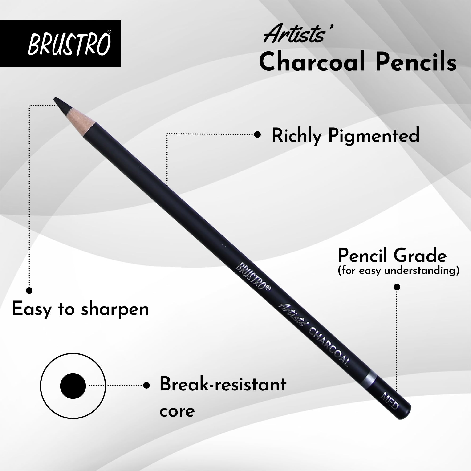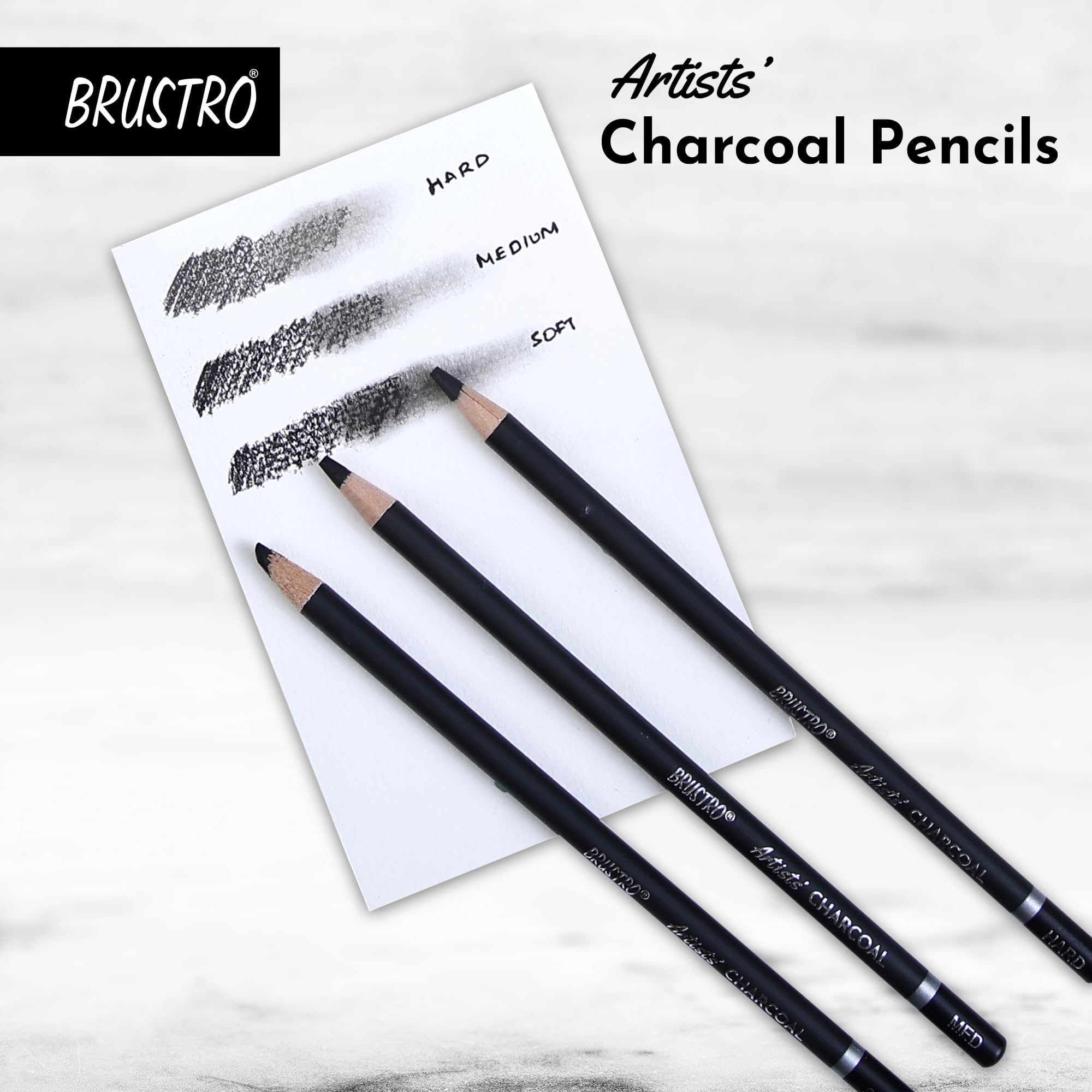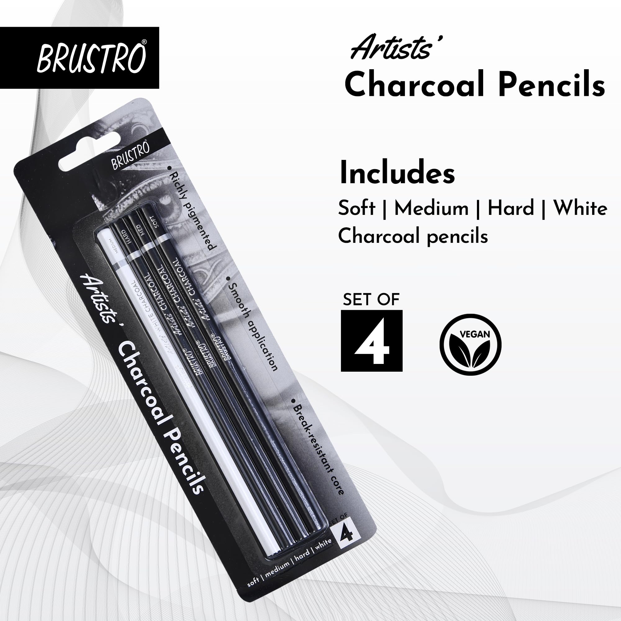 BRUSTRO Artists Charcoal Pencil - Set of 4 (3 Black Shade - Soft, Medium, Hard and 1 White - Medium) | Ideal for Drawing, Shading, Coloring, Sketching, Artwork, Portrait, Landscape, Smooth Blending