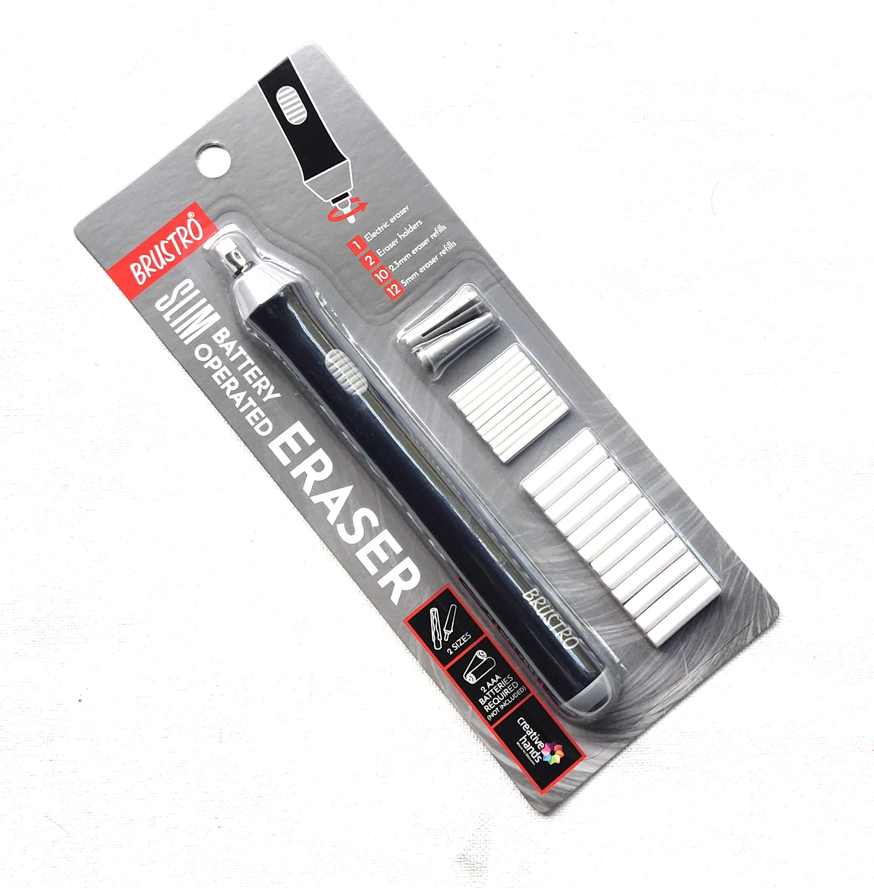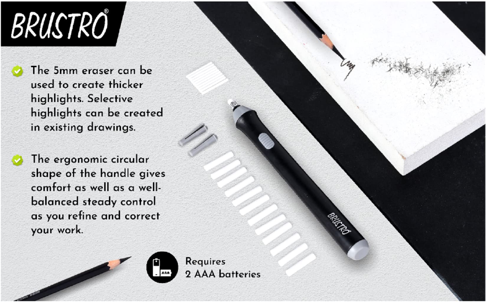 User-Friendly Design: Lightweight and easy to handle, designed for comfortable use during long art sessions.Durable and Reliable: High-quality erasers that remove pencil marks cleanly without damaging the paper.Batteries Not Included: Requires 2 AAA batteries (not included) for operation, ensuring you can start using it right away.