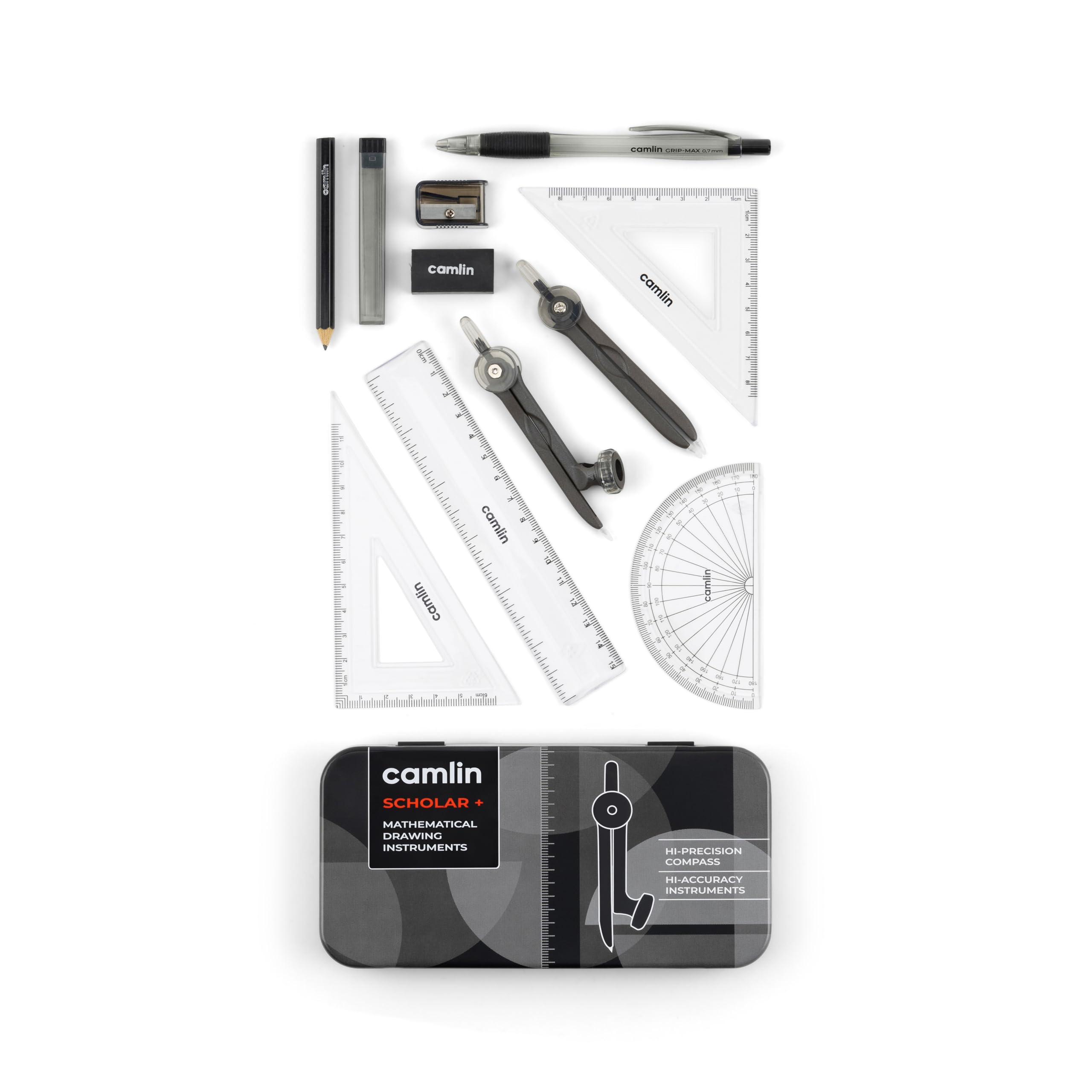 - Pack Contents - 1N Self centering compass, 1N Protractor 180, 1N Set square 45, 1N Set square 60, 1N Divider, 1N Pencil, 1N Eraser, 1N Sharpener, 1N Scale 15cm, 1N 0.7mm Mech Pencil 1N Lead box 0.7mm