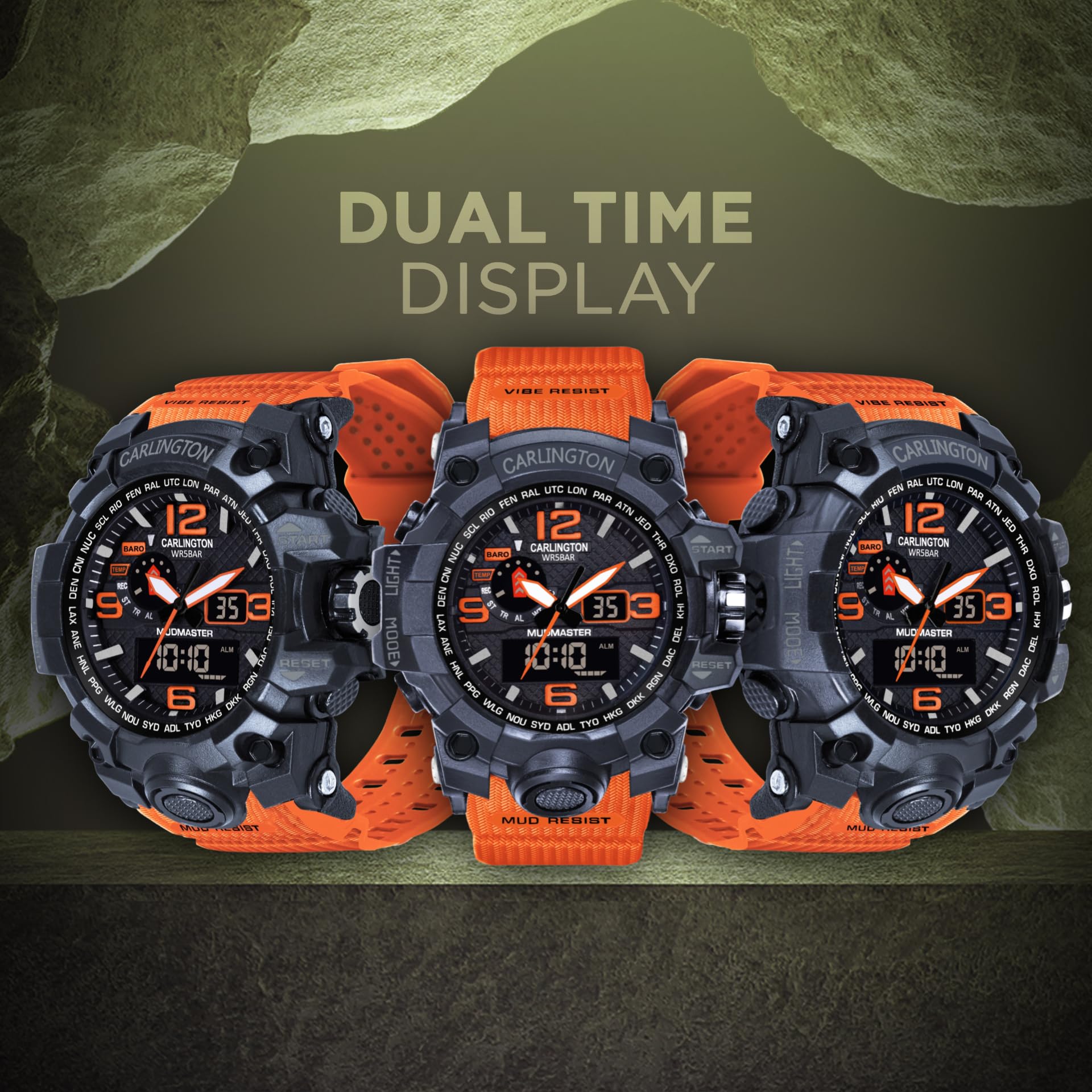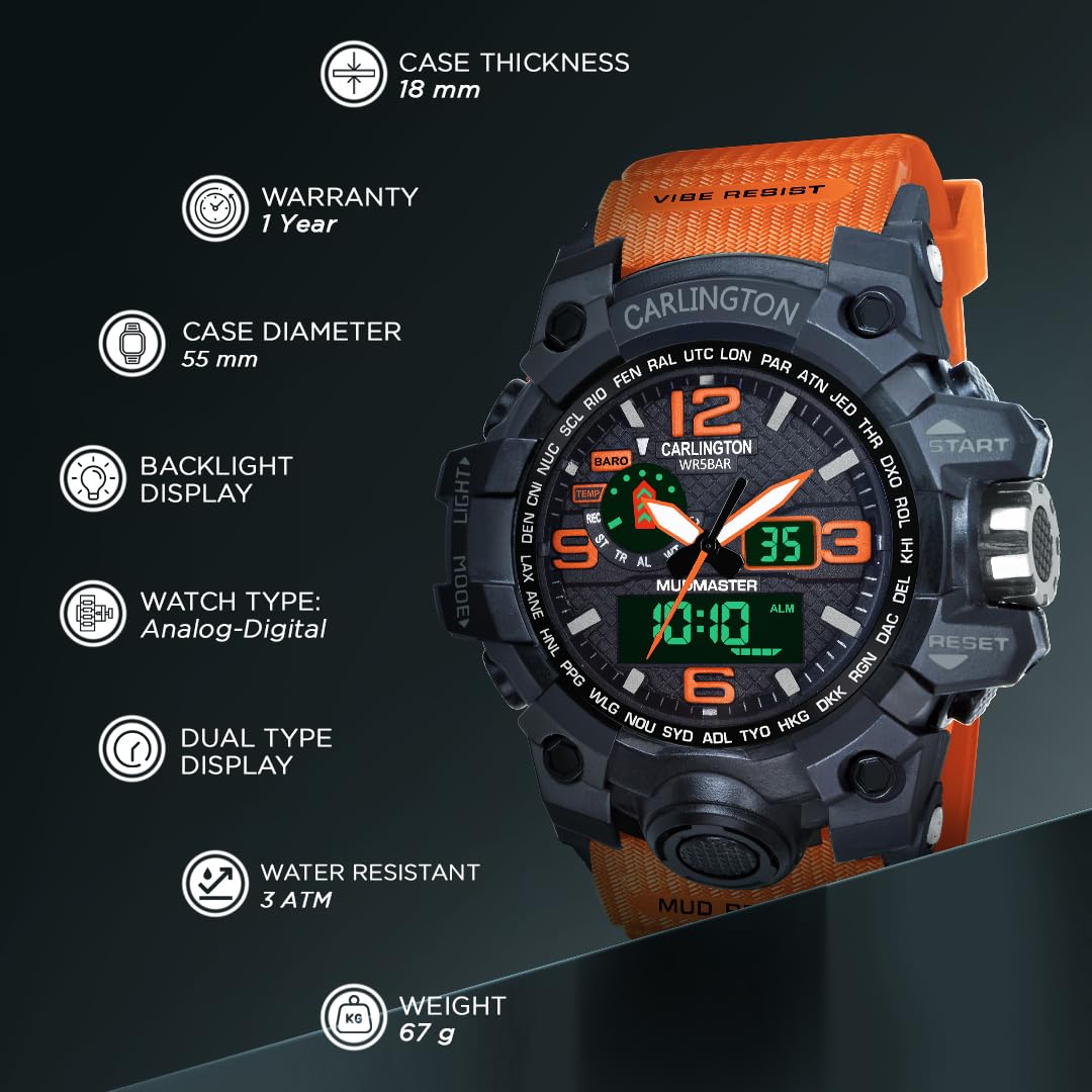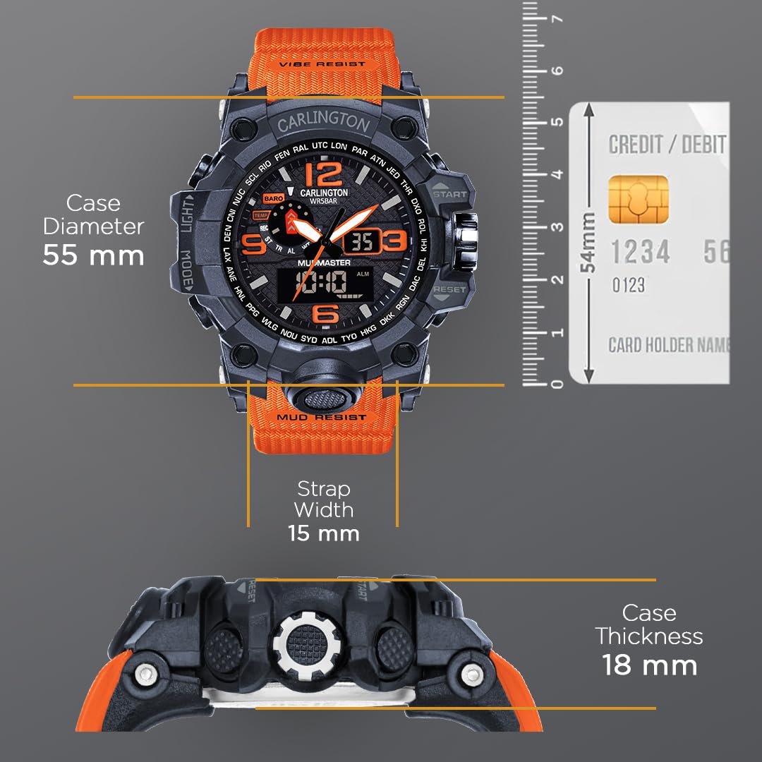 MEASUREMENTS - This analog-digital watch with a 55 mm diameter, protected by scratch-resistant mineral glass. It weighs around 67 g and has a 3-hand analog quartz movement. The strap provides a comfortable fit for everyday wear.