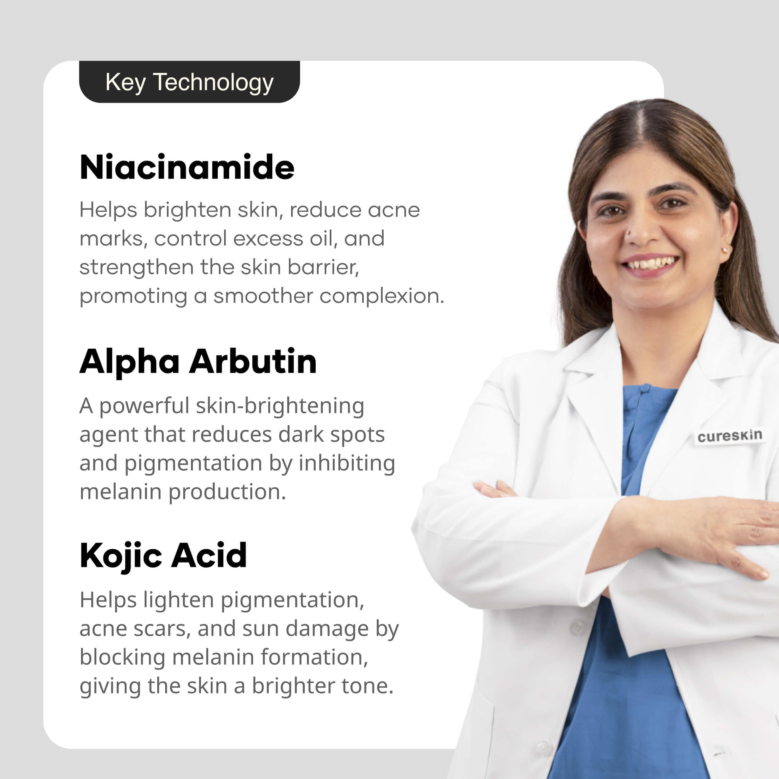 Targets Pigmentation & Dark Spots: Kojic Acid and Alpha Arbutin work together to help visibly reduce pigmentation, dark patches, and age spots by regulating melanin production.