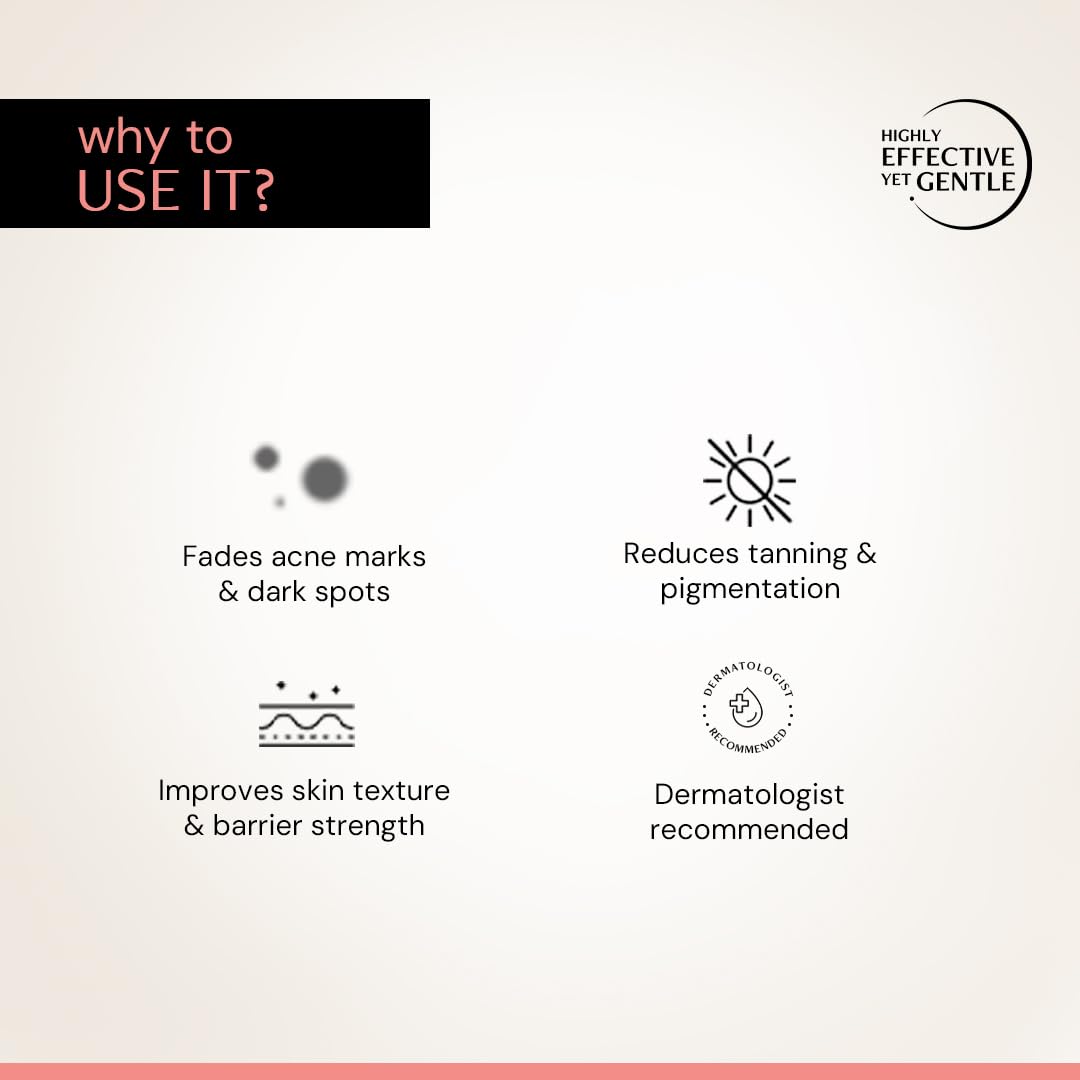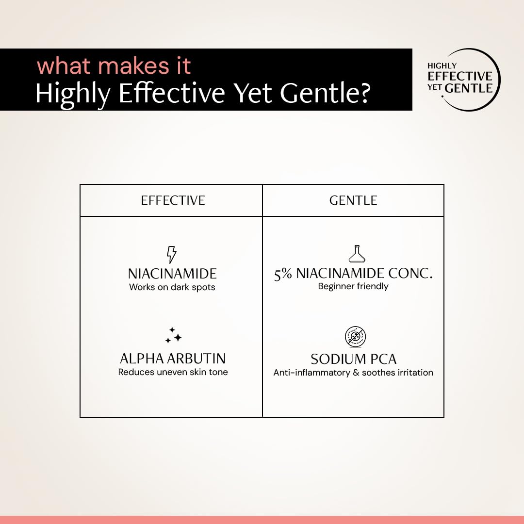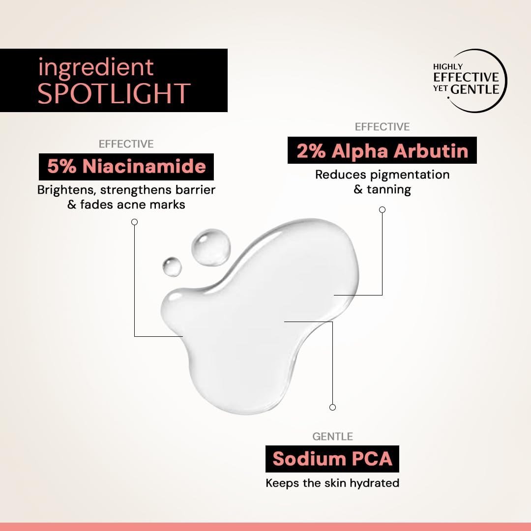 REDUCES PIGMENTATION, DARK SPOTS & ACNE MARKS: A powerful combination of 5% Niacinamide and 2% Alpha Arbutin, this multi-benefit serum helps reduce melanin production, effectively minimizing dark spots, hyperpigmentation, post-acne marks, tanning, and uneven skin tone.