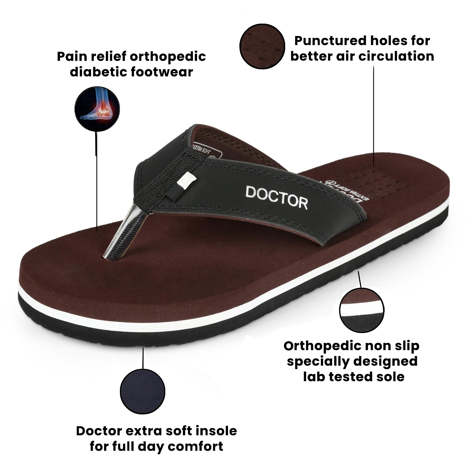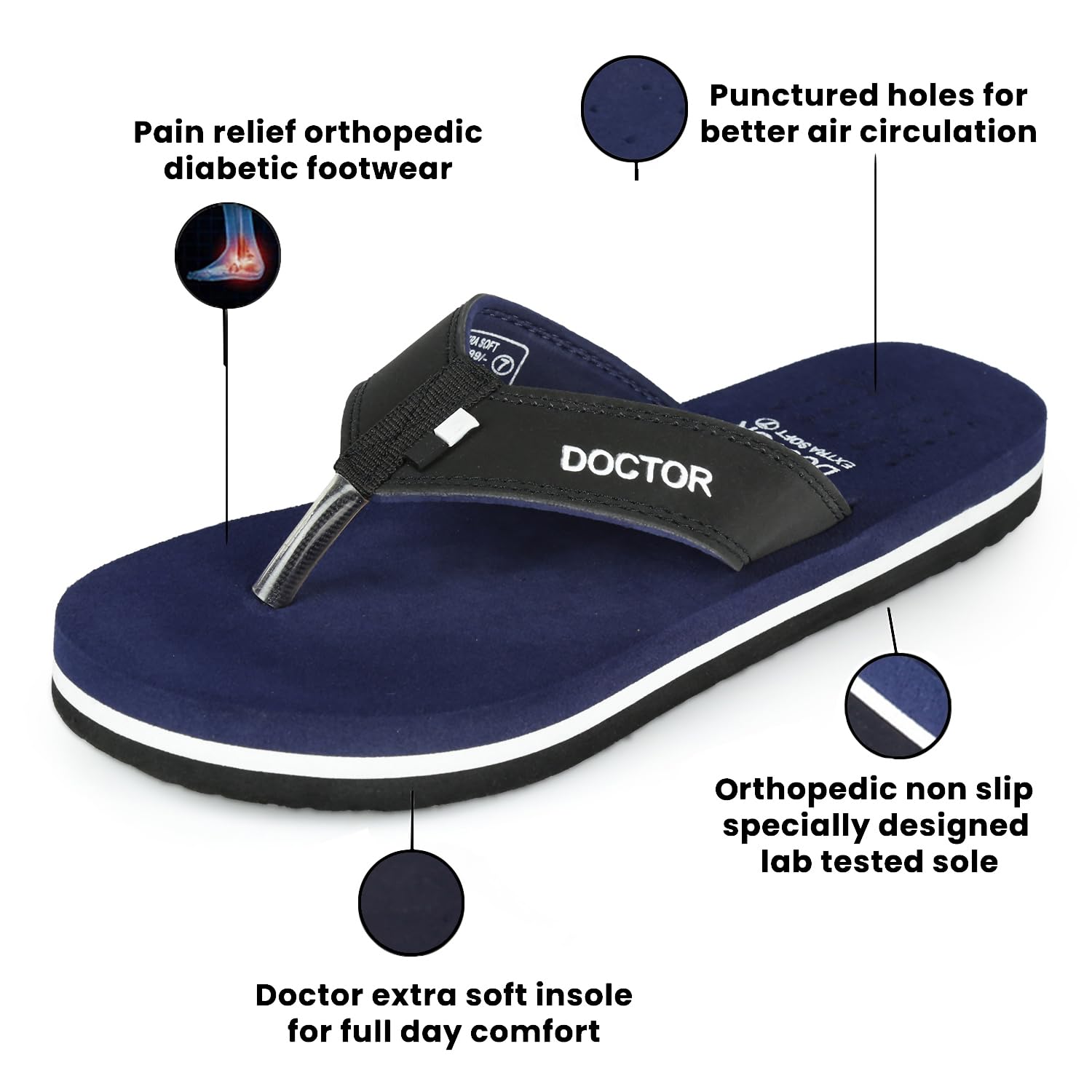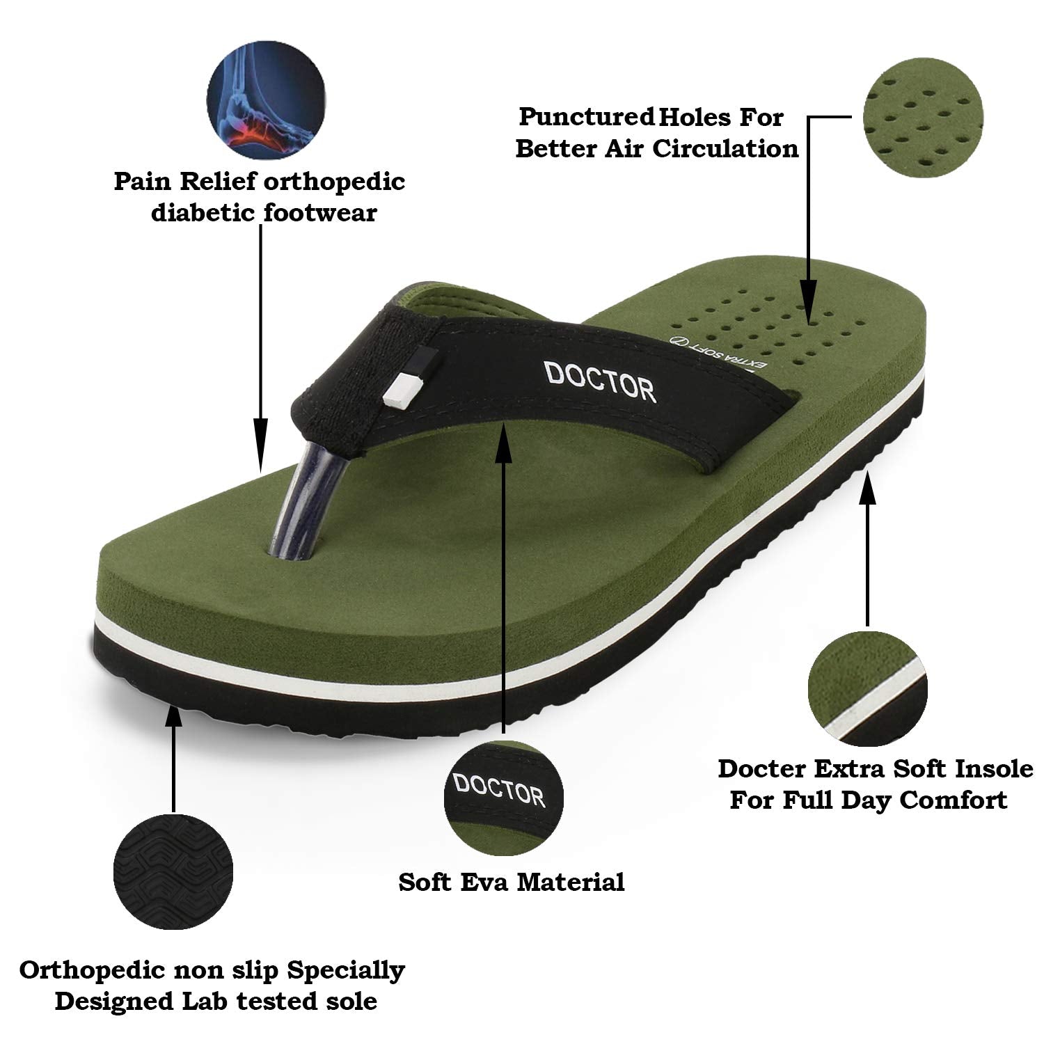 DIABETIC AND ORTHOPEDIC:: - Extra Soft, Padded, Comfortable and Cushioned Foot-Bed Enhances Comfort to the Feet.. Doctor Extra Soft Slipper Provides You Better Walking Comfort and also makes you’re Walking Life easy and effortlessly..; ANTI-SKID AND ADJUSTABLE VELCRO:: - Good Rubber Grip Enables You to Use These Slippers on Wet Floors, Tiles, Marbles, Etc.. This Rubber Sole Is Long Lasting and Provides Uninterrupted Daily Usage..