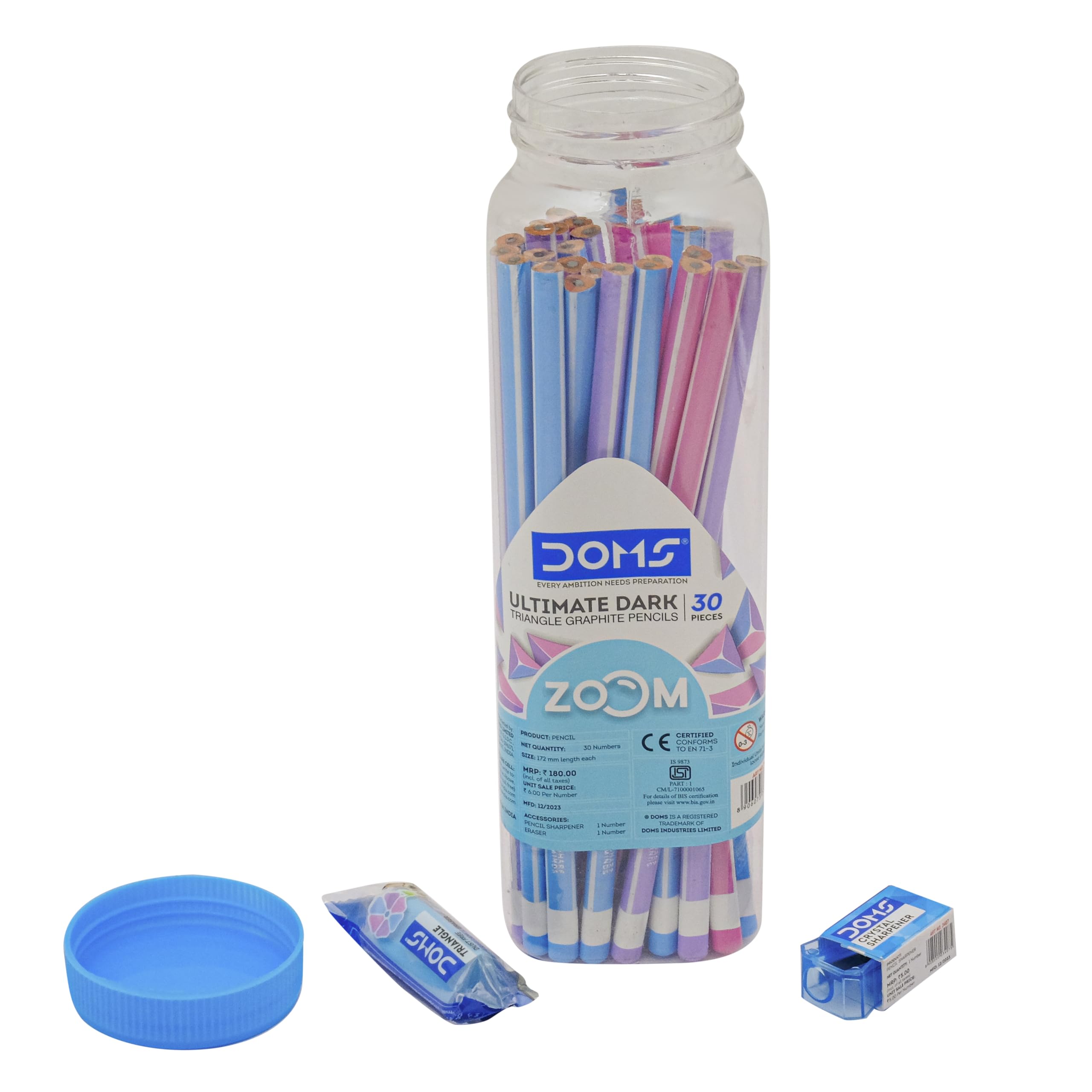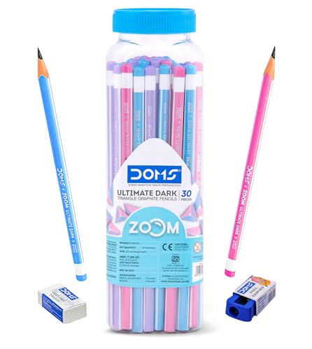 DOMS Zoom Ultimate Dark Triangle Pencil | Jar Pack, 30 Pieces | Contains Pencils, Sharpener, Eraser Multicoloured, Pack Of 1 (DM7274)
