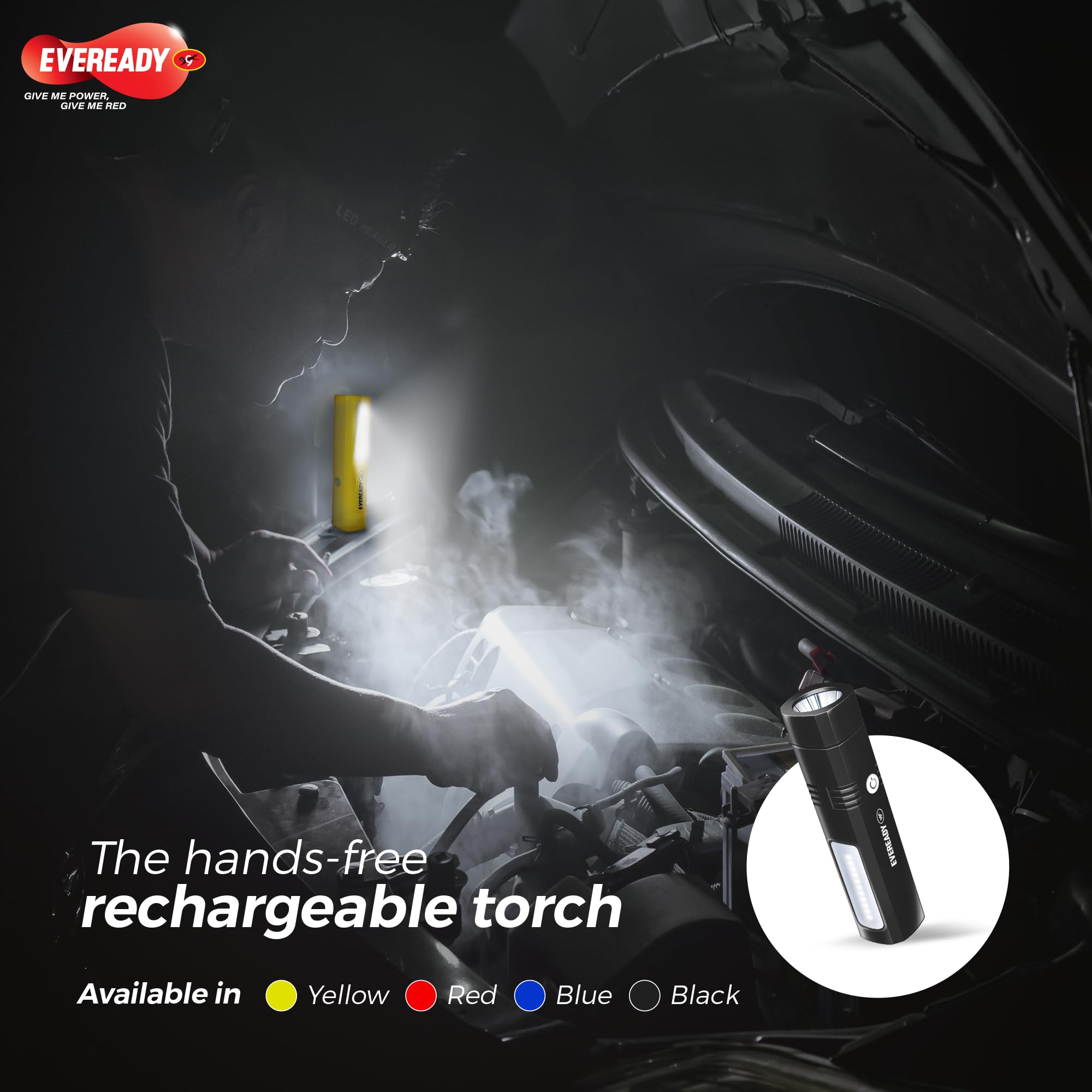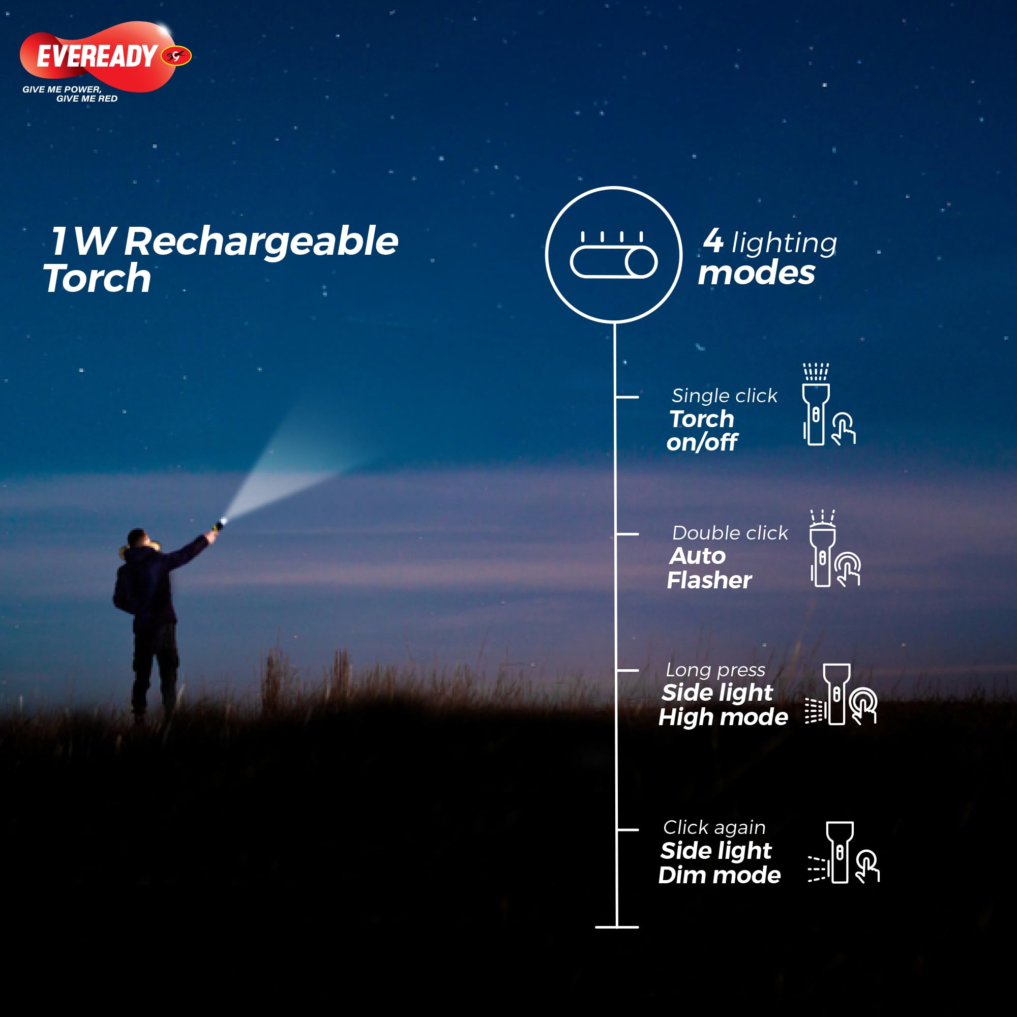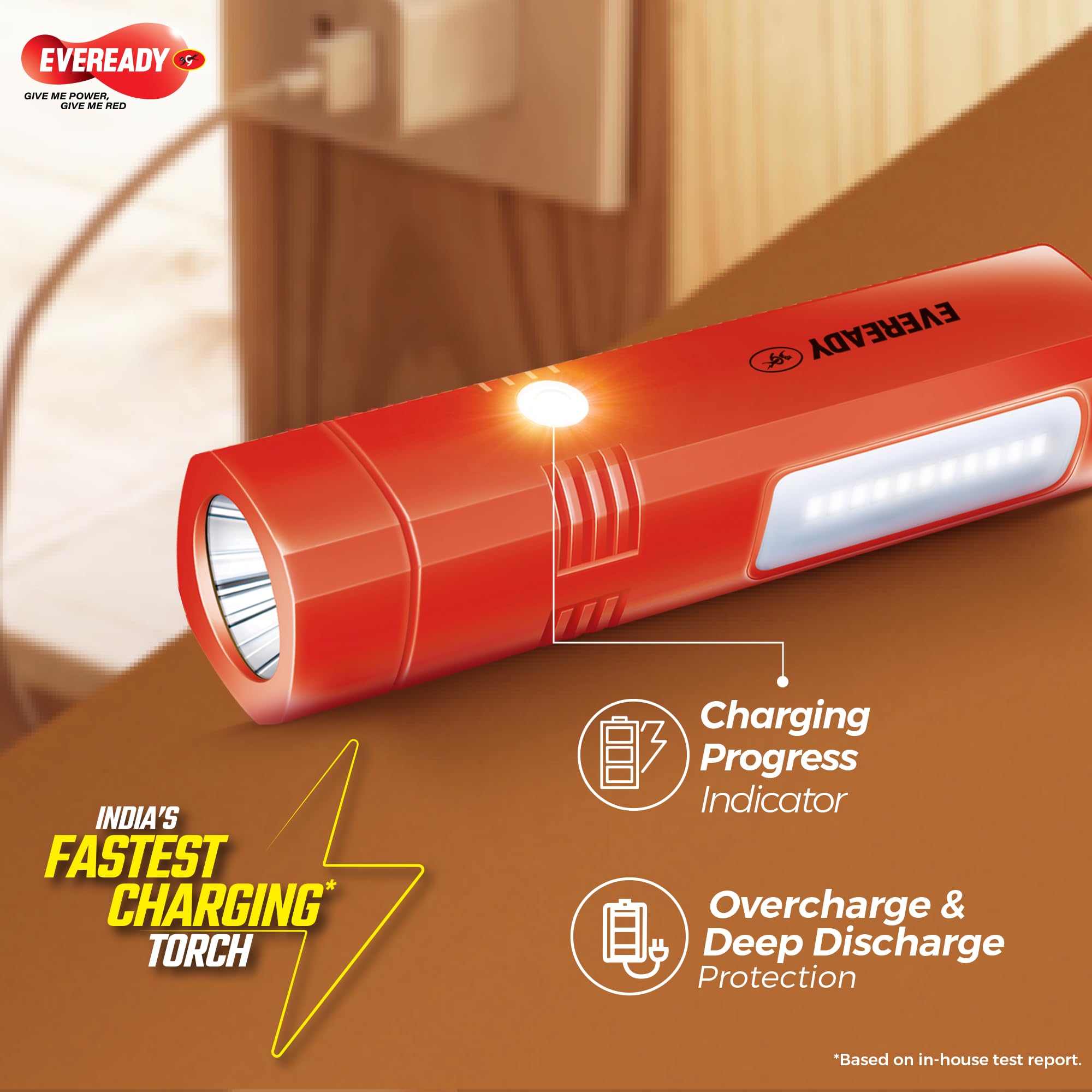 Eveready Hero DL80, Rechargeable 1W LED Torch Cum Emergency 2W Sidelight, Type-B/Micro-USB Fast Charging, Overcharge & Deep Discharge Protection, Powered by Li-Ion Battery