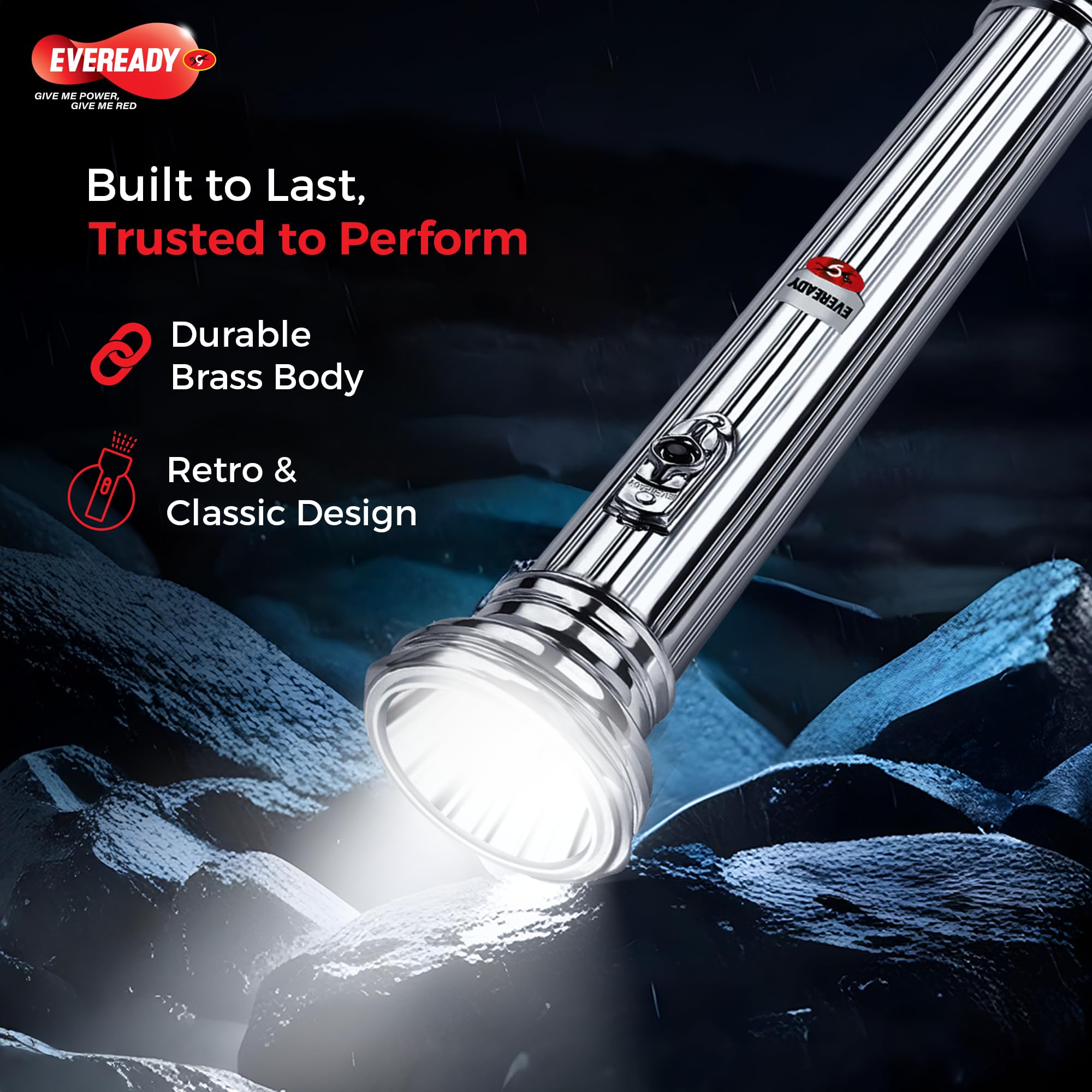 CLASSIC RETRO DESIGN: Combining a vintage brass finish with a functional, easy-to-carry grip design, this torch reflects Eveready’s legacy of over 100 years in quality torch manufacturing—built on innovation, durability, and a commitment to sustainability.