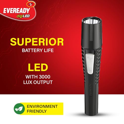 Eveready Led Torch Light | DIGILED DL42 | Super Bright White LED | 3000 LUX |Bright Flashlights for Emergencies and Camping Gear | Flash Light with AA Batteries Included |Black