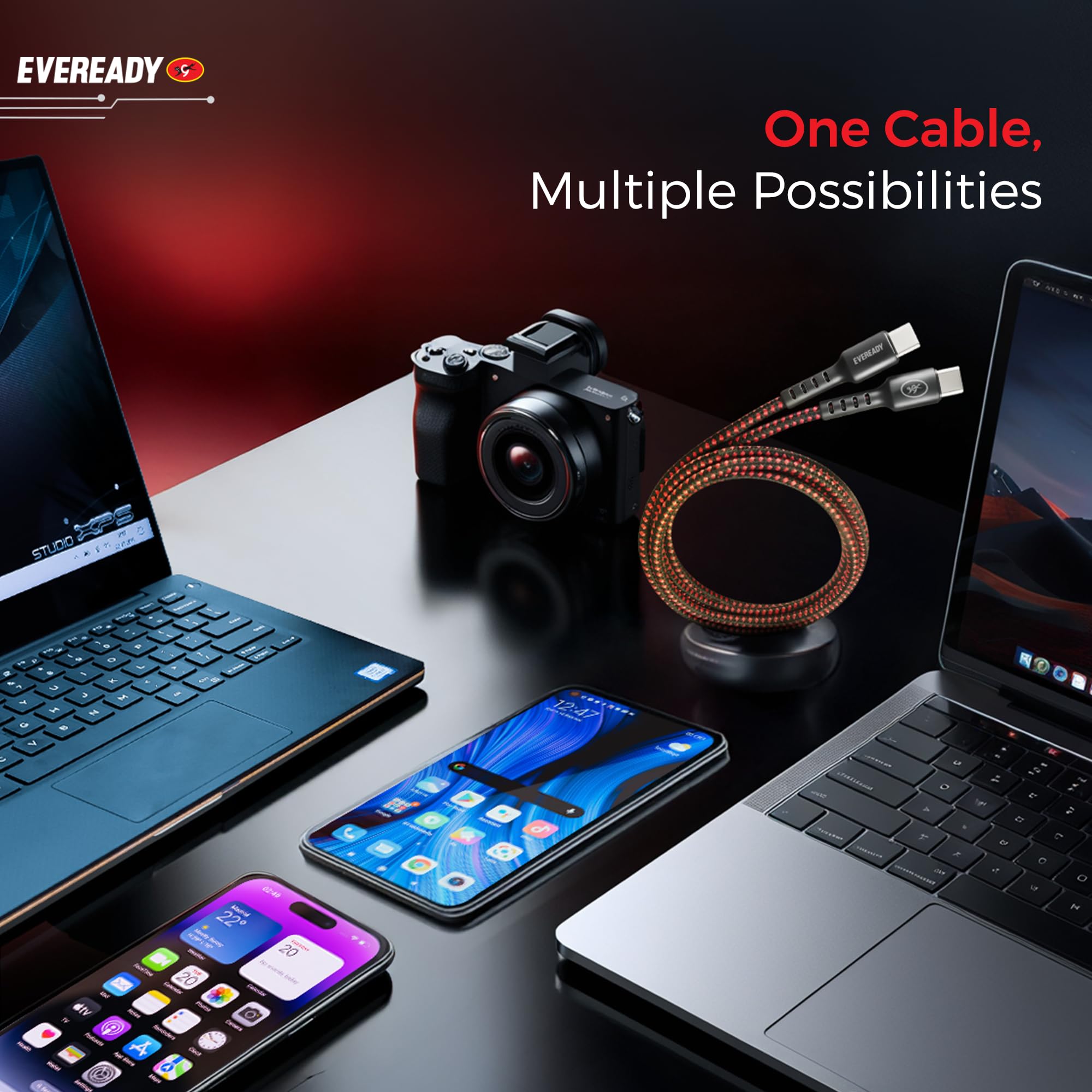 Eveready Nylon Braided Charging Cable, Type-C to Type-C 3A, 1.5m Universally Compatible Premium Braided Cable with Data Transfer, USB 2.0 Compatibility, Tangle-Free Flexible Design with Bend Protector