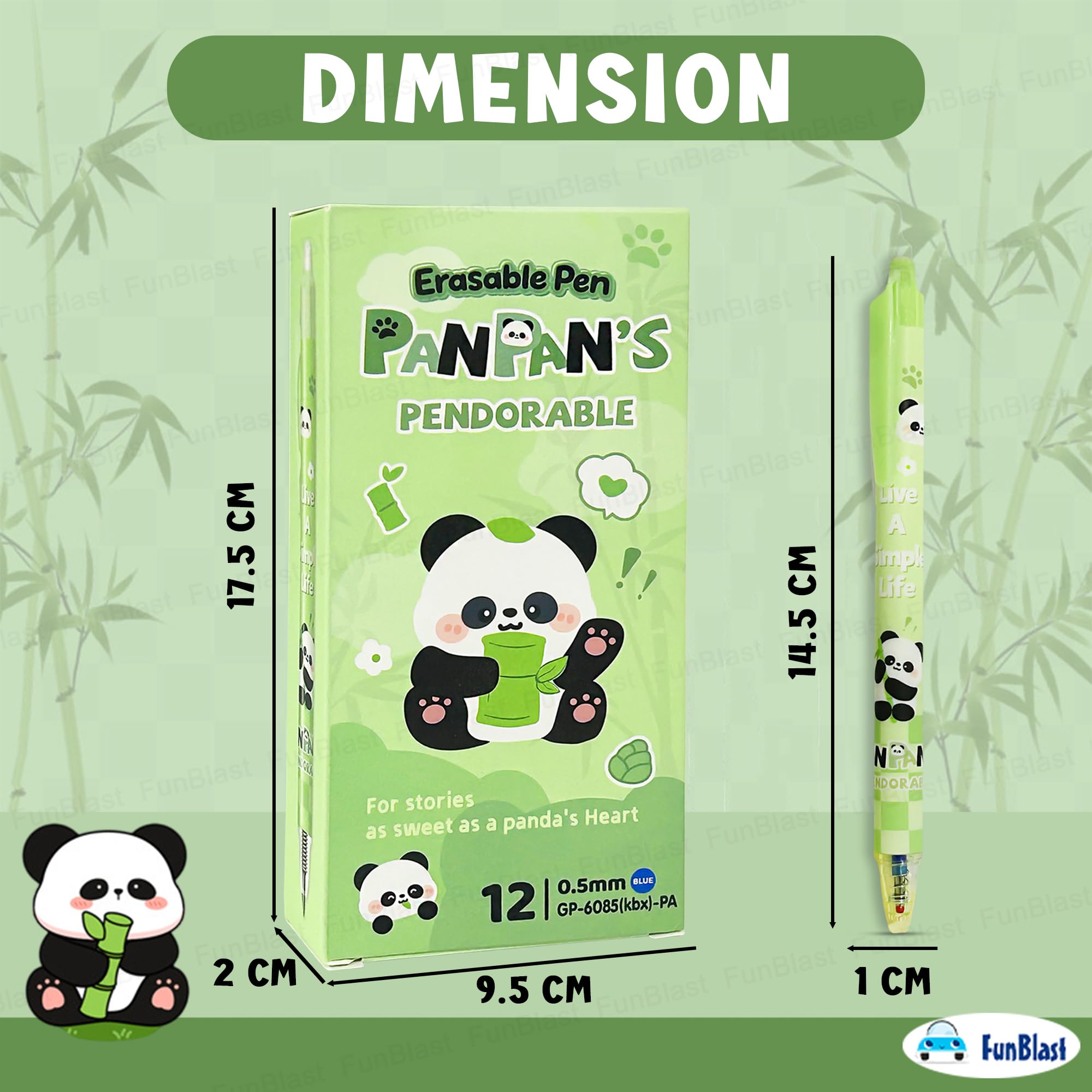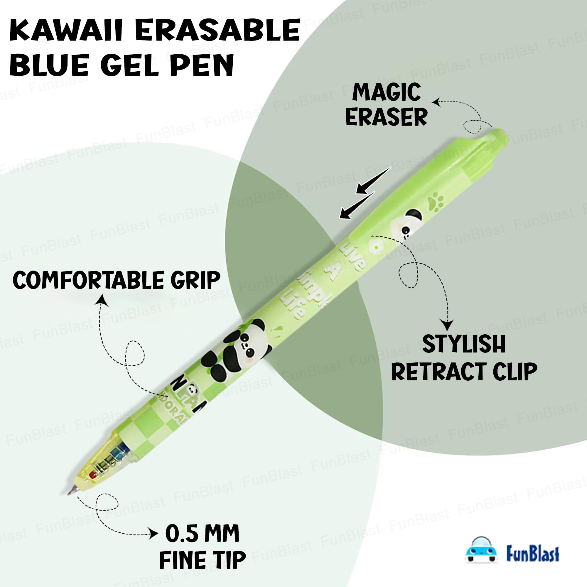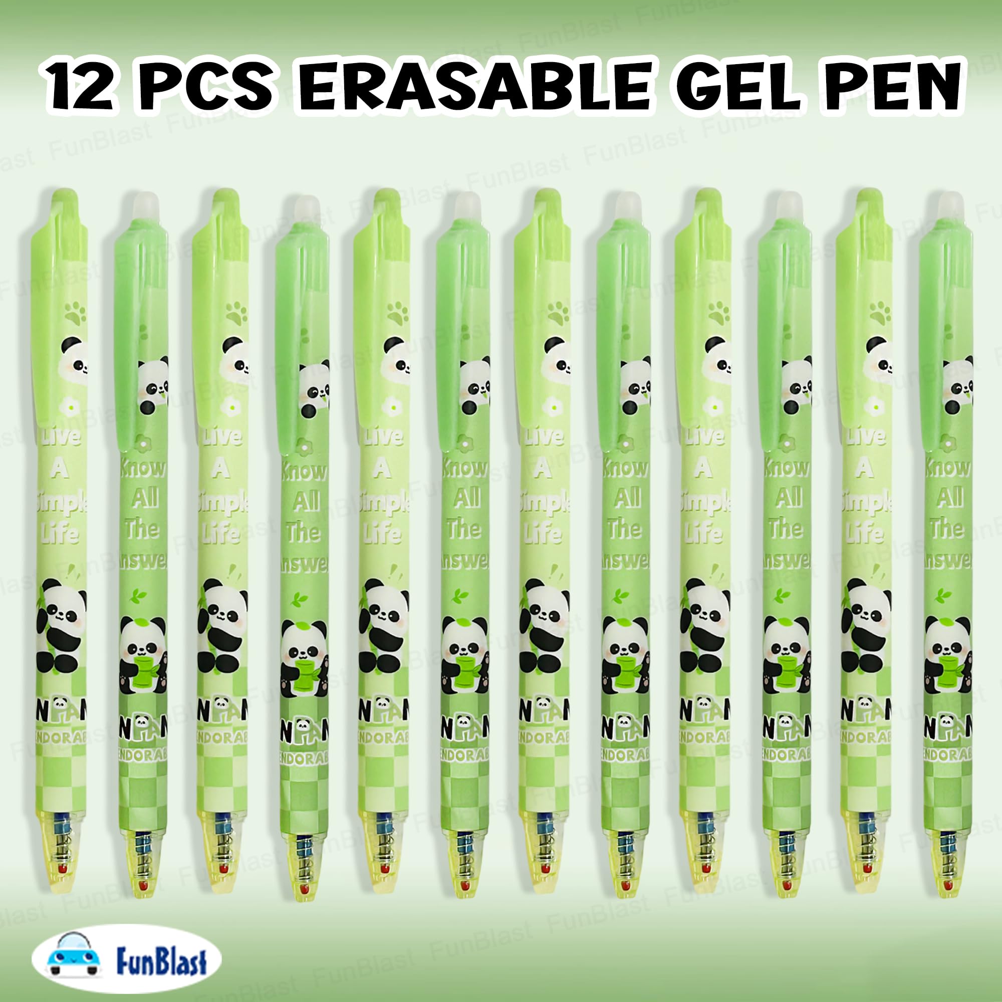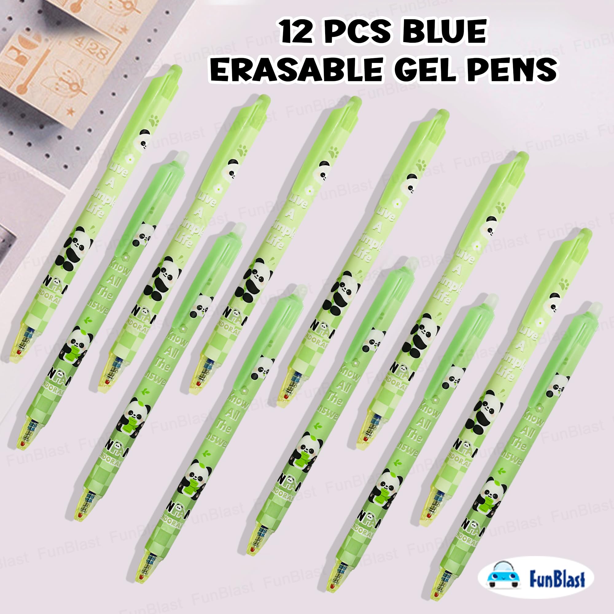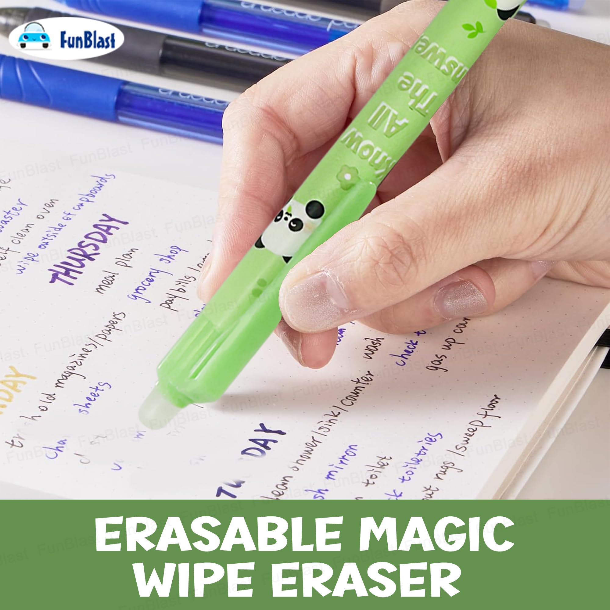 Details: Pen Set for Kids – Package includes 12 pcs of erasable gel pen set – Blue ink – Point size 0.5 mm Pen for Birthday Gift – Gel pen is made of nontoxic material and well-constructed, write smoothly and won’t smudge with erasable magic wipe eraser tip Best Gel Pens for Smooth Writing – FunBlast gel pen is lightweight, Slim design & easy grip which makes it perfect for long hours of writing Pens for Students and Professionals – Fits well in the barrel of the pen and does not move with the core of the pen. The ink of the ball pen is specially made; it is lightfast, water-resistant, waterproof, etc. Best Stationery Gift Set – This gel pen can be considered as a best gift for kids and adults, also can be gifted on return gifts, party favor