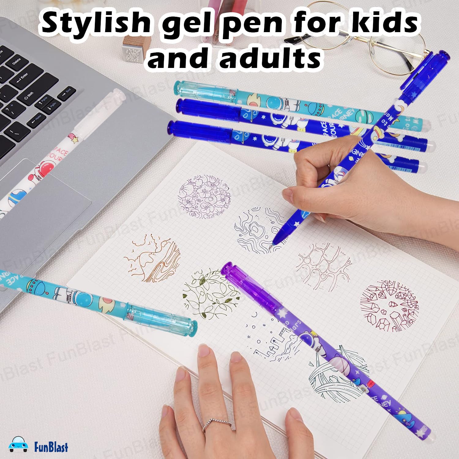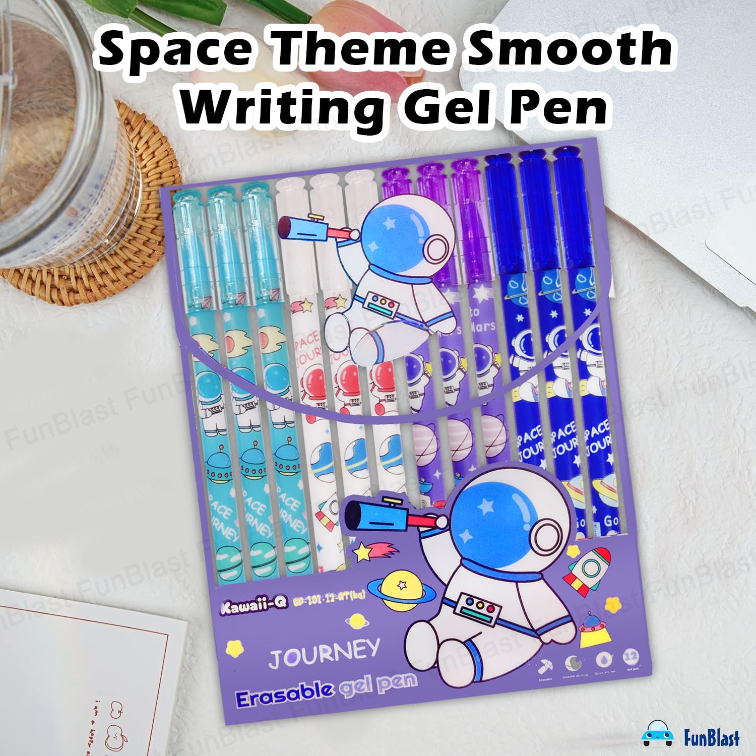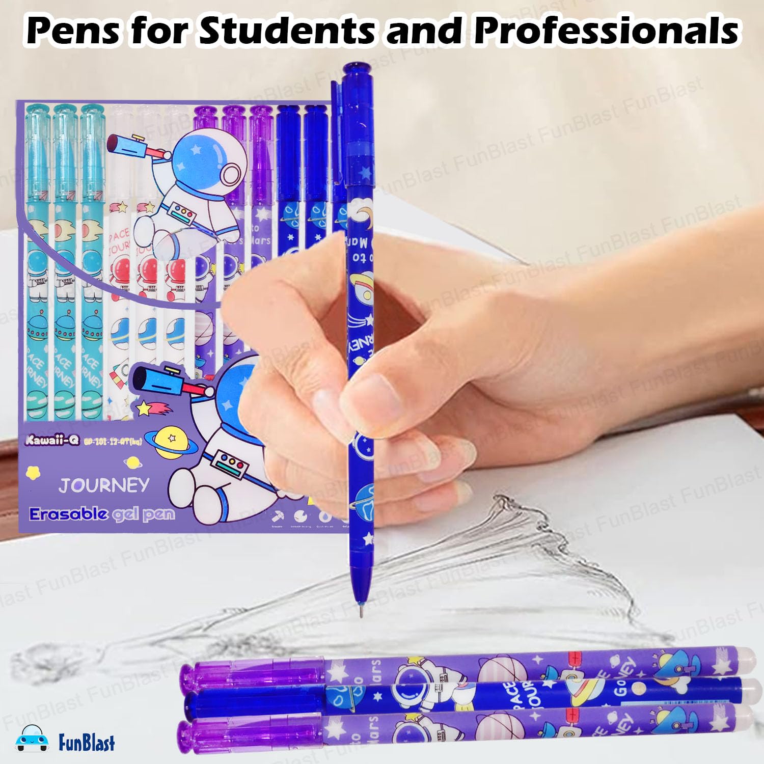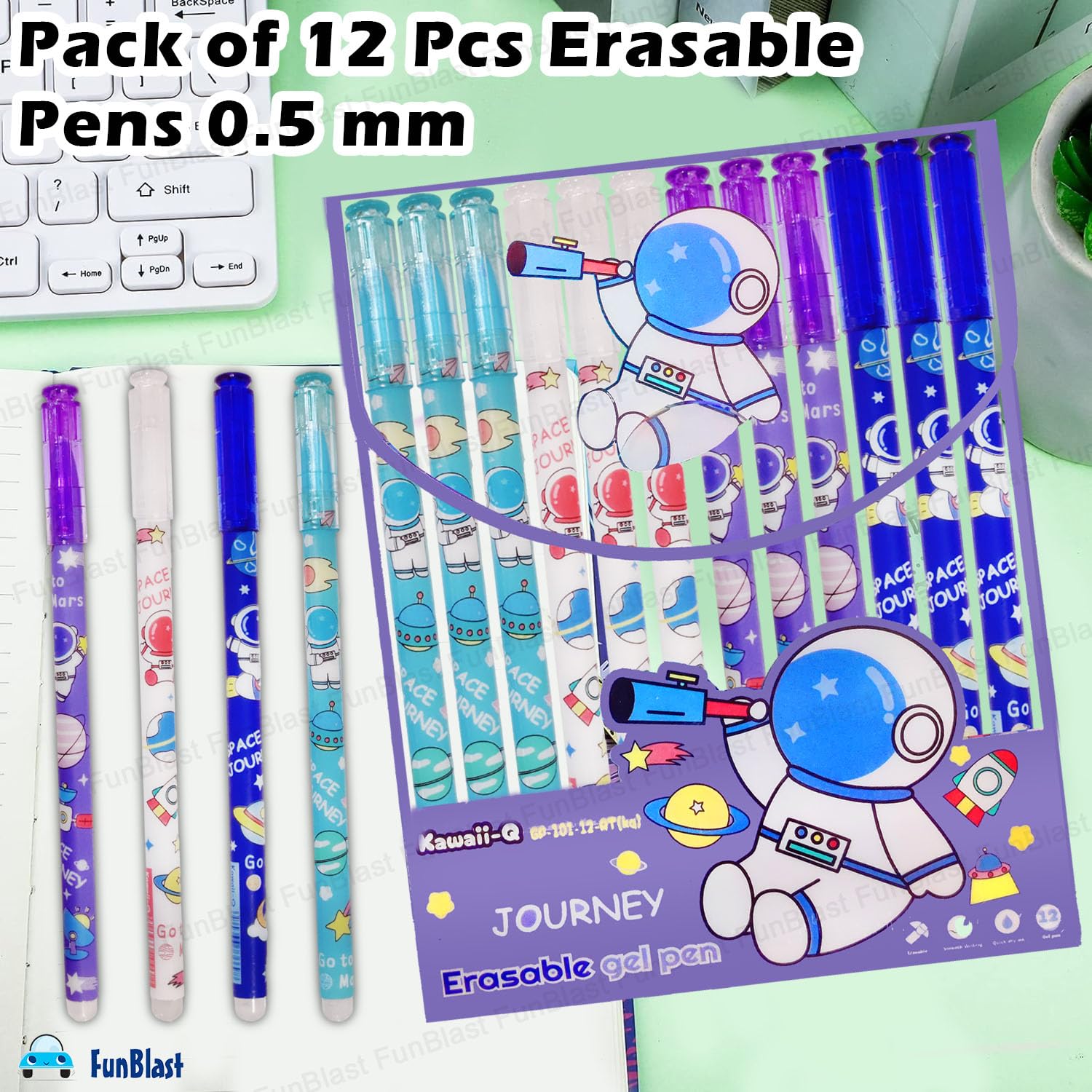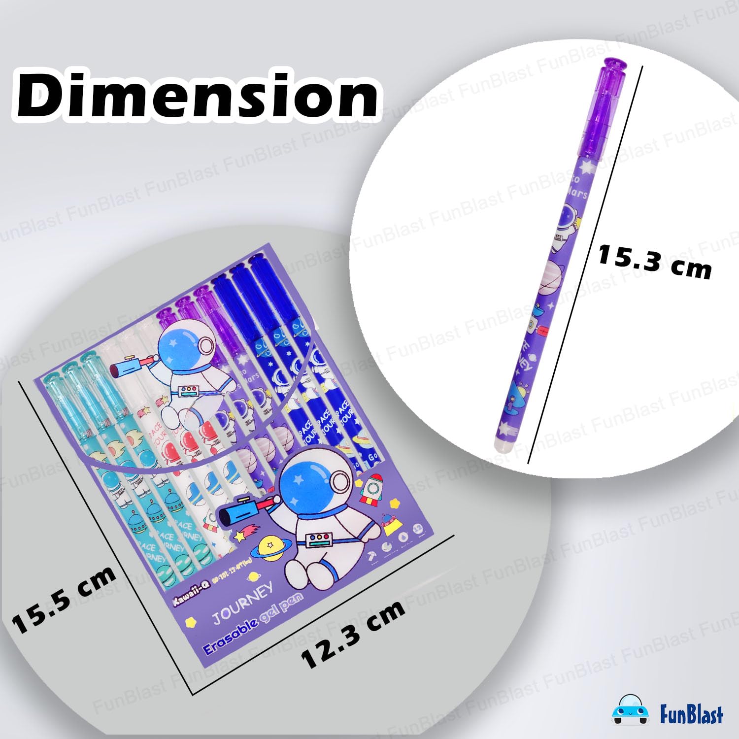 FunBlast Erasable Gel Pens, Pack of 12 Pcs Erasable Pens 0.5 mm, Space Theme Smooth Writing Gel Pen, Pen with Magic Eraser, Birthday Return Gifts for Kids - Blue Ink