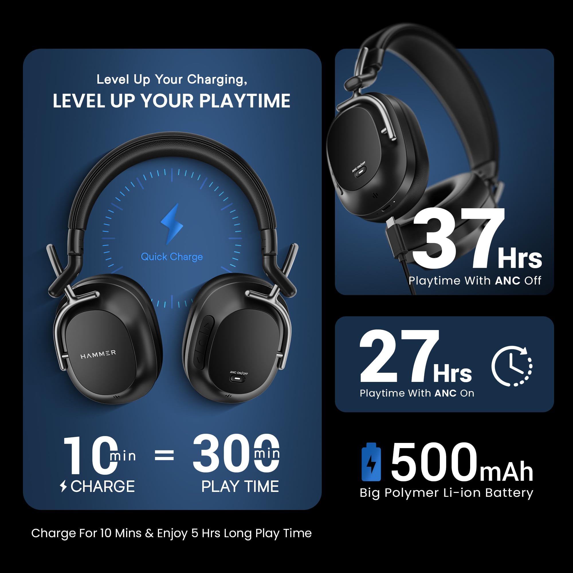 Hammer Headphones with Enhanced Battery Life: Immerse in your favorite tunes with our Bash Pro hammer headphones. Featuring Type C fast charging and Bluetooth V5.3, they offer an impressive 37hrs playtime. Adjustable and foldable, they are the perfect noise cancellation headphones.