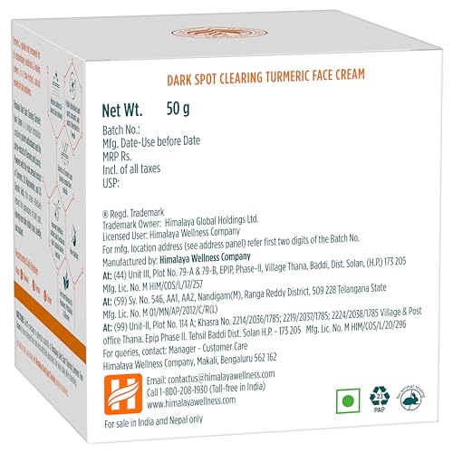 Details: Himalaya Dark Spot Clearing Turmeric Face Cream is a daily cream specifically designed for spot/blemish-prone skin to help reduce the spots. It contains Phyto-Vitamin complex that combines the goodness of cold pressed Organic Turmeric, Licorice, VitaminB3 (Niacinamide) and Glycolic acid that helps reveal the skins natural glow. This non-sticky and fast absorbing cream helps clear/reduce the dark spots, improve uneven skin tone, and amplify the skin’s natural luminosity leaving skin beautifully bright and radiant.