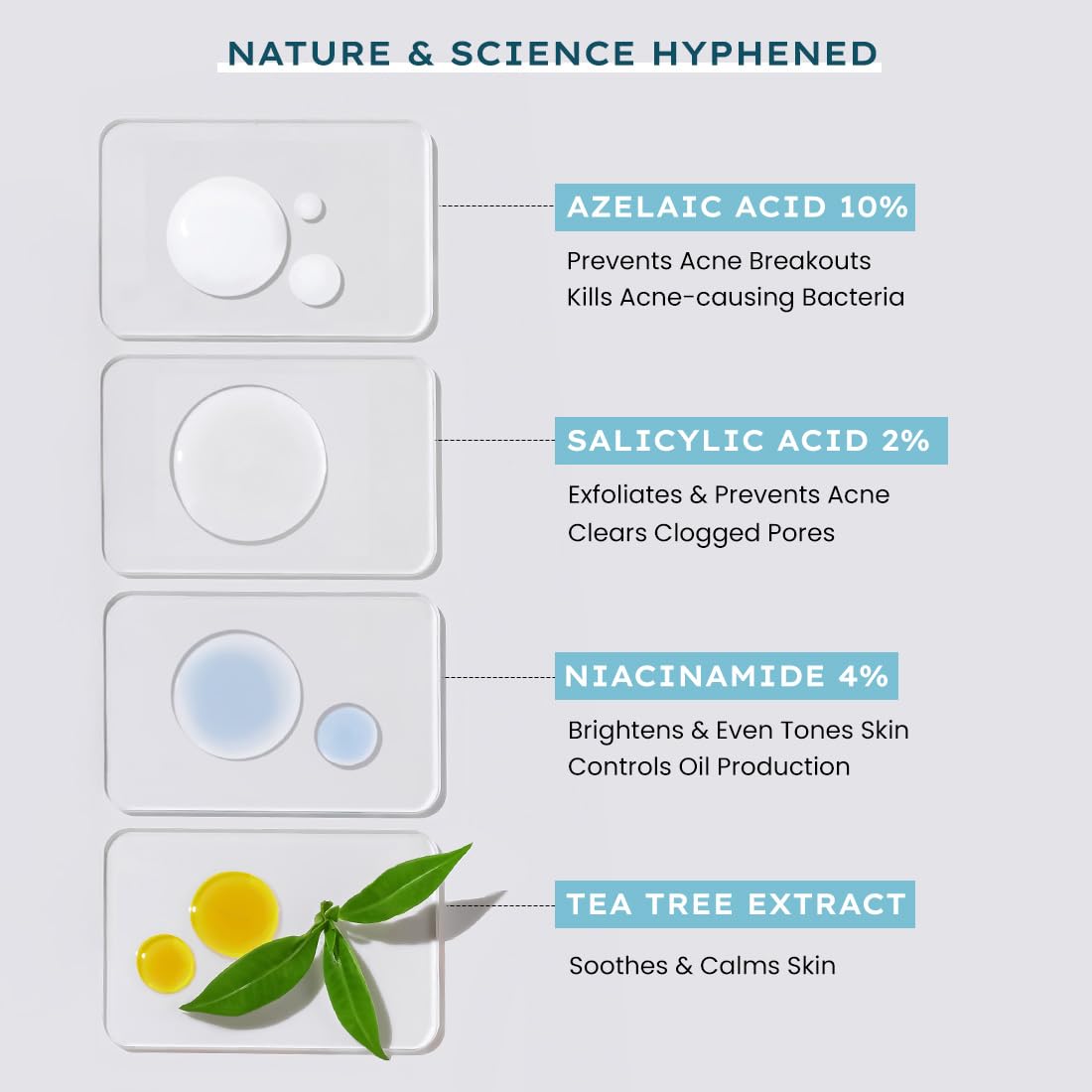 CONTROL OIL, CALM & SOOTHE REDNESS: Niacinamide 4% controls oil production and smoothens the skin. Tea Tree Extract soothes redness, swelling, and inflammation.