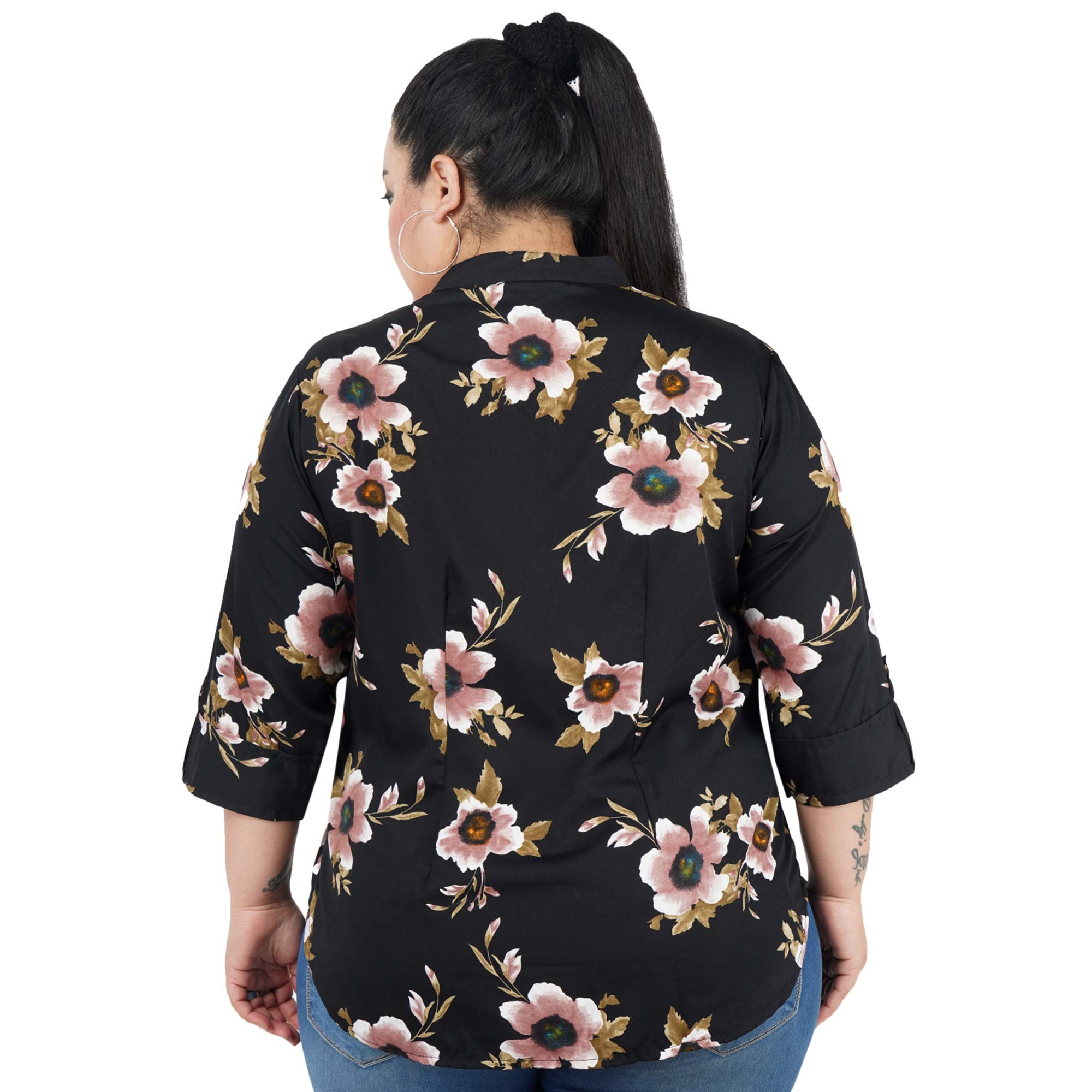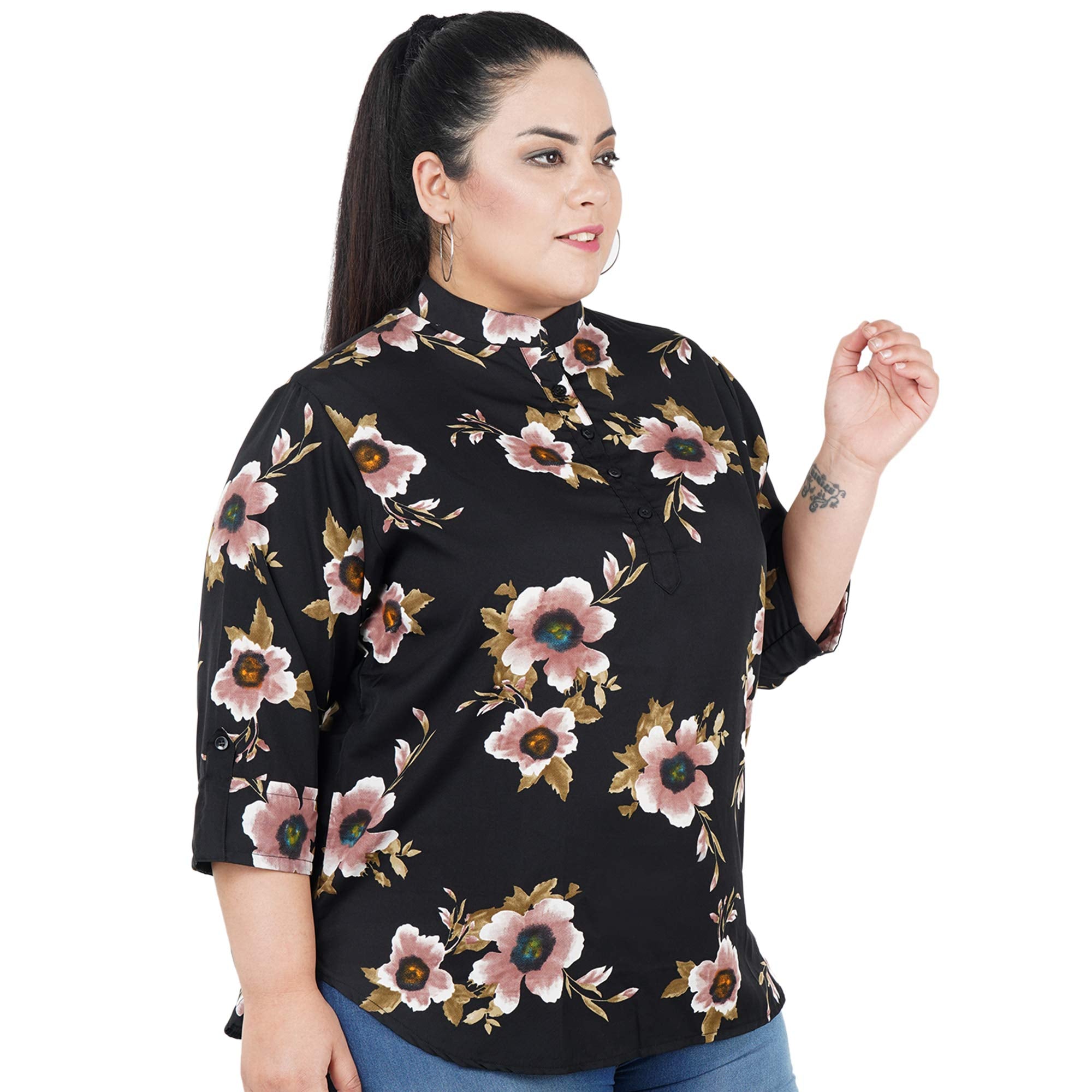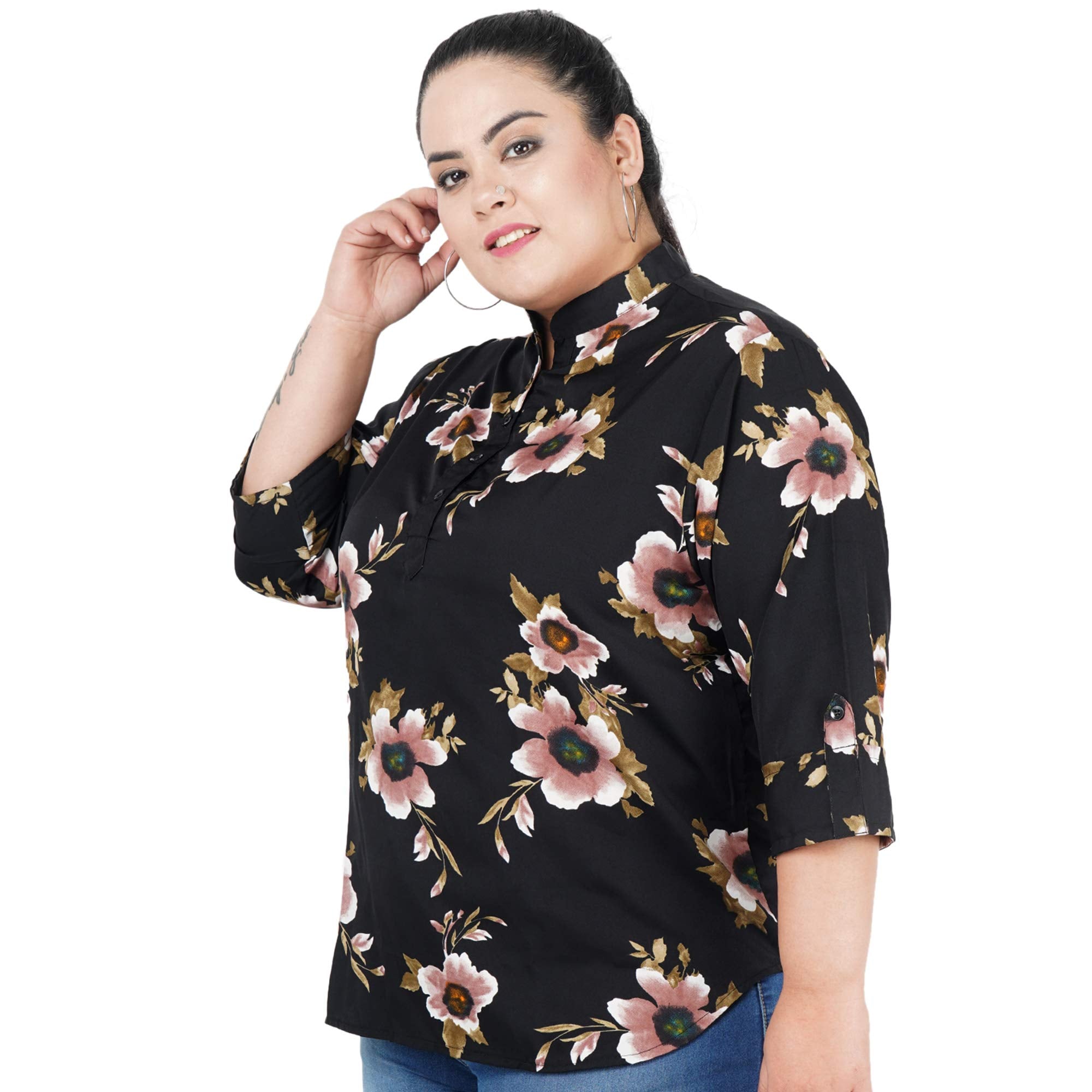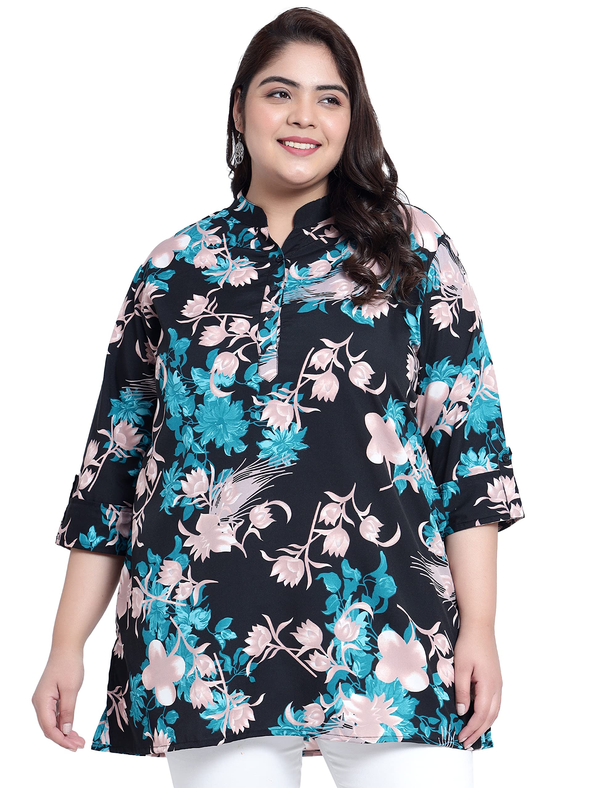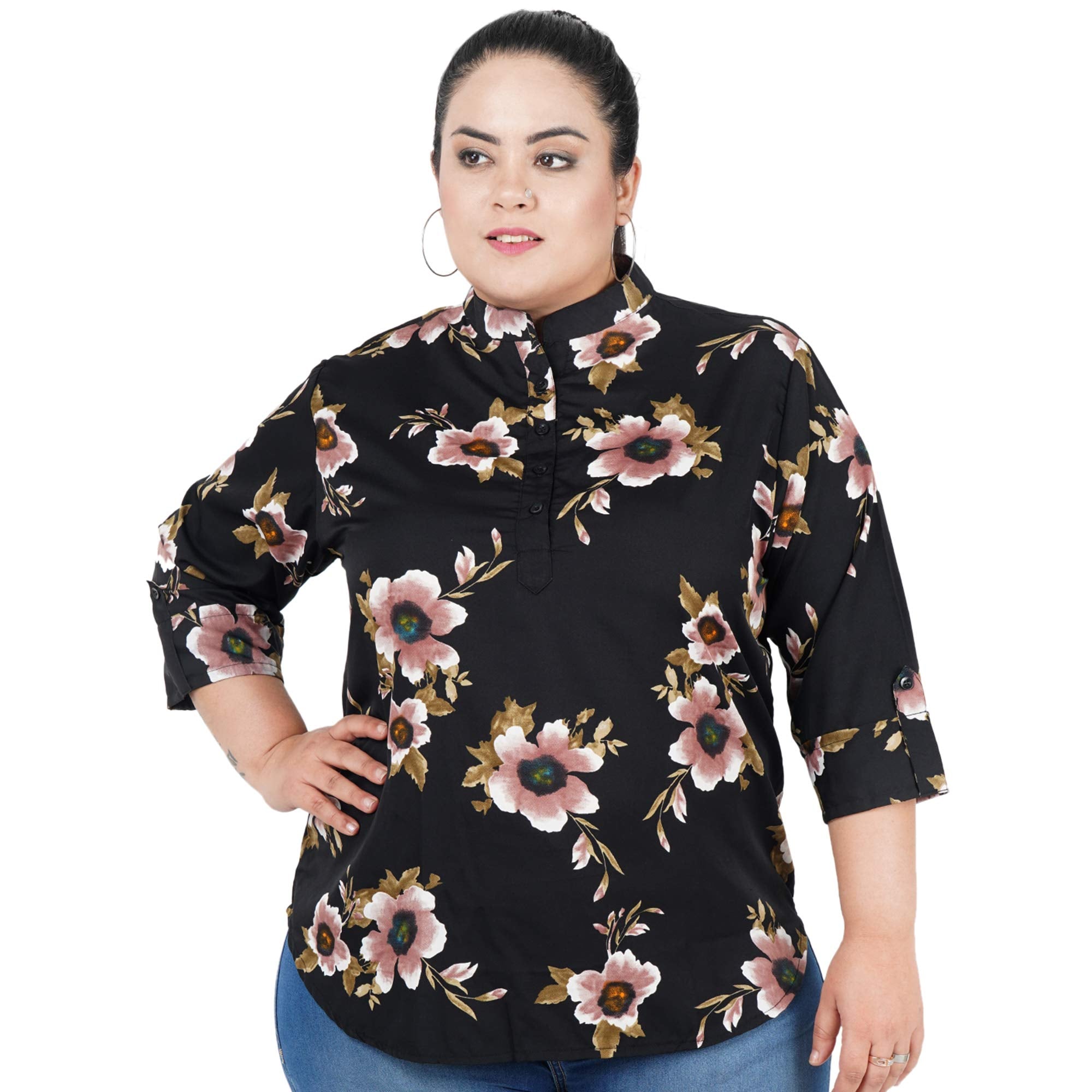 • Style: Plus Size Maroon floral printed crepe tunic top has a mandarin collar, three-quarter sleeves, front button closure and curved hemline