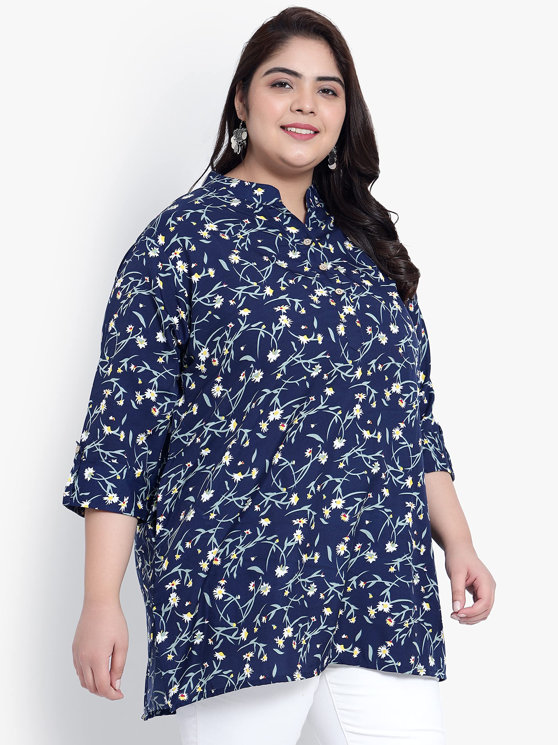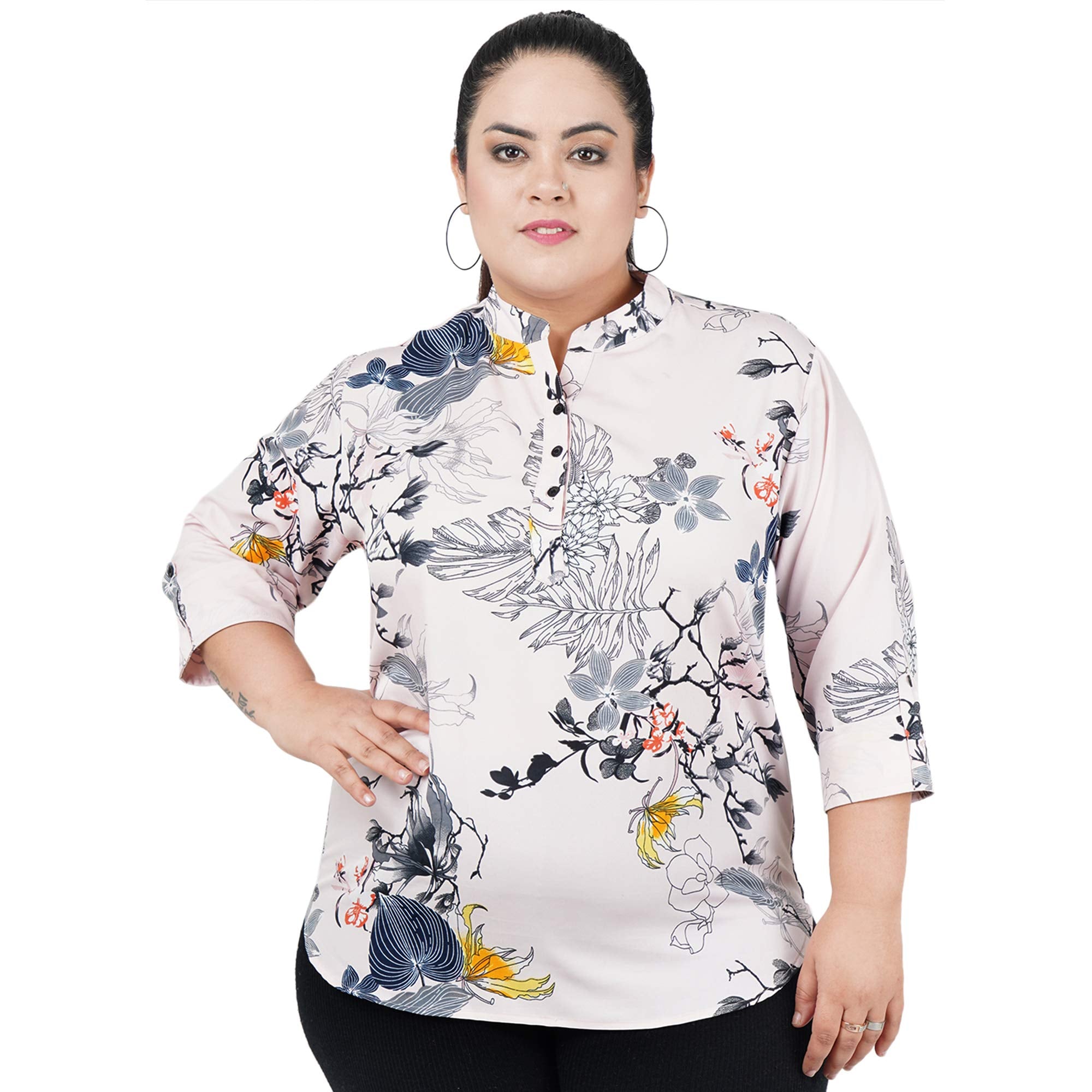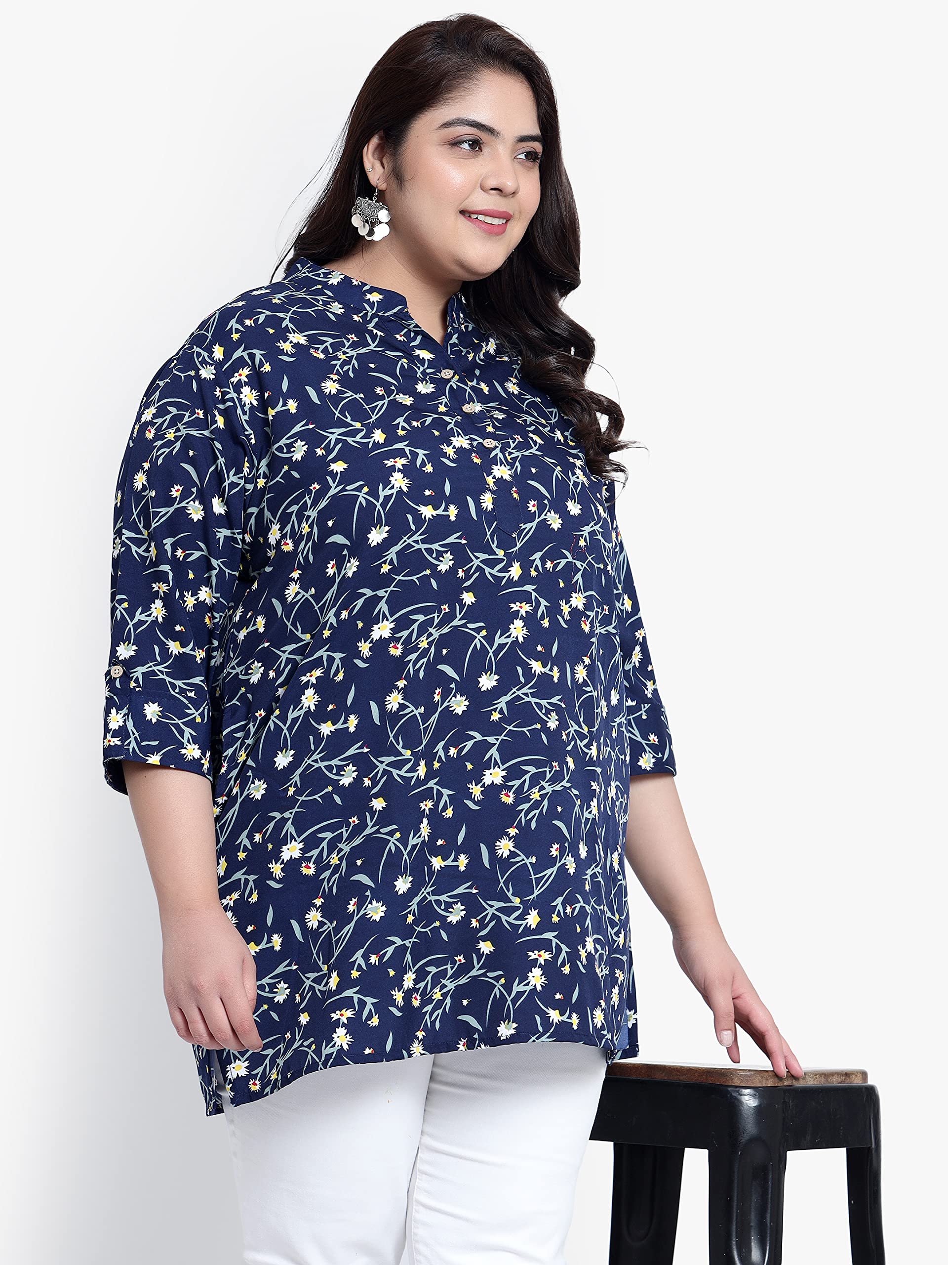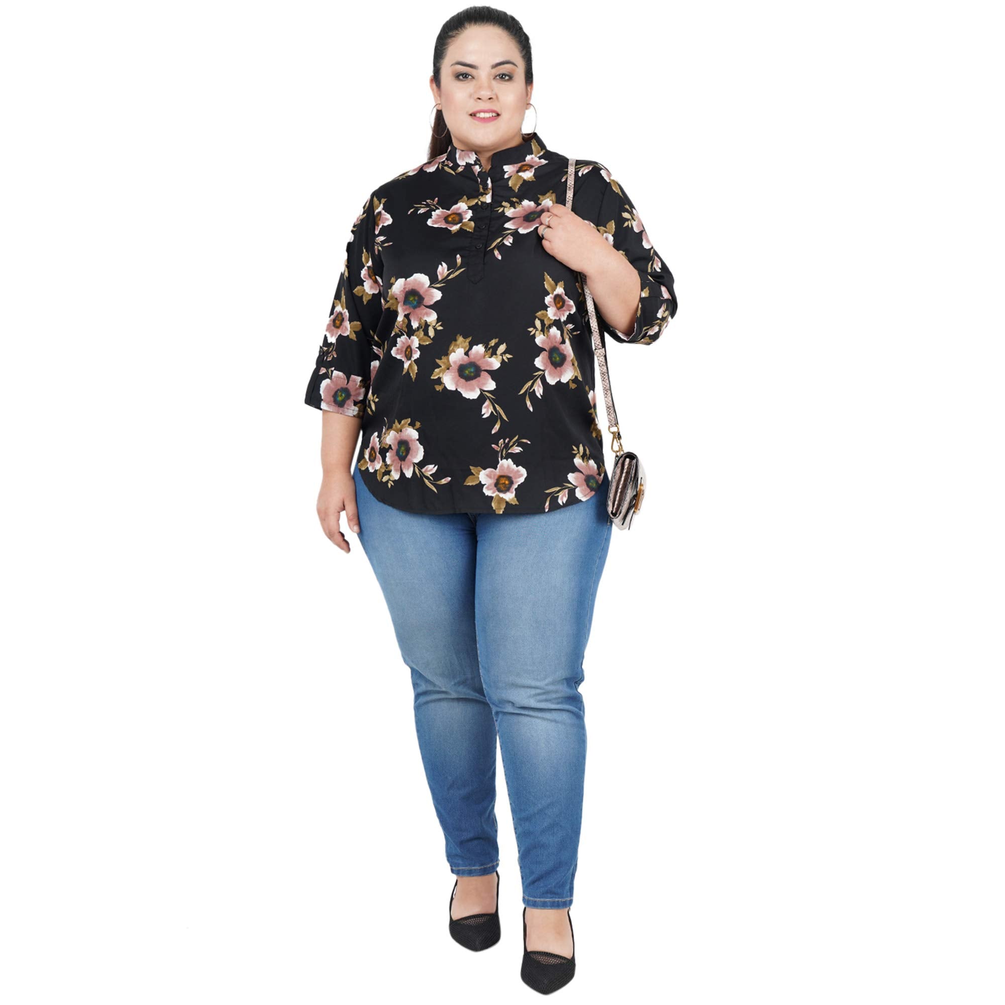 • Style: Plus Size Maroon floral printed crepe tunic top has a mandarin collar, three-quarter sleeves, front button closure and curved hemline