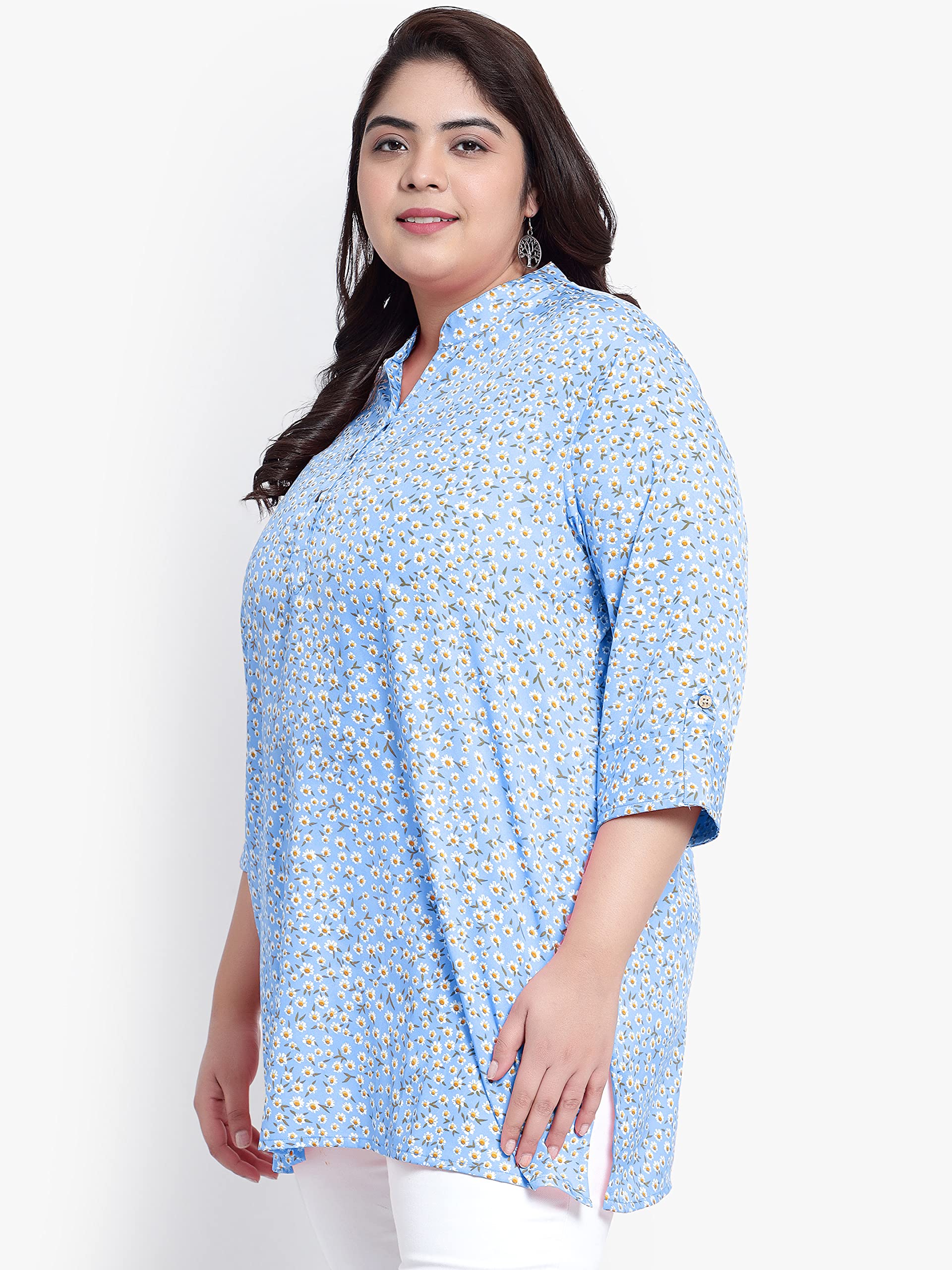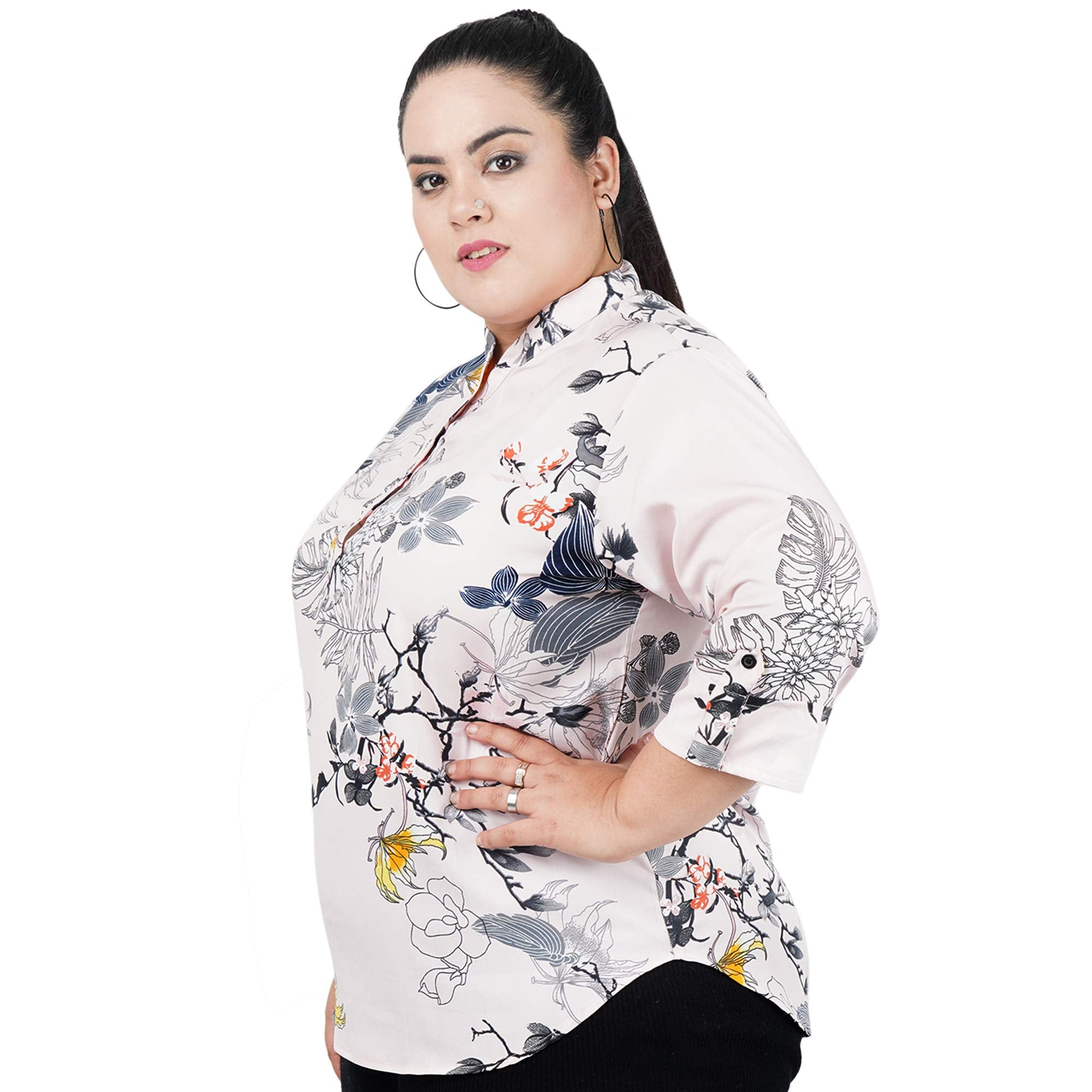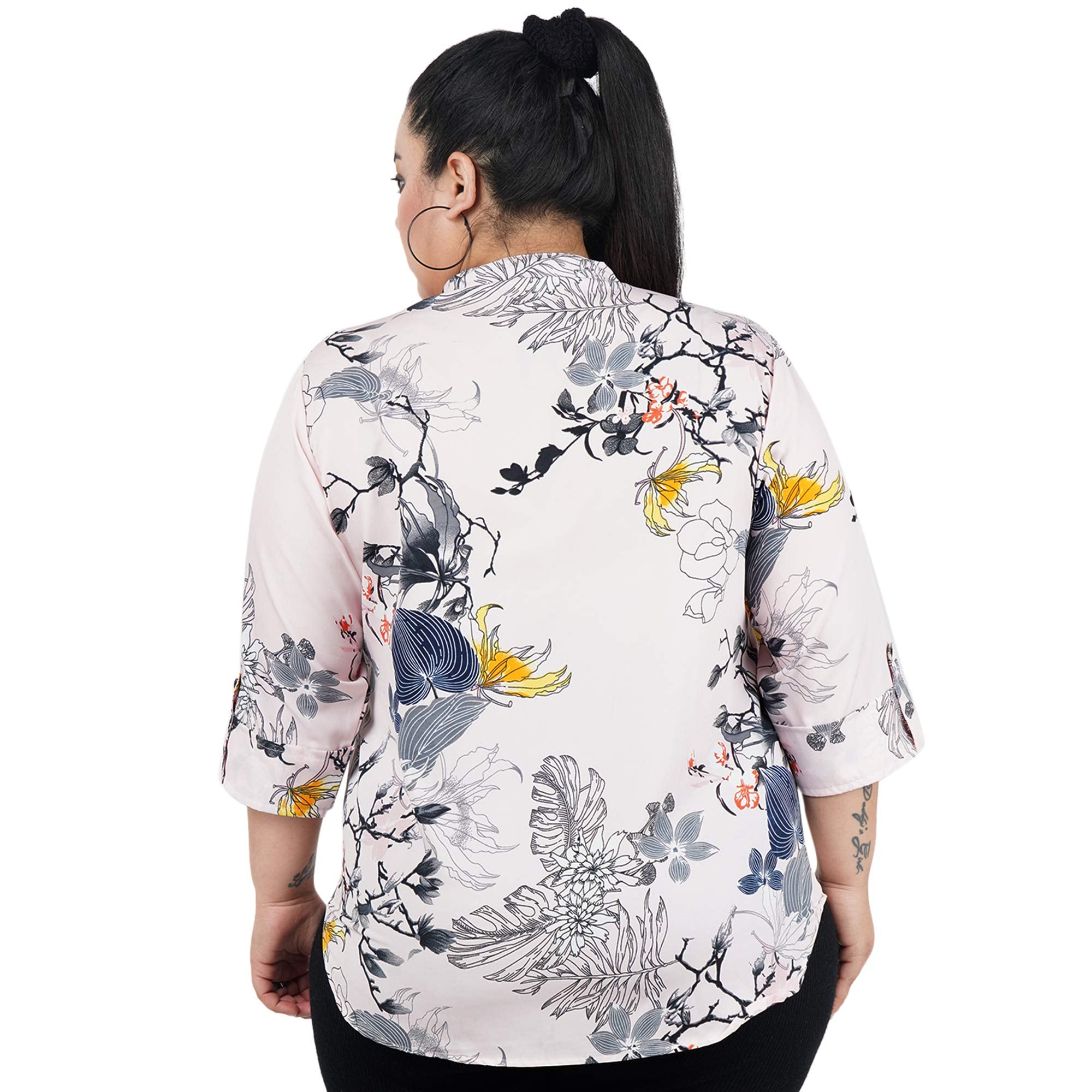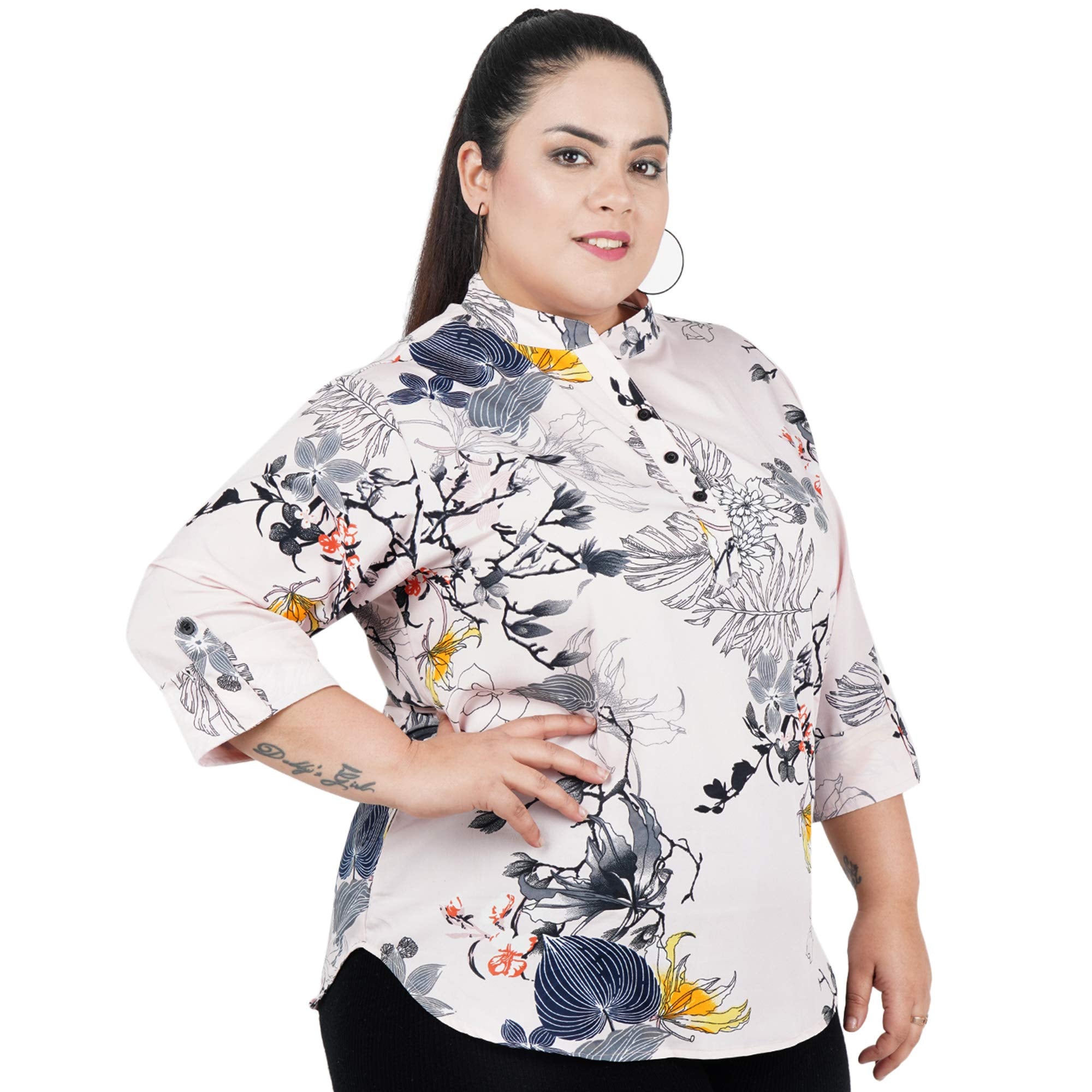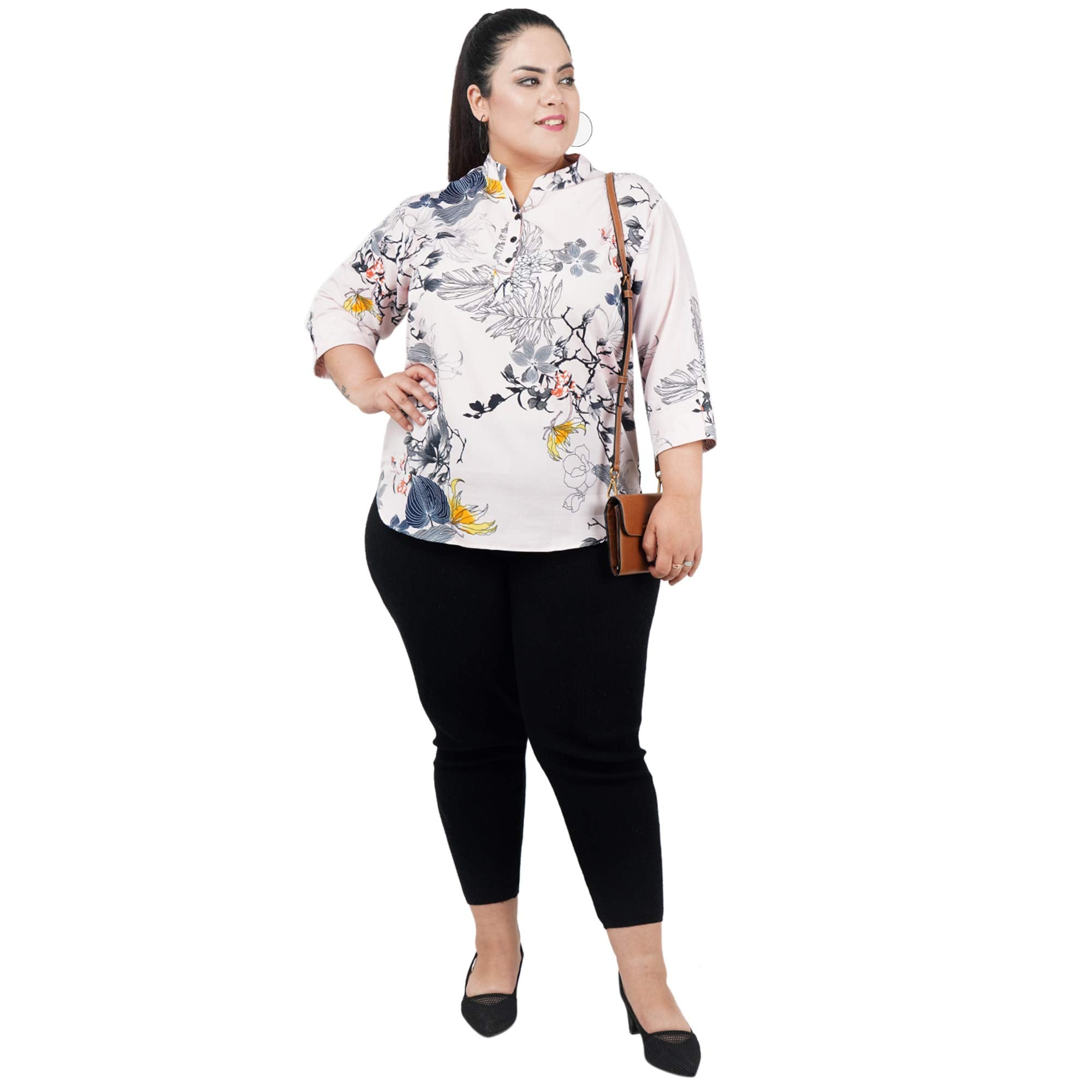 • Style: Plus Size Maroon floral printed crepe tunic top has a mandarin collar, three-quarter sleeves, front button closure and curved hemline