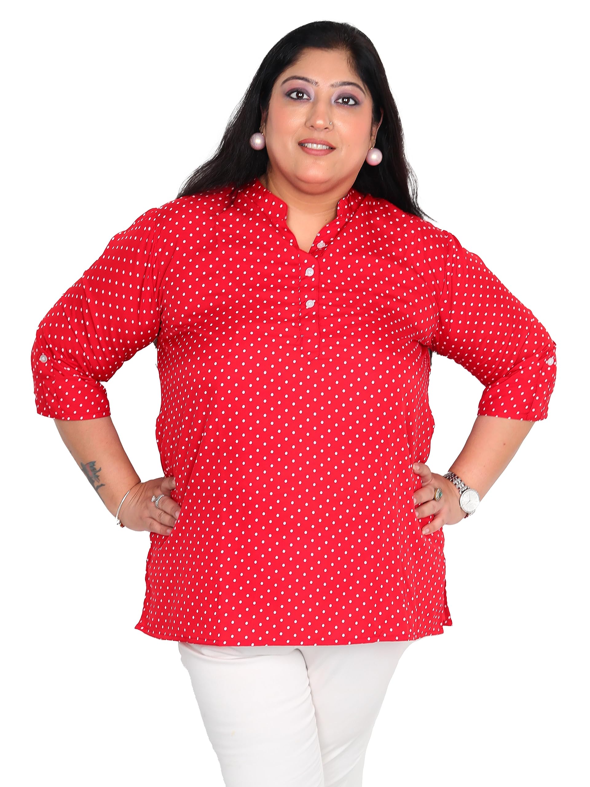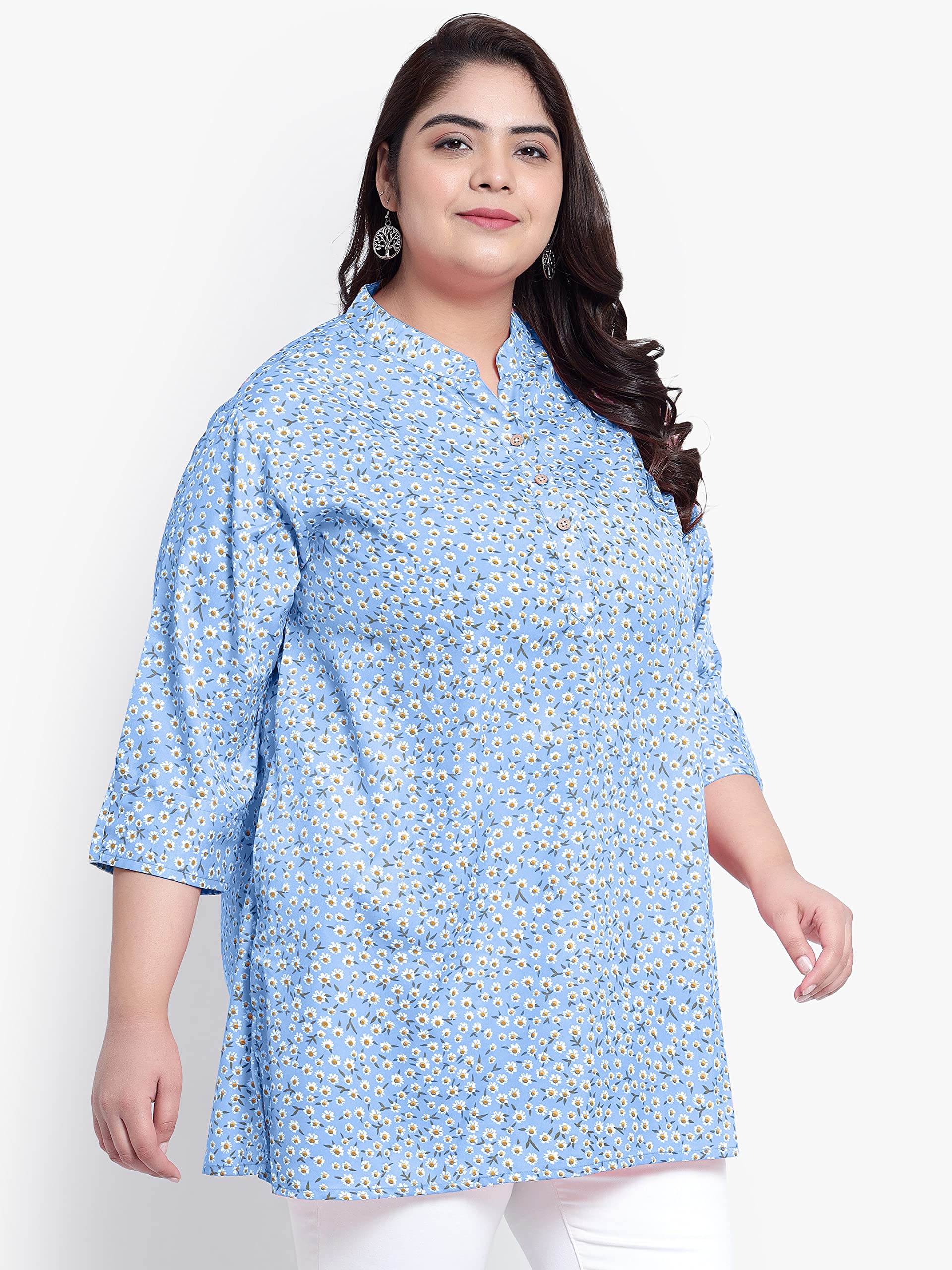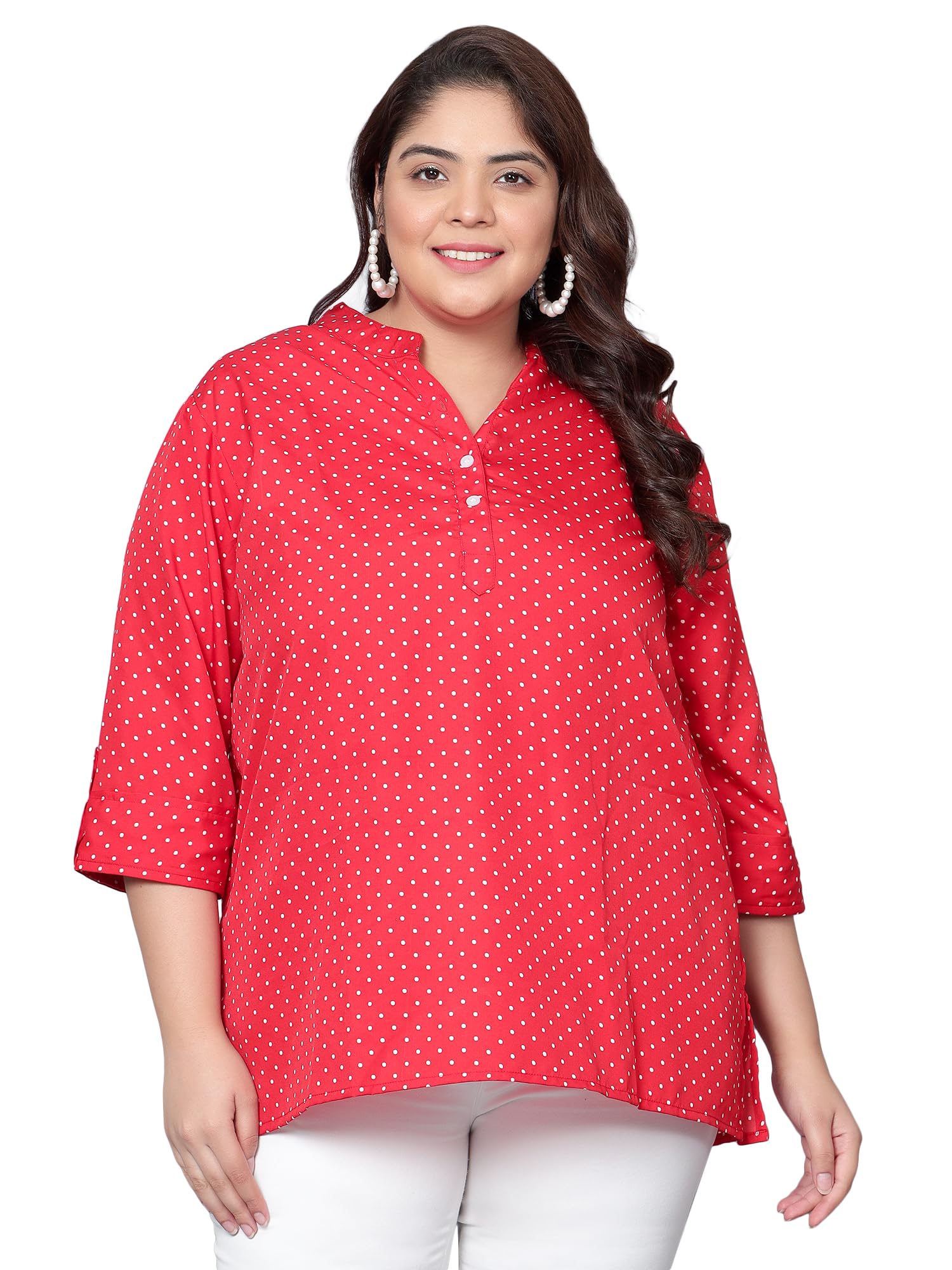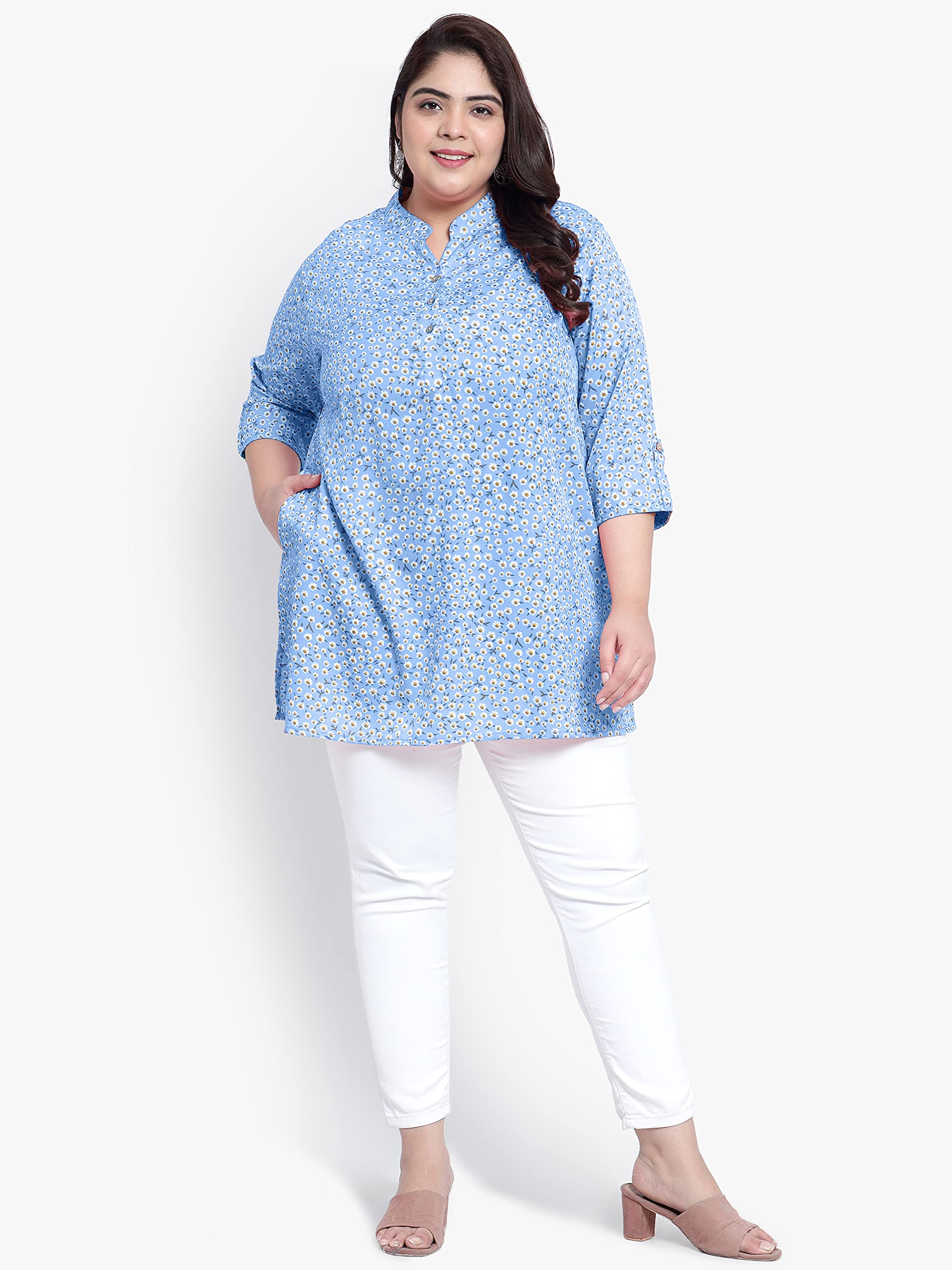 • Style: Plus Size Maroon floral printed crepe tunic top has a mandarin collar, three-quarter sleeves, front button closure and curved hemline