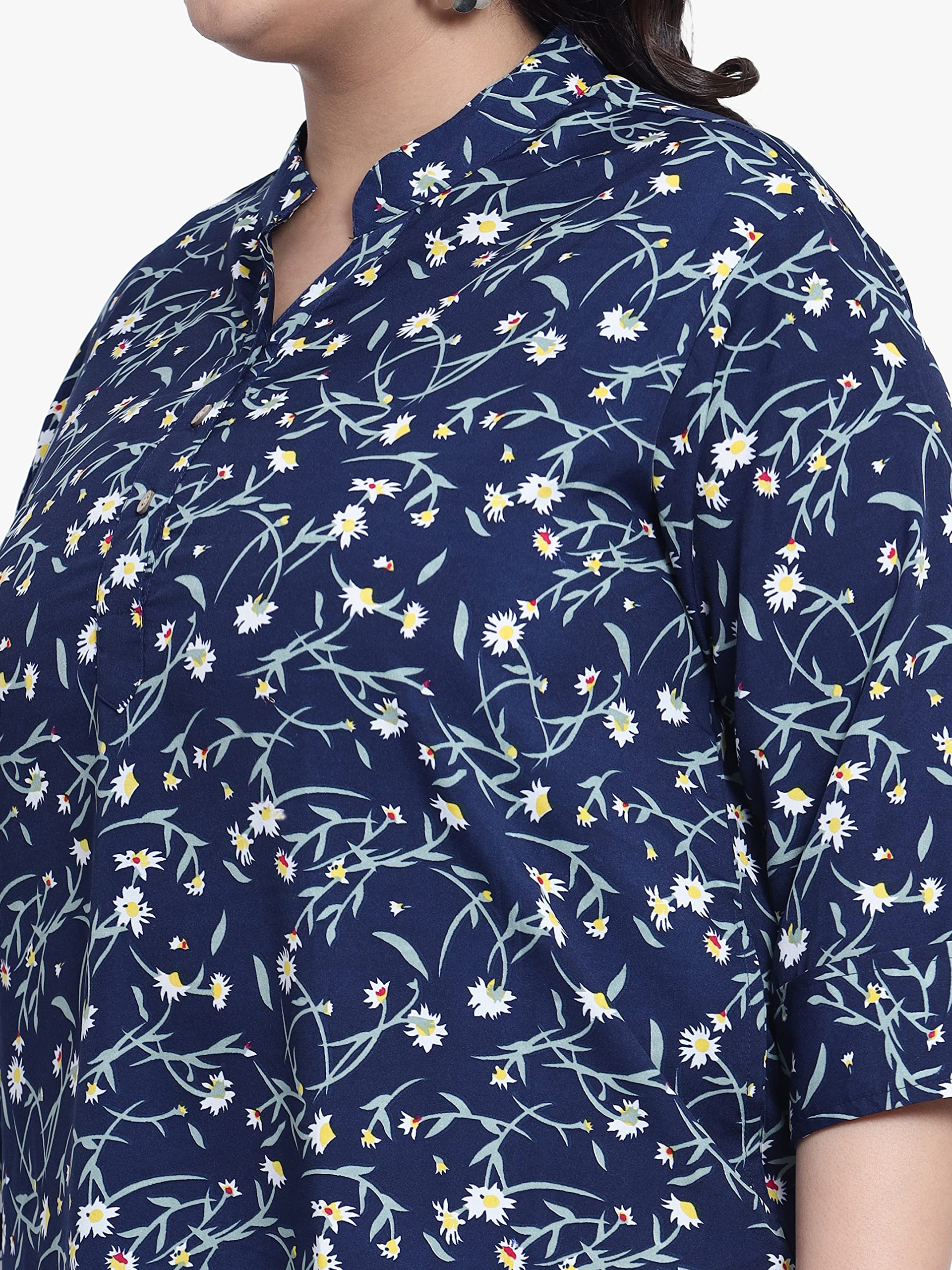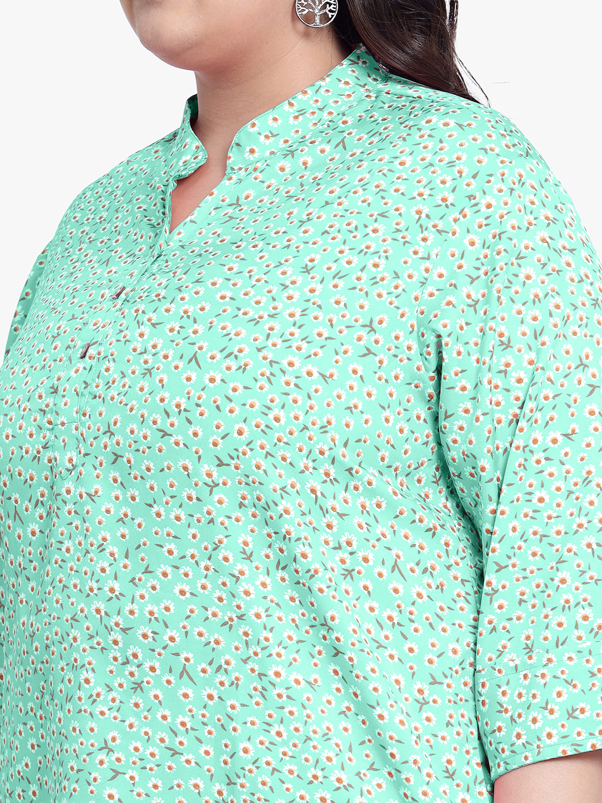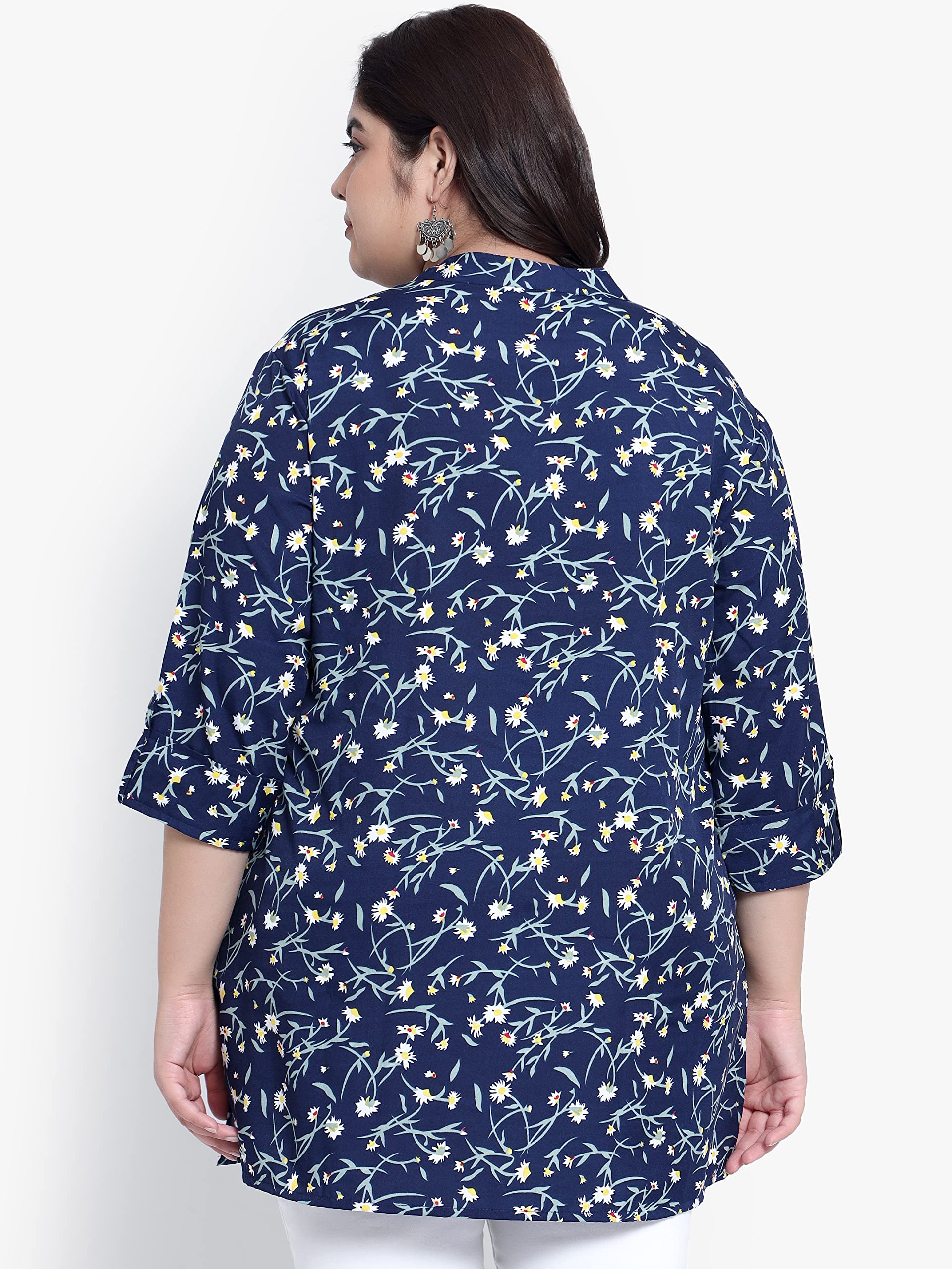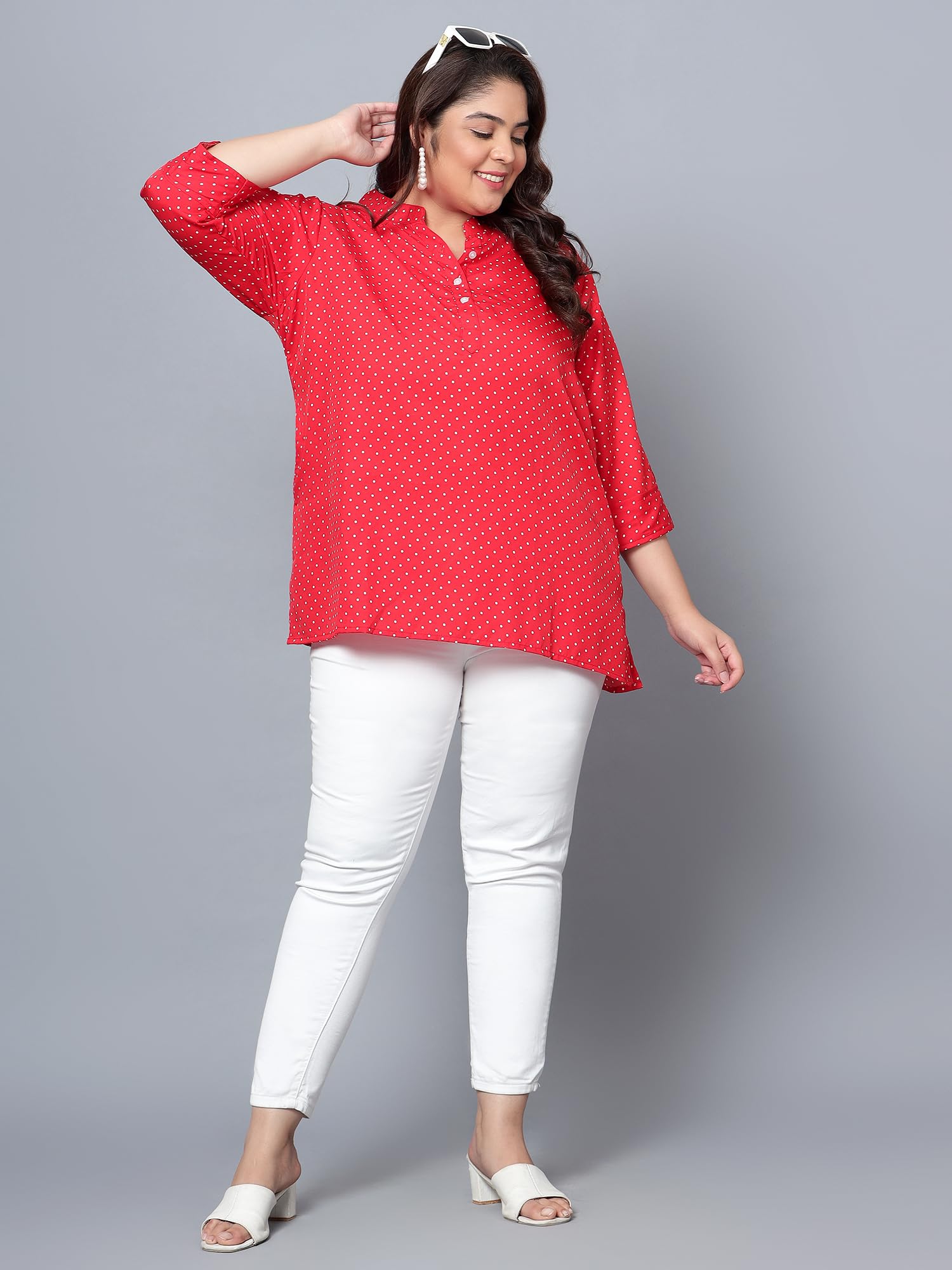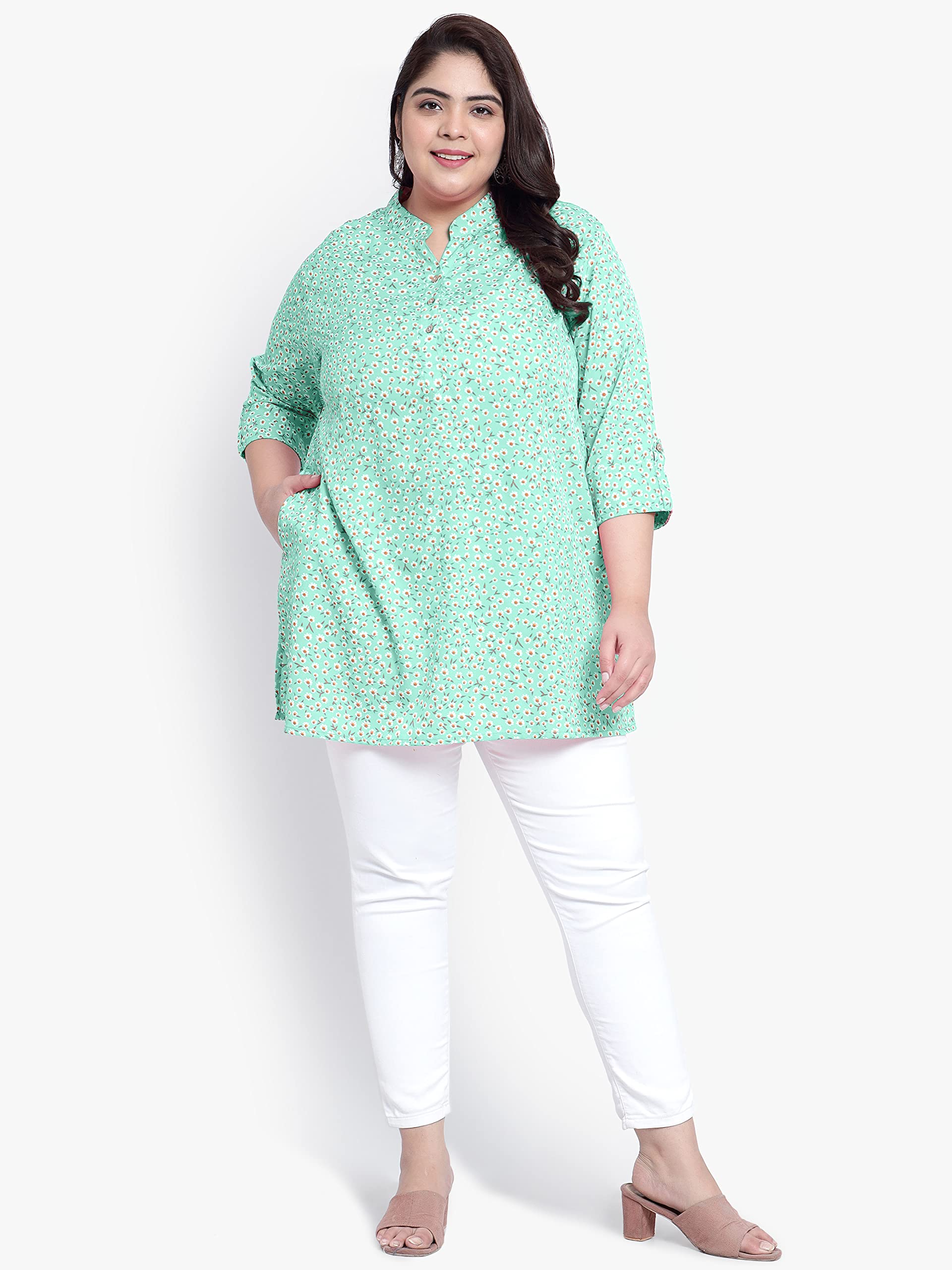 • Style: Plus Size Maroon floral printed crepe tunic top has a mandarin collar, three-quarter sleeves, front button closure and curved hemline