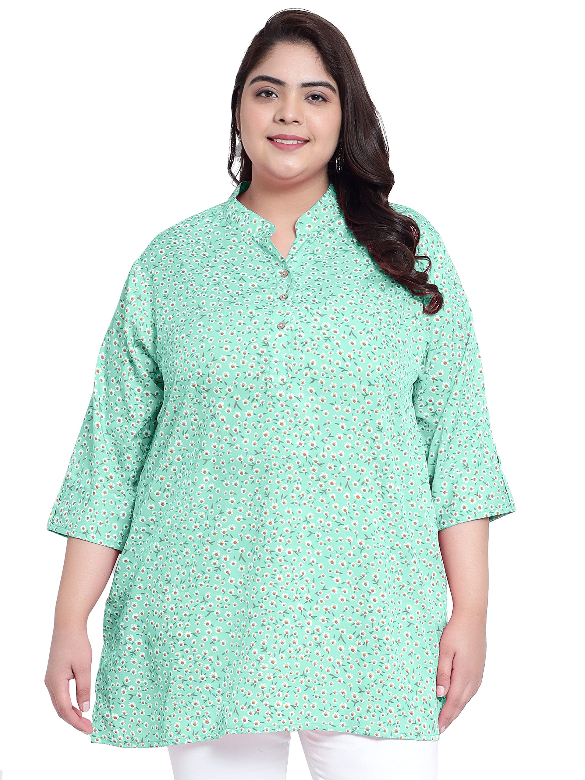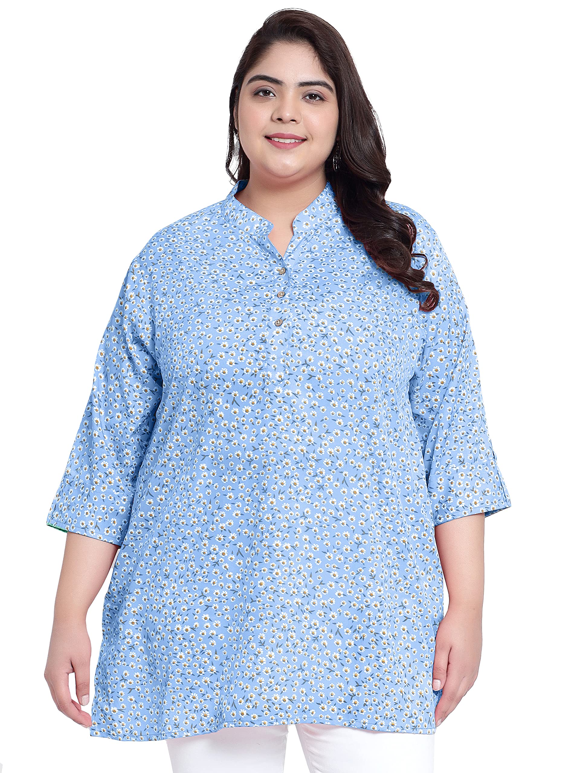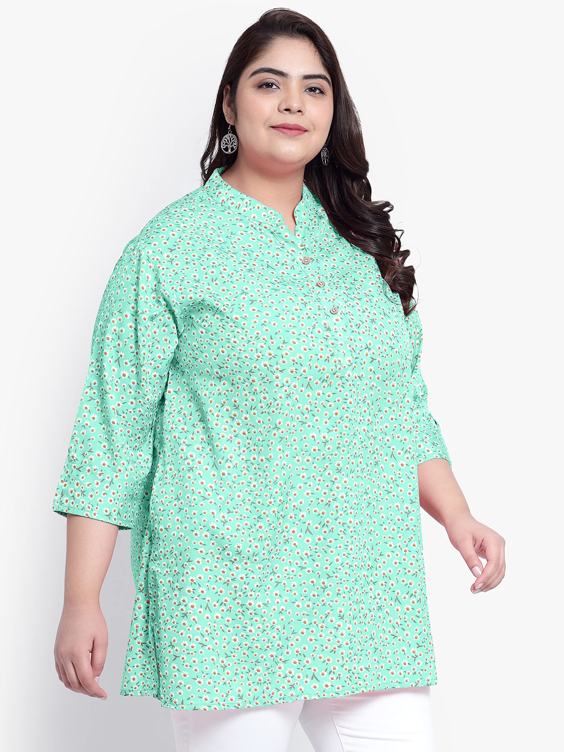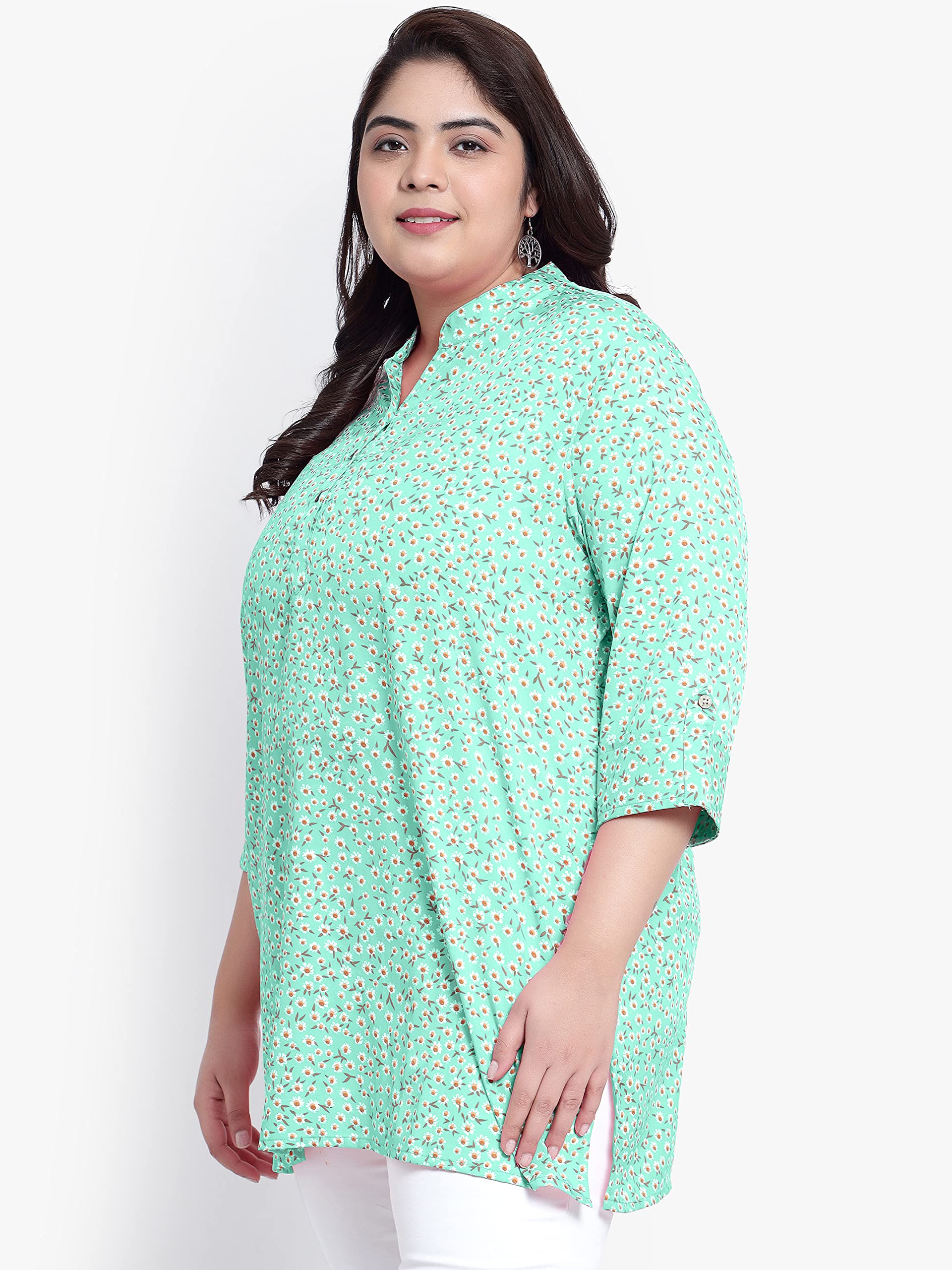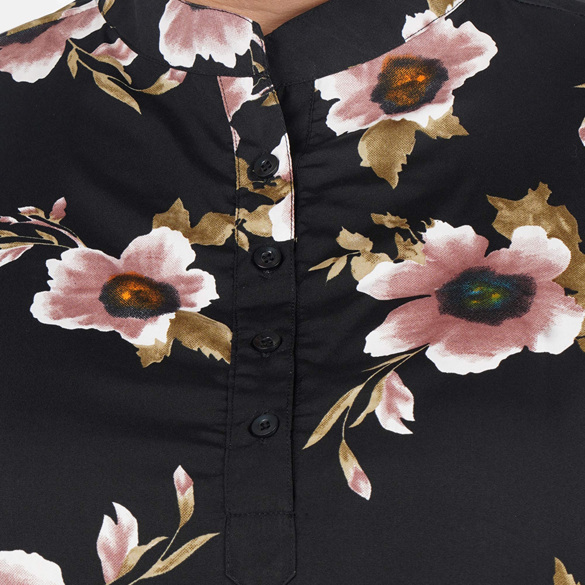 • Style: Plus Size Maroon floral printed crepe tunic top has a mandarin collar, three-quarter sleeves, front button closure and curved hemline