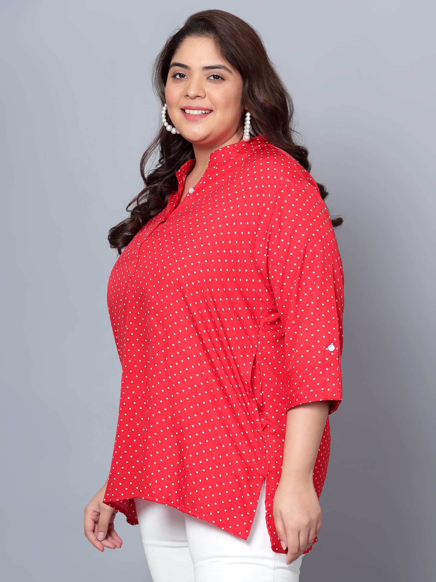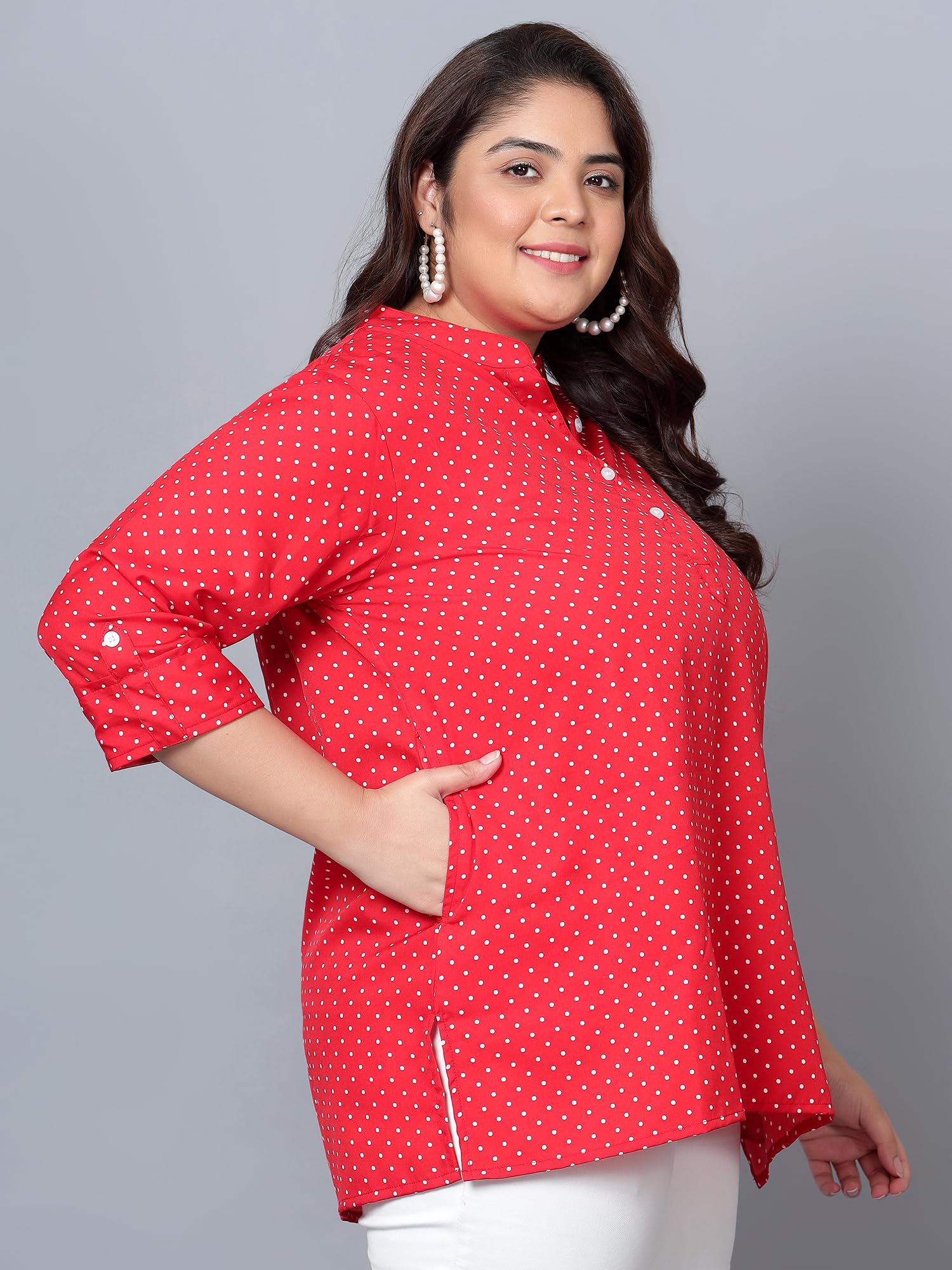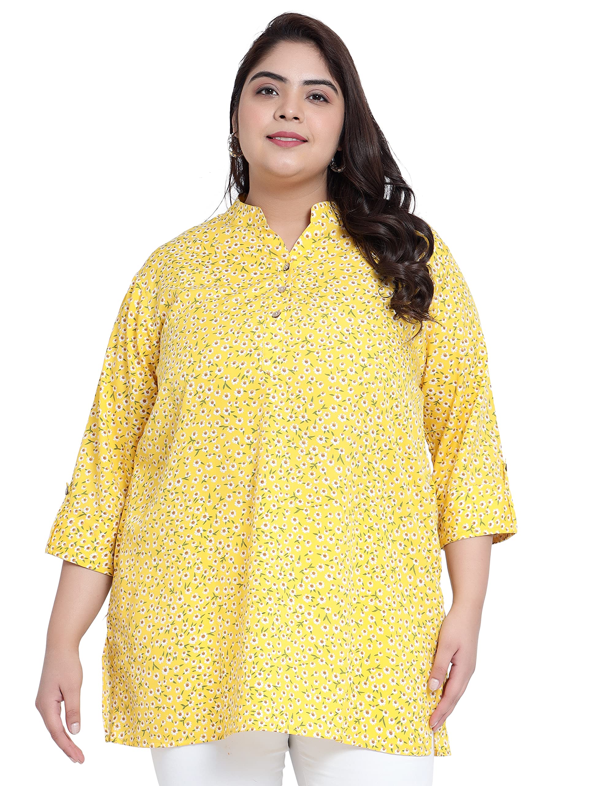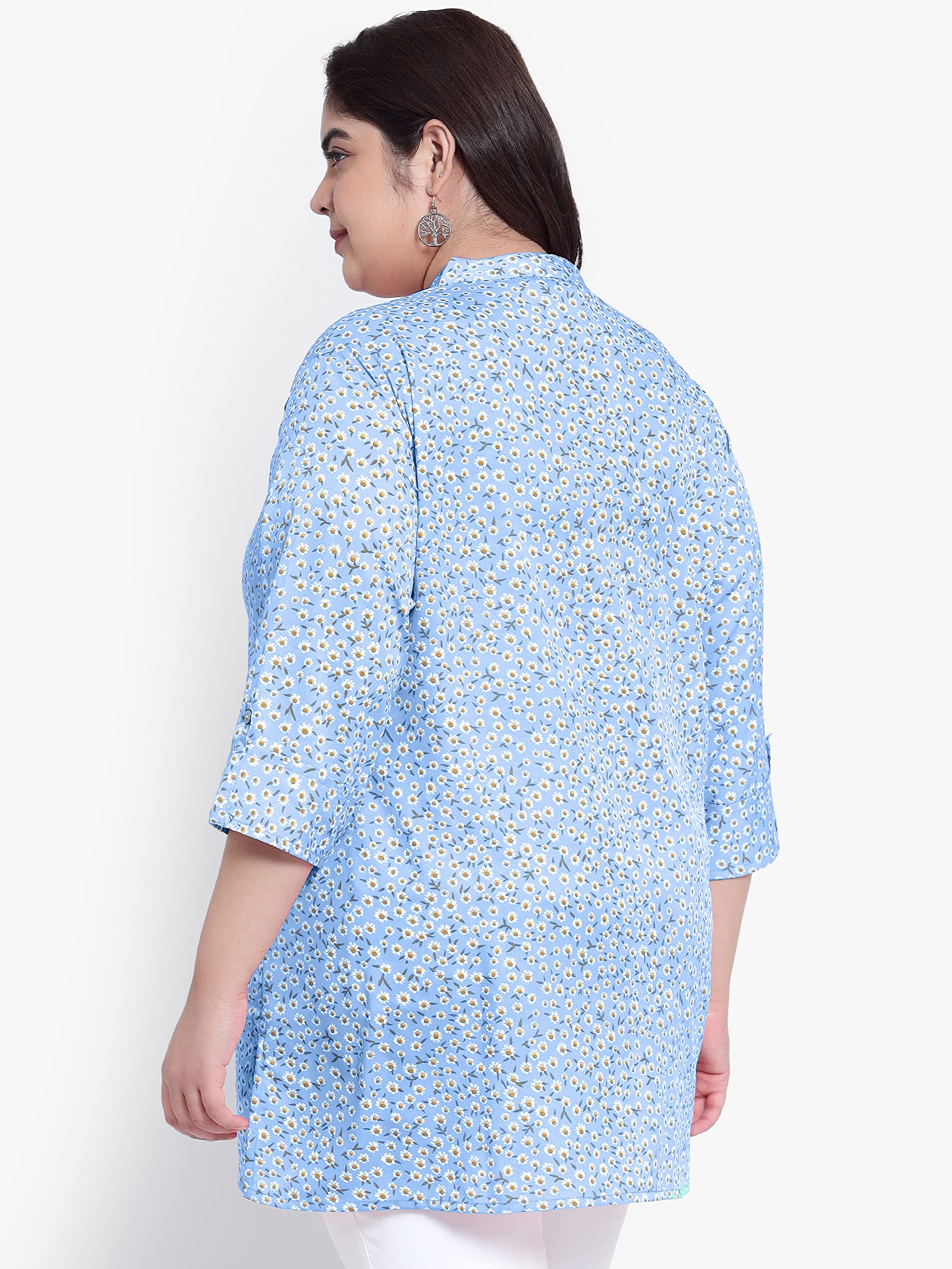 • Style: Plus Size Maroon floral printed crepe tunic top has a mandarin collar, three-quarter sleeves, front button closure and curved hemline