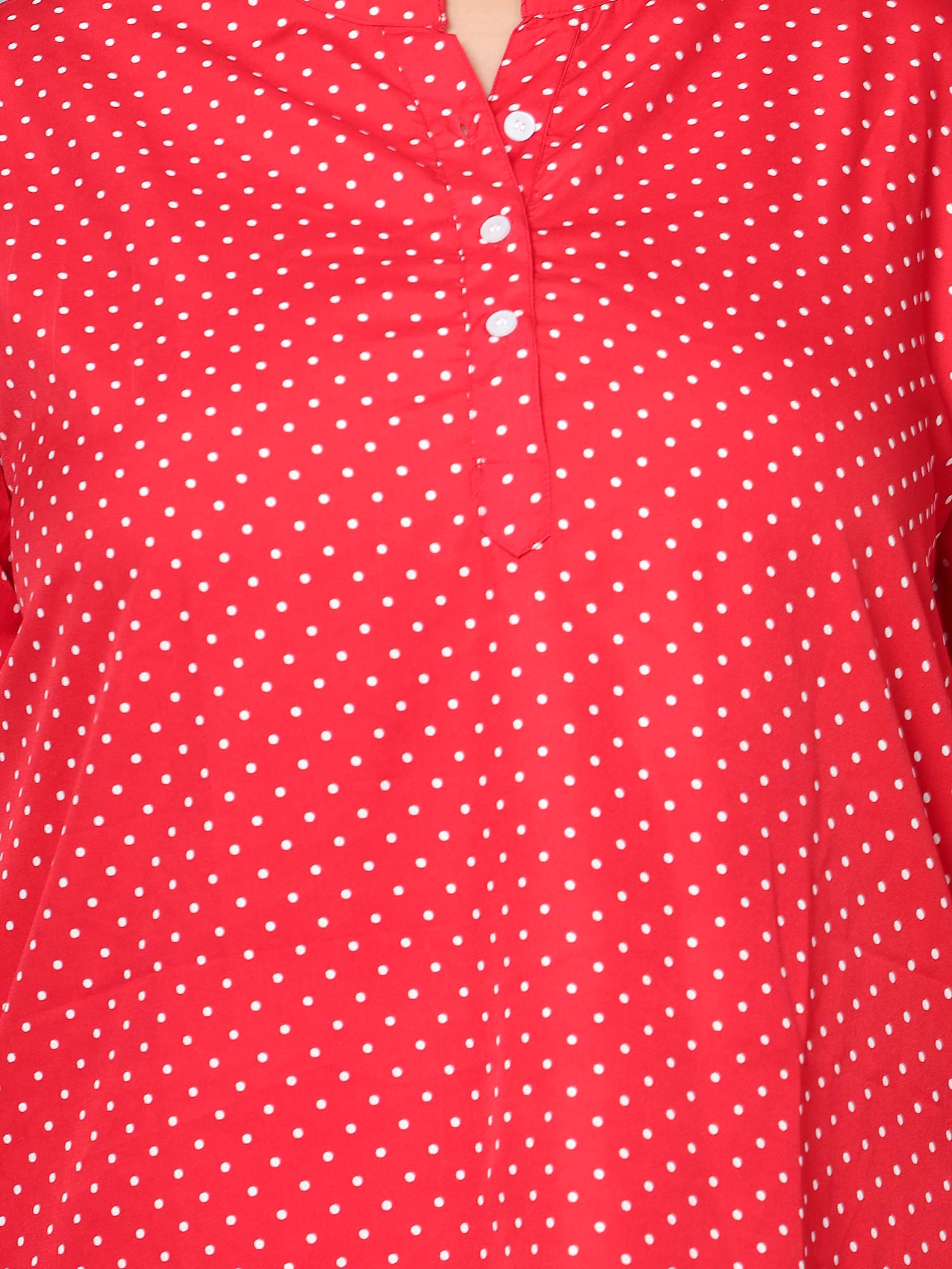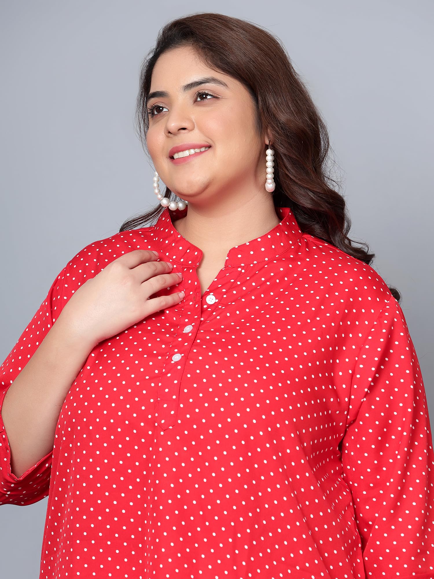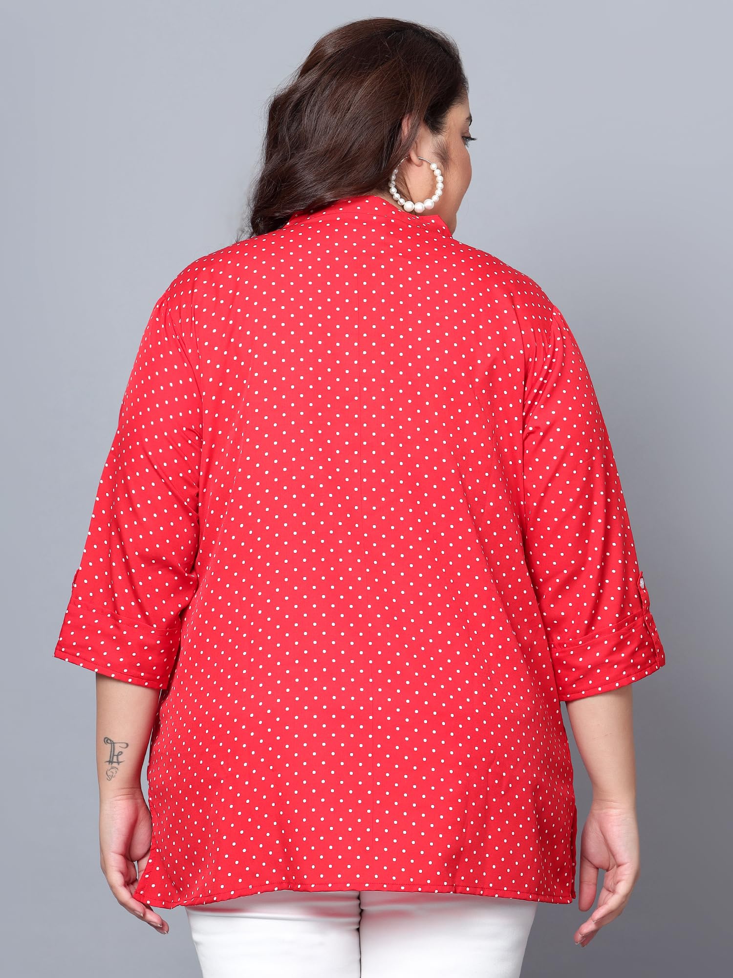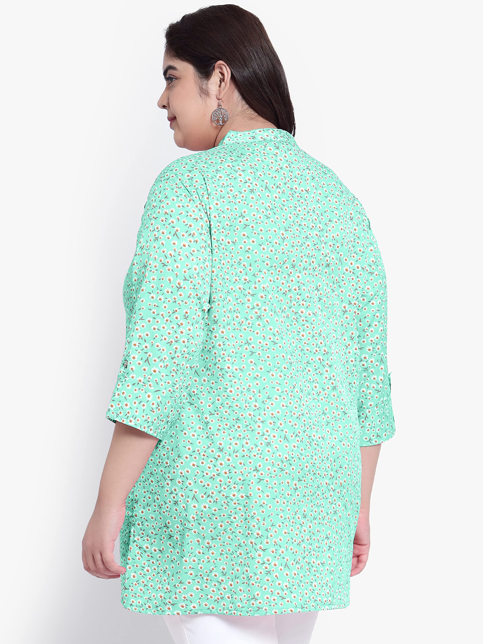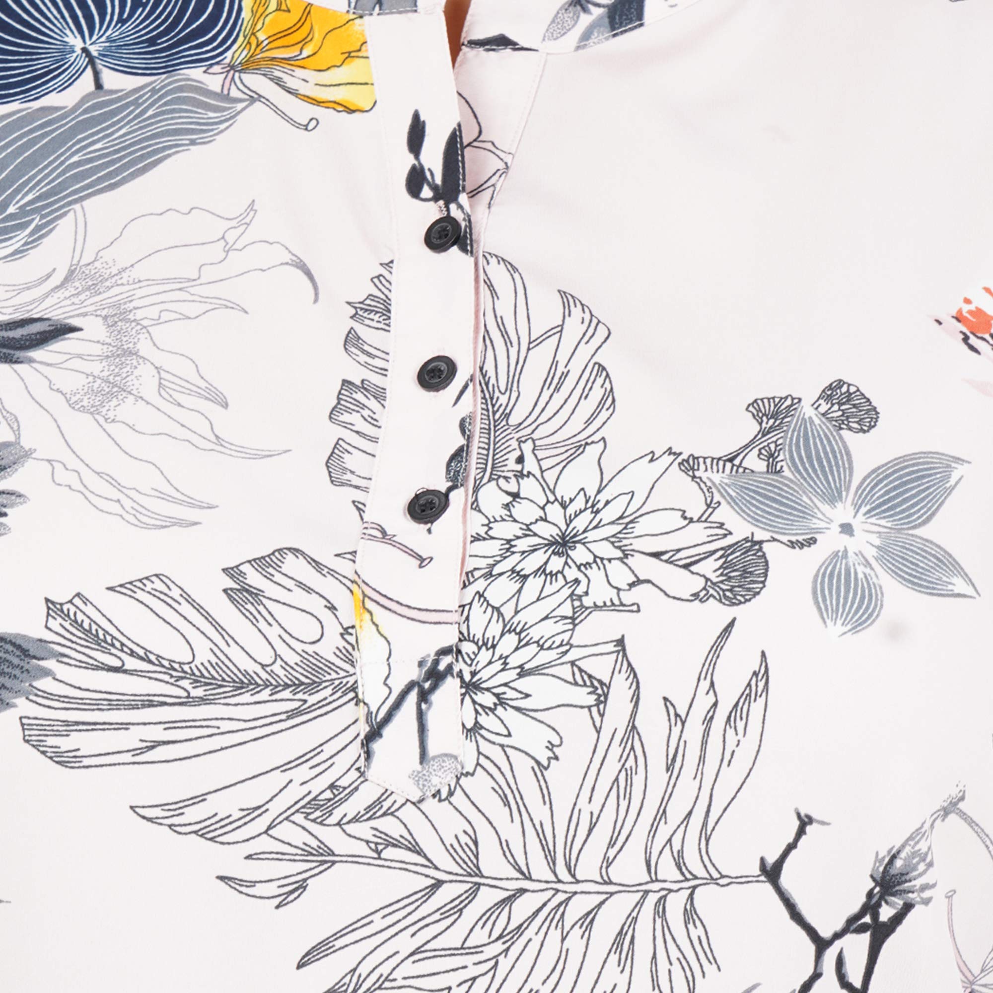 • Style: Plus Size Maroon floral printed crepe tunic top has a mandarin collar, three-quarter sleeves, front button closure and curved hemline