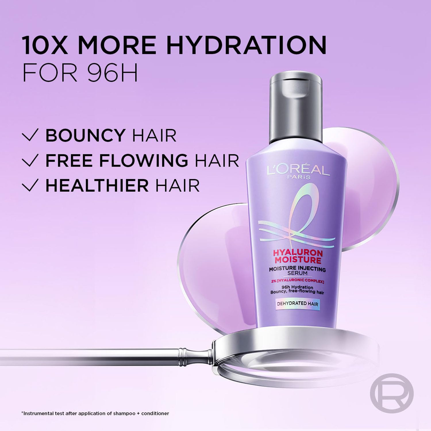 Revive dry, dehydrated hair with L’Oréal Paris Hyaluron Moisture 96H Moisture Injecting Serum, providing intense hydration for bouncy, free-flowing hair