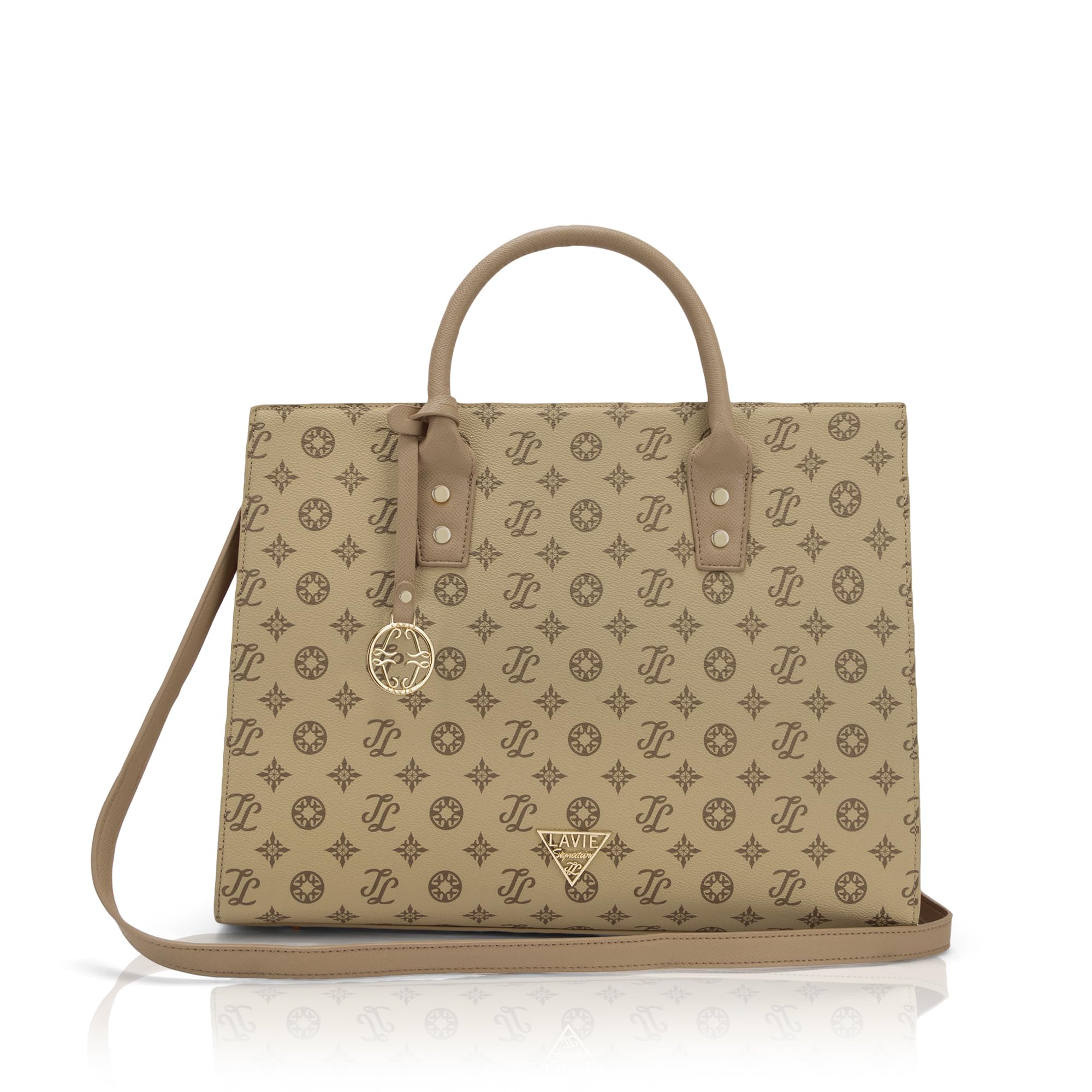 Large sized satchel with small pebble texture & high shine logo on the hanging attached to handle. Top zip closure for safety. The interior has 2 compartments & a padded laptop sleeve. Round dual handles & adjustable sling strap.