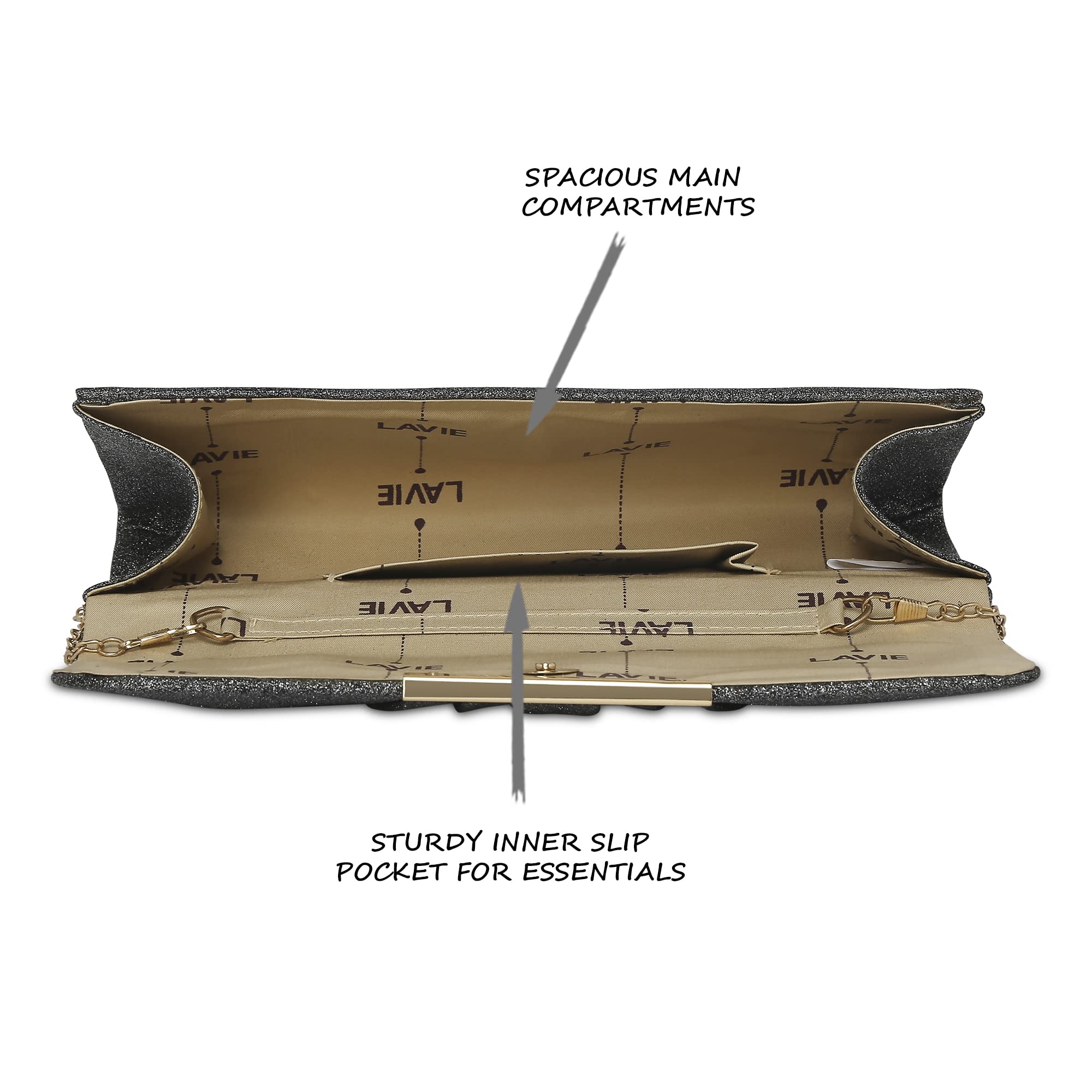 - All Lavie evening bag comes up with Lavie branded lining and clasp closure which can be opened and closed smoothly, built-in pockets,Long Shoulder detachable Metal Chain, large storage capacity which easily carries your basic essentials like a mobile phone, cards, cash, car keys, small wallet, mirror, lipstick and some makeups.