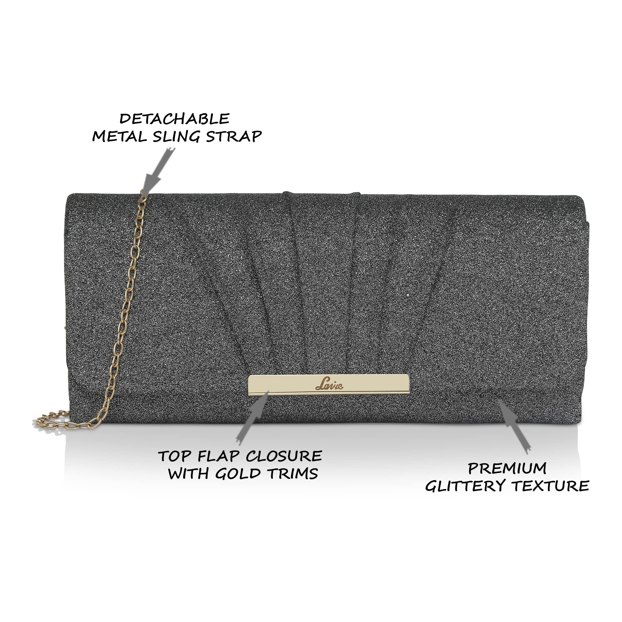 - This stylish foldover framed clutch by Lavie is made with high end Glitter fabric. It has a flap which can be closed with a durable magnet and two zippered pocket to keep your valuable items safe