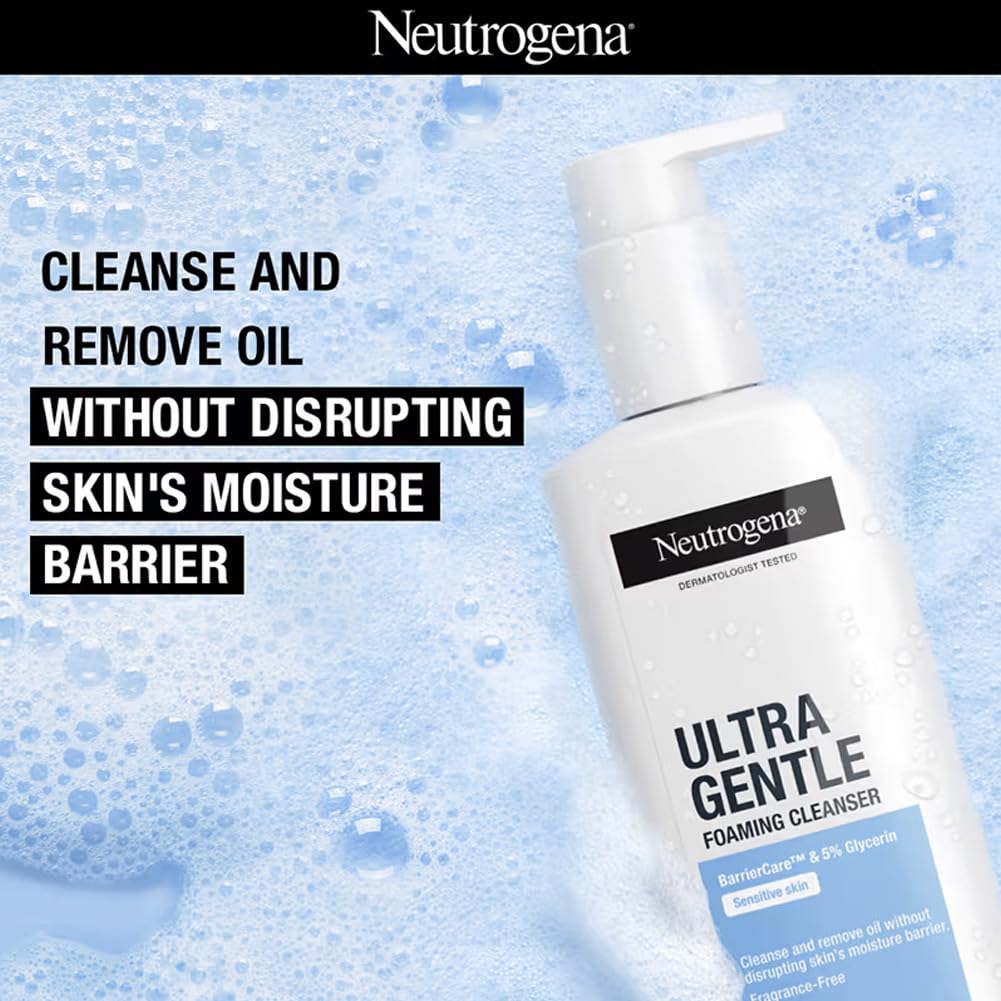 Details: Neutrogena Ultra Gentle Foaming Cleanser is the ultimate choice for sensitive skin care, offering 6X gentler cleansing compared to regular face washes. Developed with dermatologists, it’s clinically proven to protect the skin's natural barrier while effectively removing dirt, oil, and impurities. Powered by Barriercare technology, this innovative formulation mimics natural skin lipids to reinforce the barrier, lock in moisture, and minimise sensitivity triggers, making it an ideal cleanser for both men and women with sensitive skin.This Neutrogena cleanser features a glycerin-enriched formula that hydrates deeply while preserving the skin's moisture, leaving your skin soft, smooth, and rejuvenated after every wash. Unlike many cleansers, it is free from harsh chemicals like parabens, soap, and fragrances, ensuring a hypoallergenic, irritation-free cleansing experience. Suitable for all skin types, including acne-prone sensitive skin, it offers gentle care without compromising effectiveness. Clinically tested, this Neutrogena foaming cleanser transforms your skincare routine in just one week. 94% of users reported cleaner skin, and 86% noticed a softer, smoother texture. It is perfect for those looking to cleanse and hydrate their skin while strengthening the natural barrier against environmental aggressors. With its eco-friendly packaging, made from 100% recyclable materials, this Neutrogena foaming cleanser supports a sustainable skincare approach. Its fragrance-free formula ensures it’s gentle on even the most delicate skin, making it suitable for everyday use.
