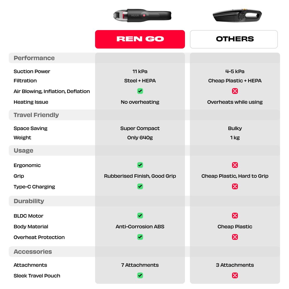 NUUK REN GO Cordless Car and Home Vacuum Cleaner | 2X More Suction, 11000 PA | 4-in-1 Functions with Air Blowing | 7 Attachments+Storage Bag | Dual Filtration with HEPA | BLDC Motor | 2 Suction Modes
