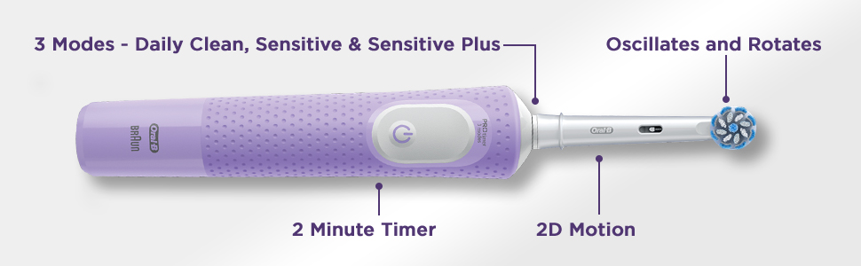 Details: Introducing the Oral-B Vitality Pro with Sensitive Plus Rechargeable Rotating Electric Toothbrush, the essential toothbrush for achieving a professional clean. Designed for adults, this electric toothbrush offers a superior brushing experience with its 2D Cleaning Action that oscillates and rotates to remove up to 100% more plaque compared to a regular manual toothbrush. The round brush head, with crisscross bristles angled at 16 degrees, cups each tooth for a more effective clean. Featuring a built-in professional 2-minute quadrant timer, it ensures you brush for the dentist-recommended duration, vibrating every 30 seconds to alert you to change the brushing area. With two brushing modes—Daily, Sensitive and Sensitive Plus—it caters to both regular and sensitive teeth and gums. Waterproof with an IPX7 rating and backed by a 2-year warranty, this toothbrush is designed for durability and ease of use. Experience the dentist-inspired round brush head from Oral-B, the #1 brand recommended by dentists worldwide. Make the Oral-B Vitality Pro with Sensitive Plus a part of your daily routine and experience the difference in oral care with advanced plaque removal and improved gum health. Oral B Vitality Pro with Sensitive+ is compatible with a variety of Oral-B toothbrush heads, including CrossAction, Precision Clean, Sensitive Clean, and more, offering versatility to suit your specific needs.