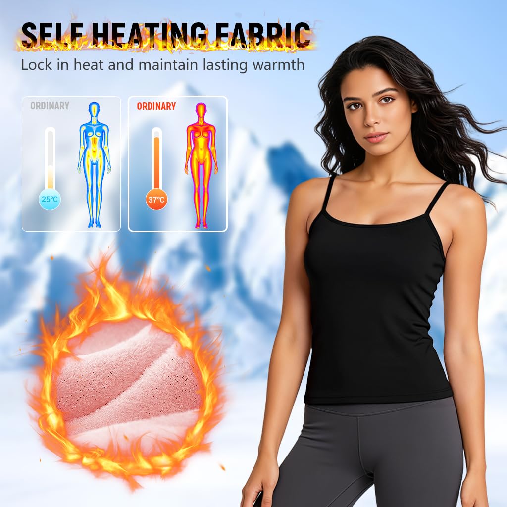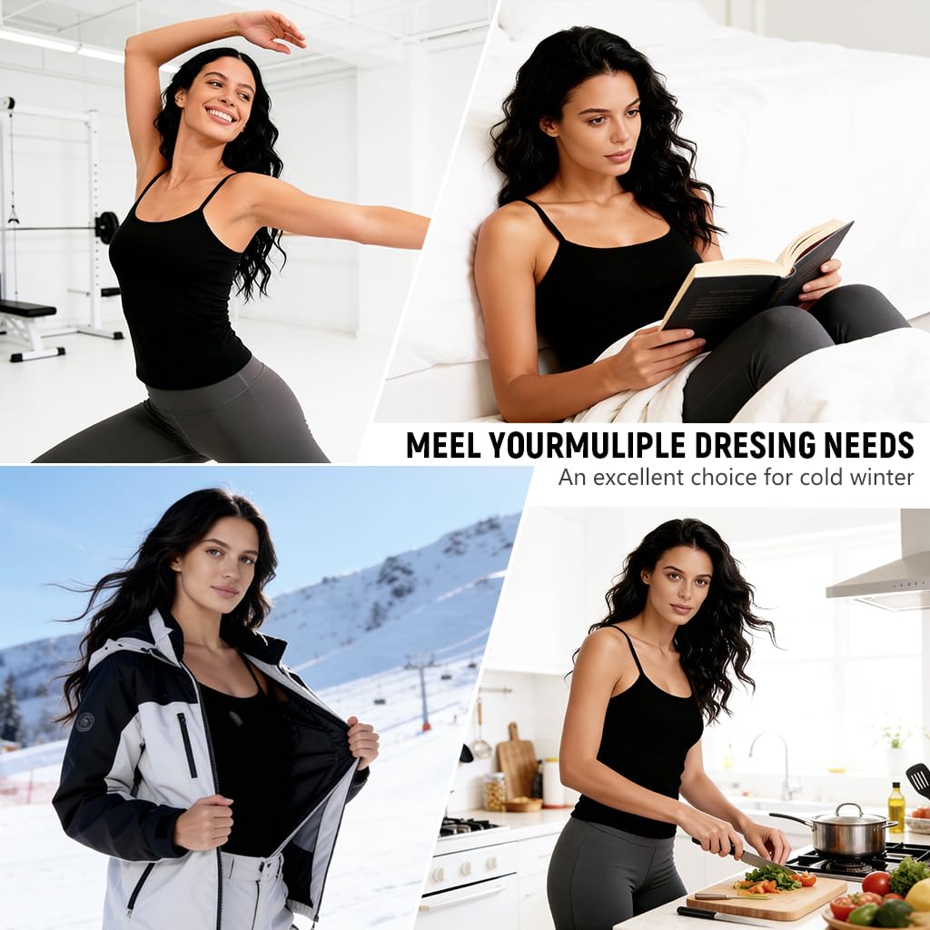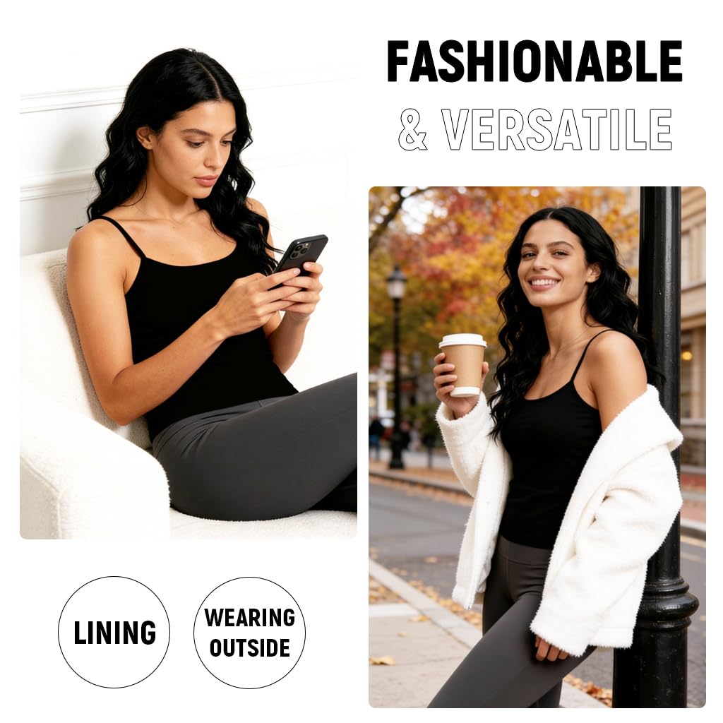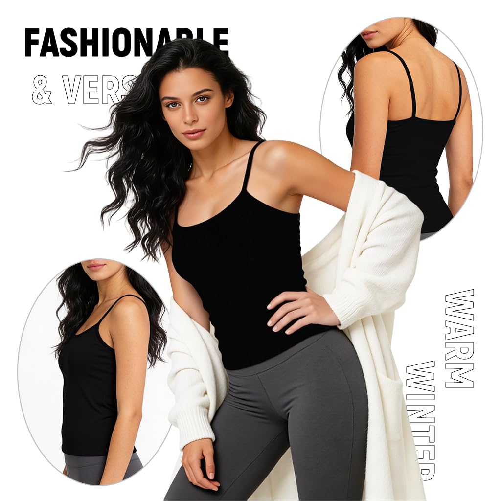 CLASSIC STYLE AND FIT: Designed as a sleek sleeveless thermal camisole, this thermal for women offers a tasteful, feminine silhouette in timeless black. Crafted to layer under sweaters, jackets, or coats, it keeps warmth close to the body while adding a smooth, stylish base to any winter outfit.