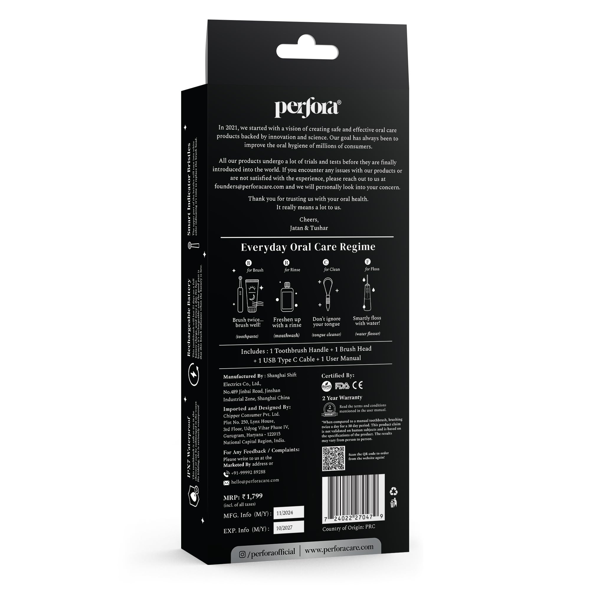 Package Content - Perfora Oscillating Electric Toothbrush - Limitless Black & Perfora Assorted Toothpaste Mini Sample -45g ( Dream White Toothpaste - 15g , Charcoal Toothpaste - 15g & Super Fresh Toothpaste - 15g)