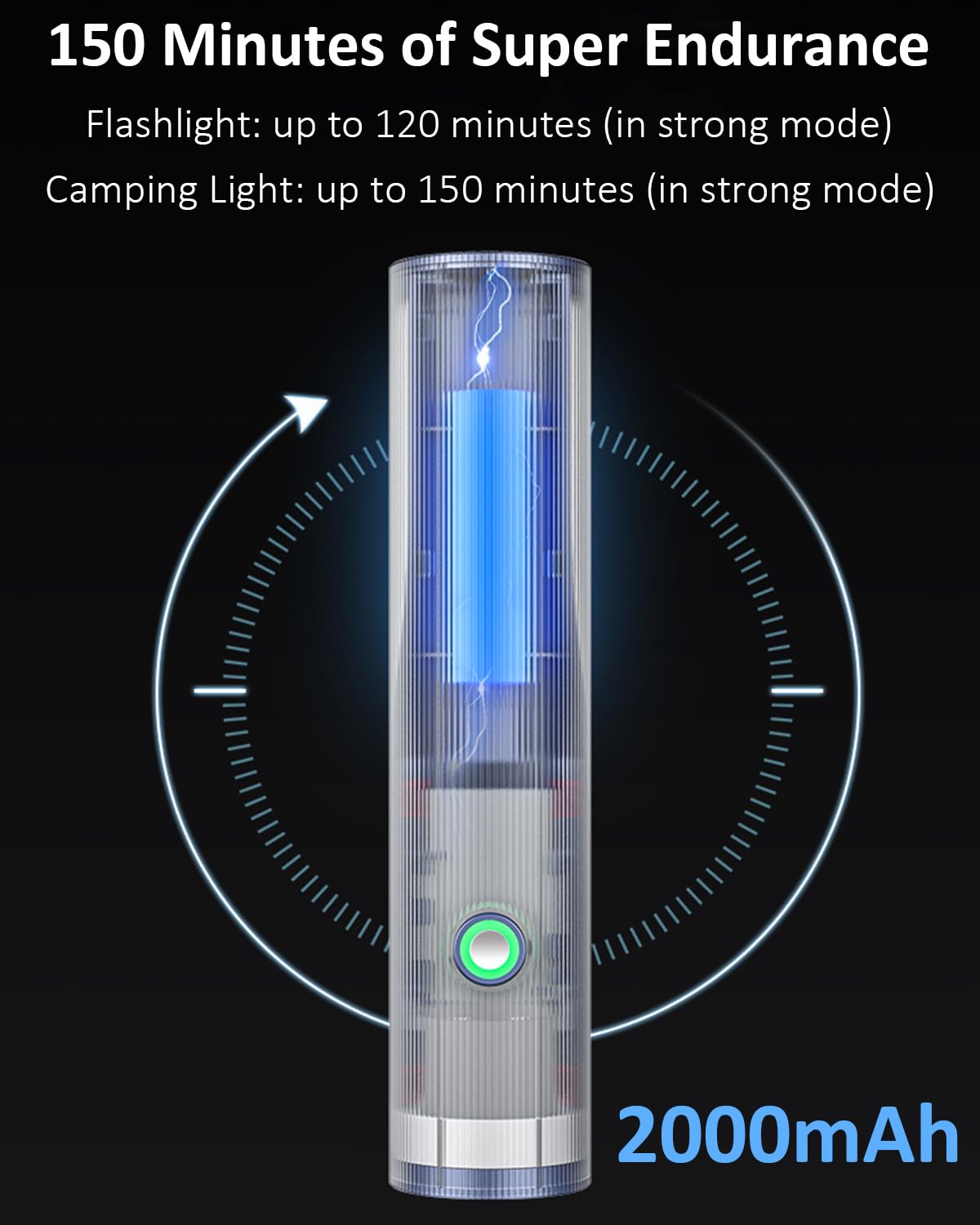 【2000mAh Long Endurance】Torch light Built in 2000mAh rechargeable lithium battery, capable of illuminating for 120 minutes in flashlight high mode, 150 minutes in camping light high mode, paired with USB-C charging port for easy charging at any time