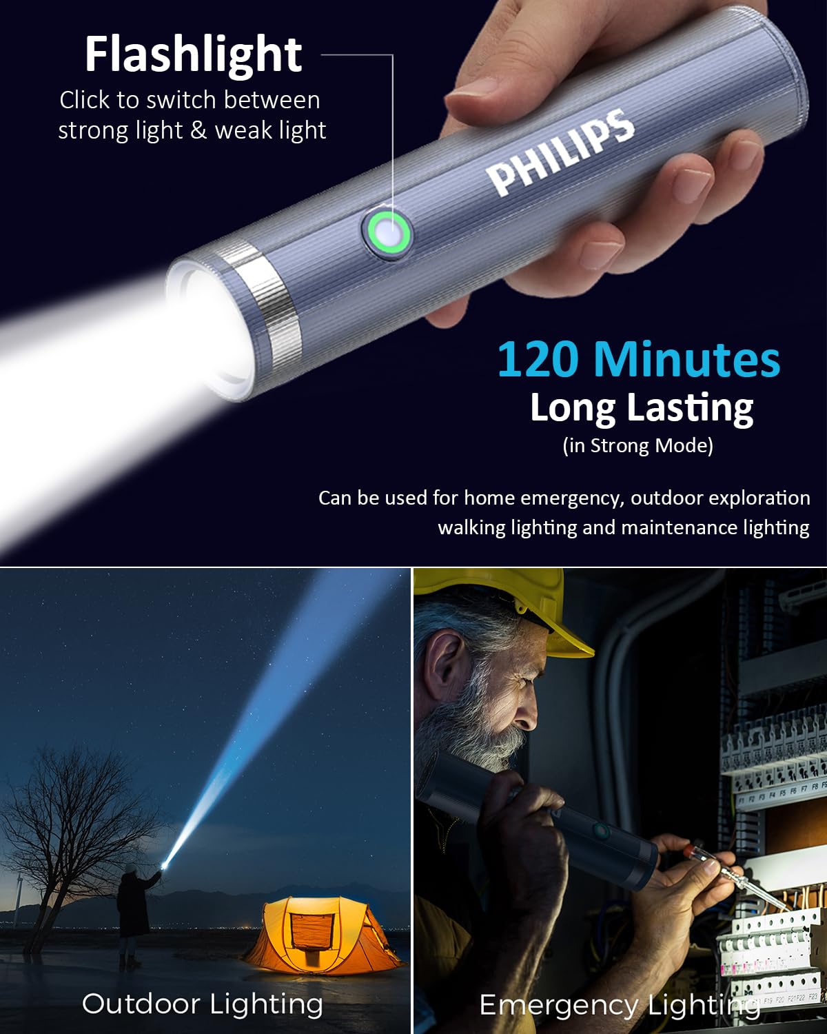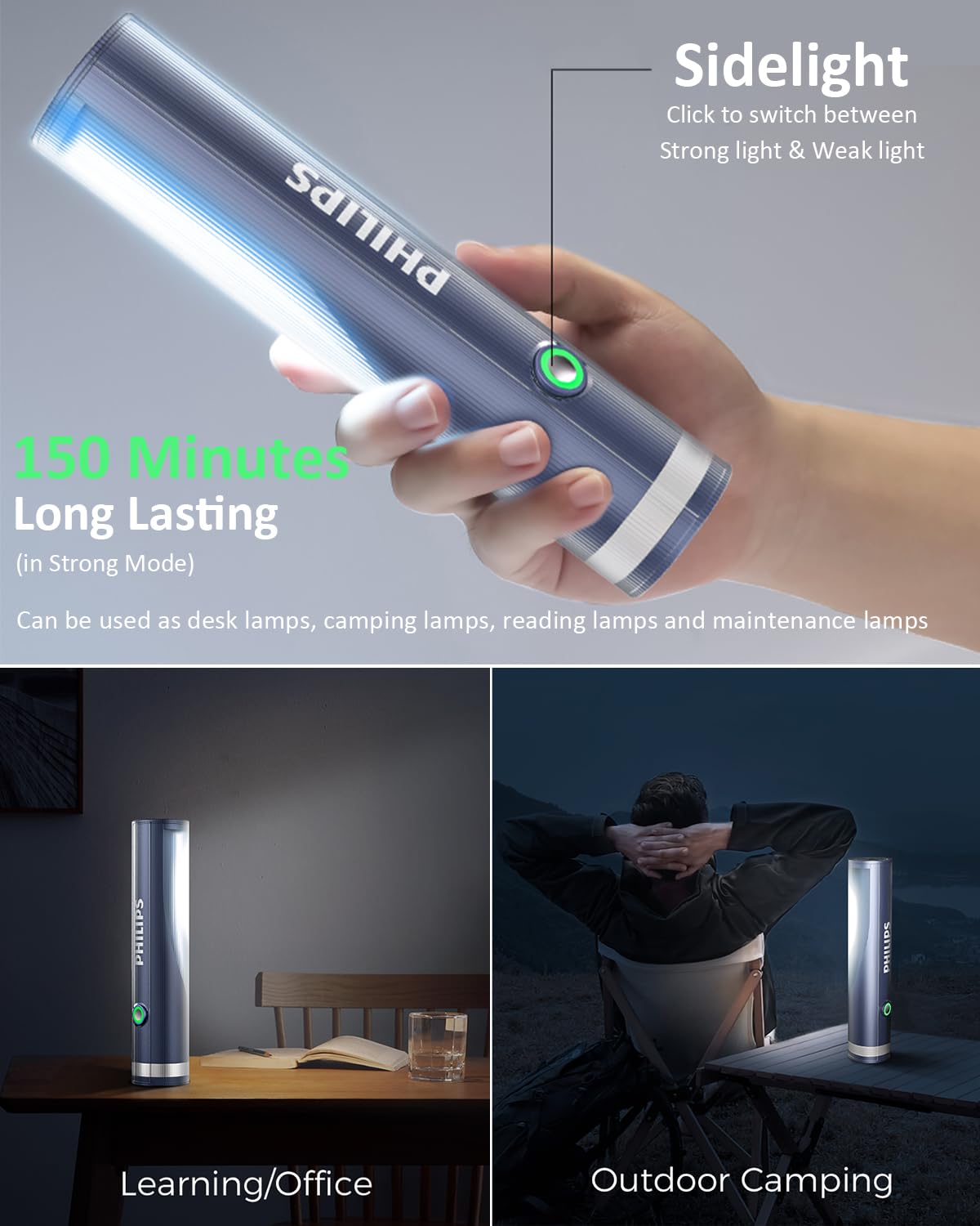【4 Lighting Modes Torch Light】Supporting flashlight & camping high/low light mode, flashing mode, SOS mode. Click to switch between high/low light flashlight and high/low light camping light, double-click for flashing mode, single click again for SOS mode. One lamp for multiple purposes
