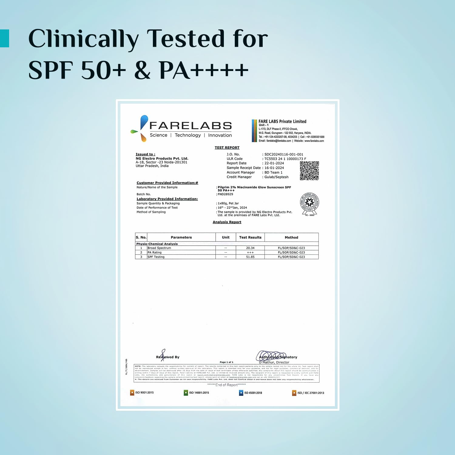 Details: Fall in love with 2% Niacinamide Glow Sunscreen which not only protects your skin from sun damage but also helps reveal a radiant glow. With SPF 50 and PA+++ protection, it prevents sun damage, tanning, and blue light effects.