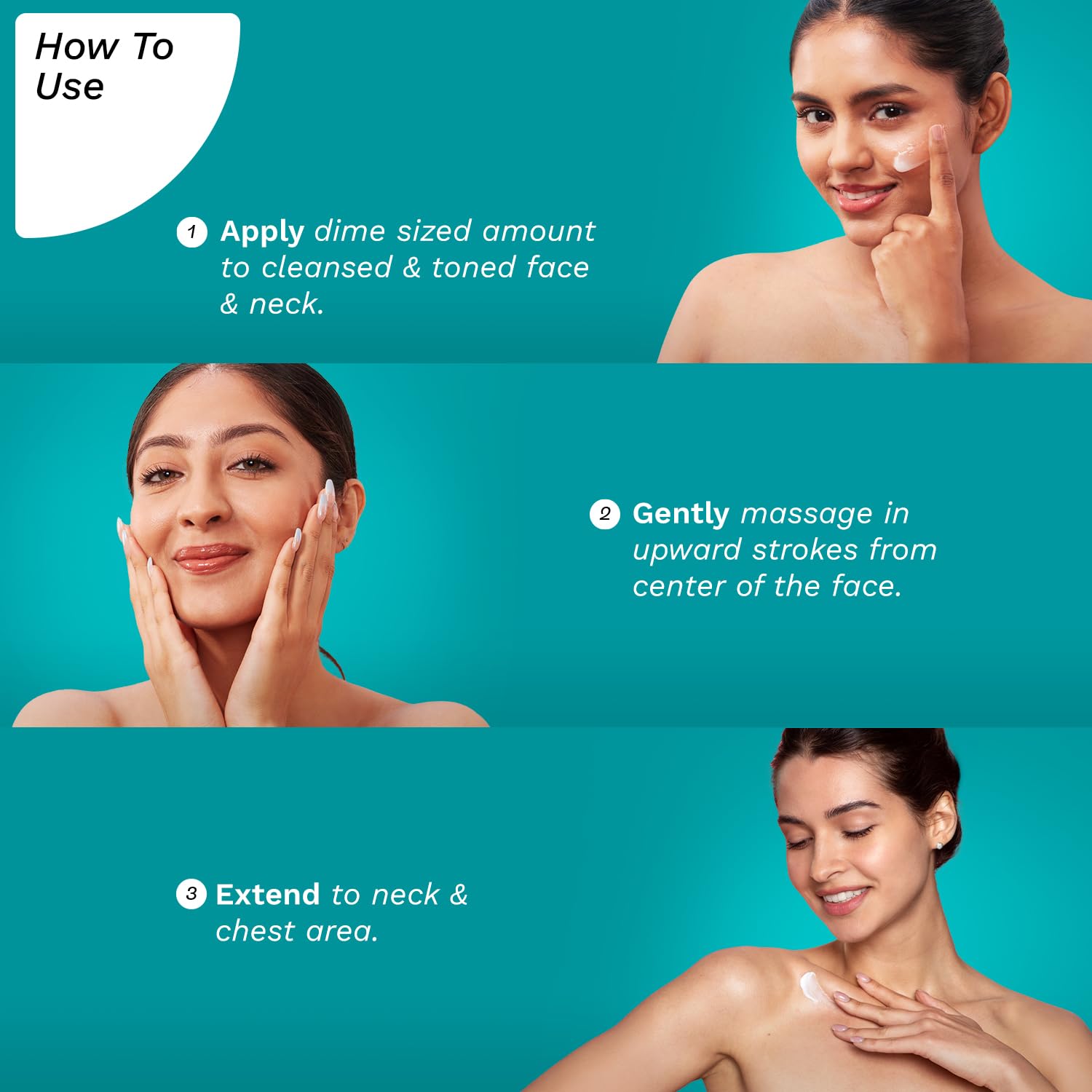✅HOW TO USE: Apply a dime sized amount to cleansed and toned skin. Dot all over the face and neck. Gently massage in upward strokes starting from the center of the face. Extend to the neck and chest area.