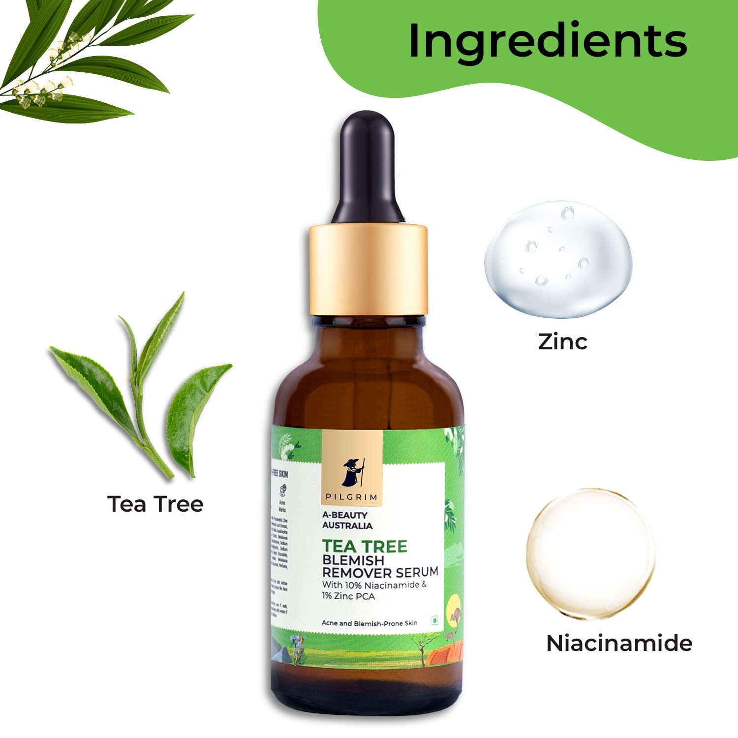 Pilgrim Tea Tree & 10% Niacinamide blemish-remover serum with Zinc PCA for acne prone skin | Acne scar reducing 10% Niacinamide serum for face | Women & Men | 30 ml
