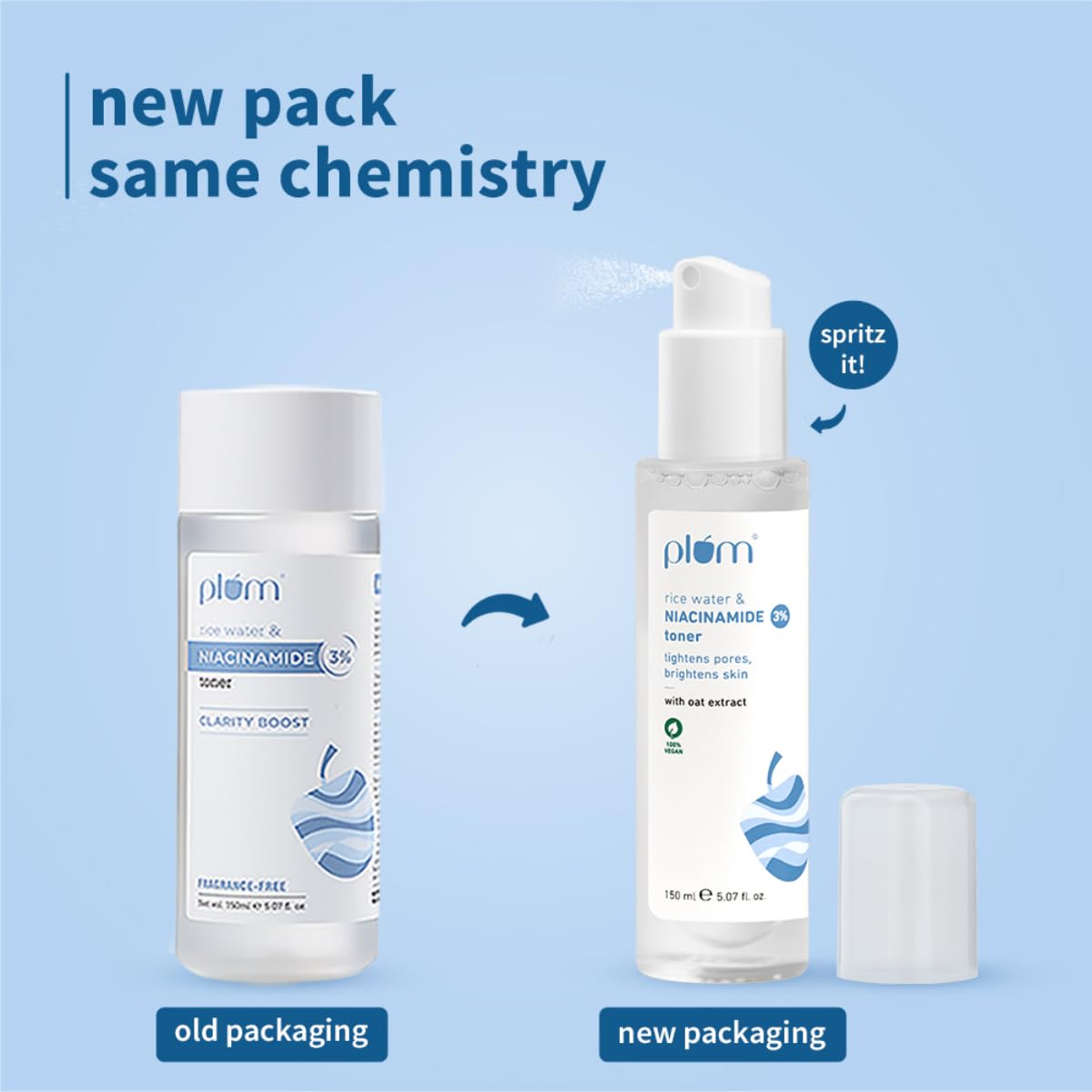 Plum 3% Niacinamide & Rice Water Face Toner | Alcohol-Free Toner for Oily Acne Prone Dry Combination Skin | Pore Tightening & Glowing Skin |Fades Blemishes, Brightens & Smoothens | Women & Men | 150ml