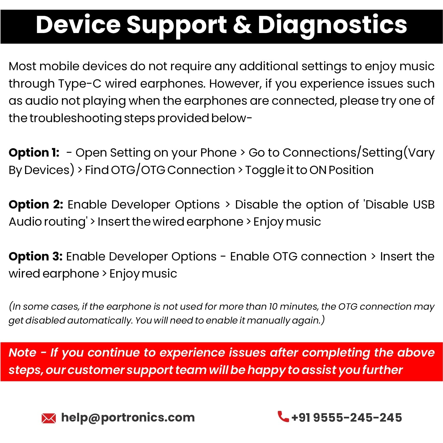 Note: If you encounter connectivity issues with your mobile phone, please open your device settings. Search for 'OTG' and enable the 'OTG Connection' option. If you experience persistent connection problems, contact our Customer Support for additional assistance.