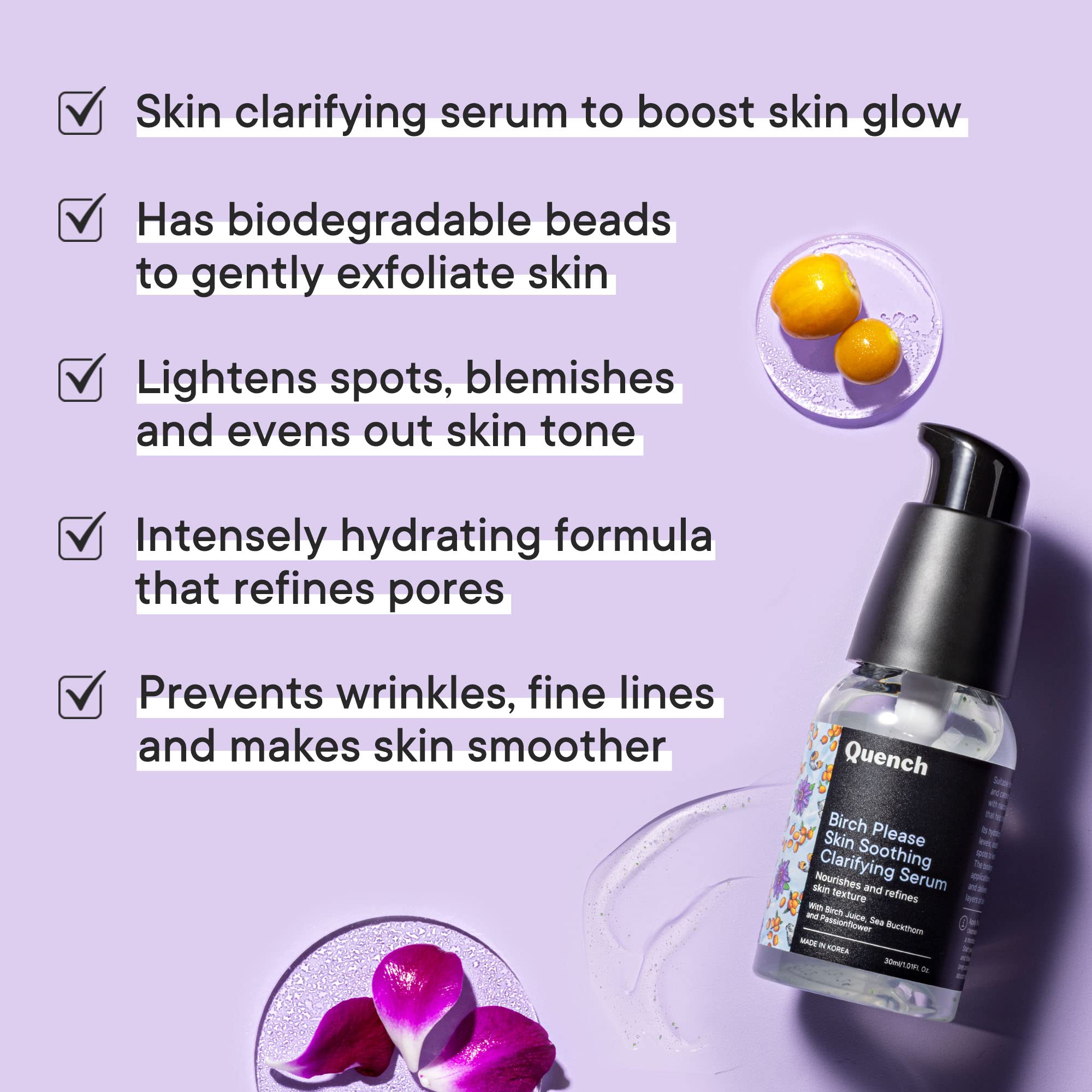 QUENCH BOTANICS Skin Soothing Clarifying Serum With Hyaluronic Acid & Birch Juice Enzymes | Instantly Hydrates | Lightens Spots & Evens Out Skin Tone | Made In Korea (30Ml)