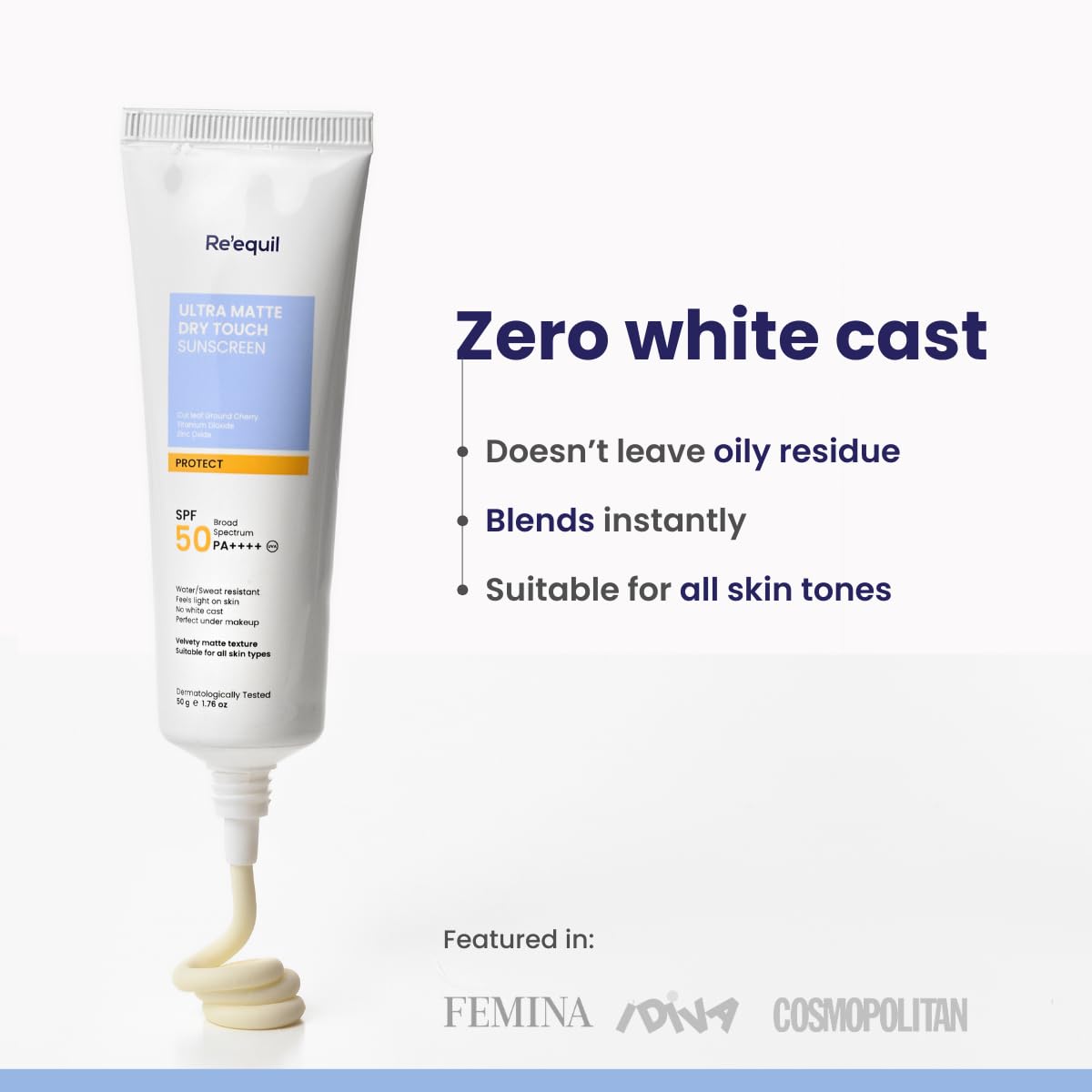 RE' EQUIL Ultra Matte Dry Touch Sunscreen | SPF 50 PA++++ | Water & Sweat Resistant | No White Cast, Non-Greasy & Non-Comedogenic | For All Skin Types | 50G