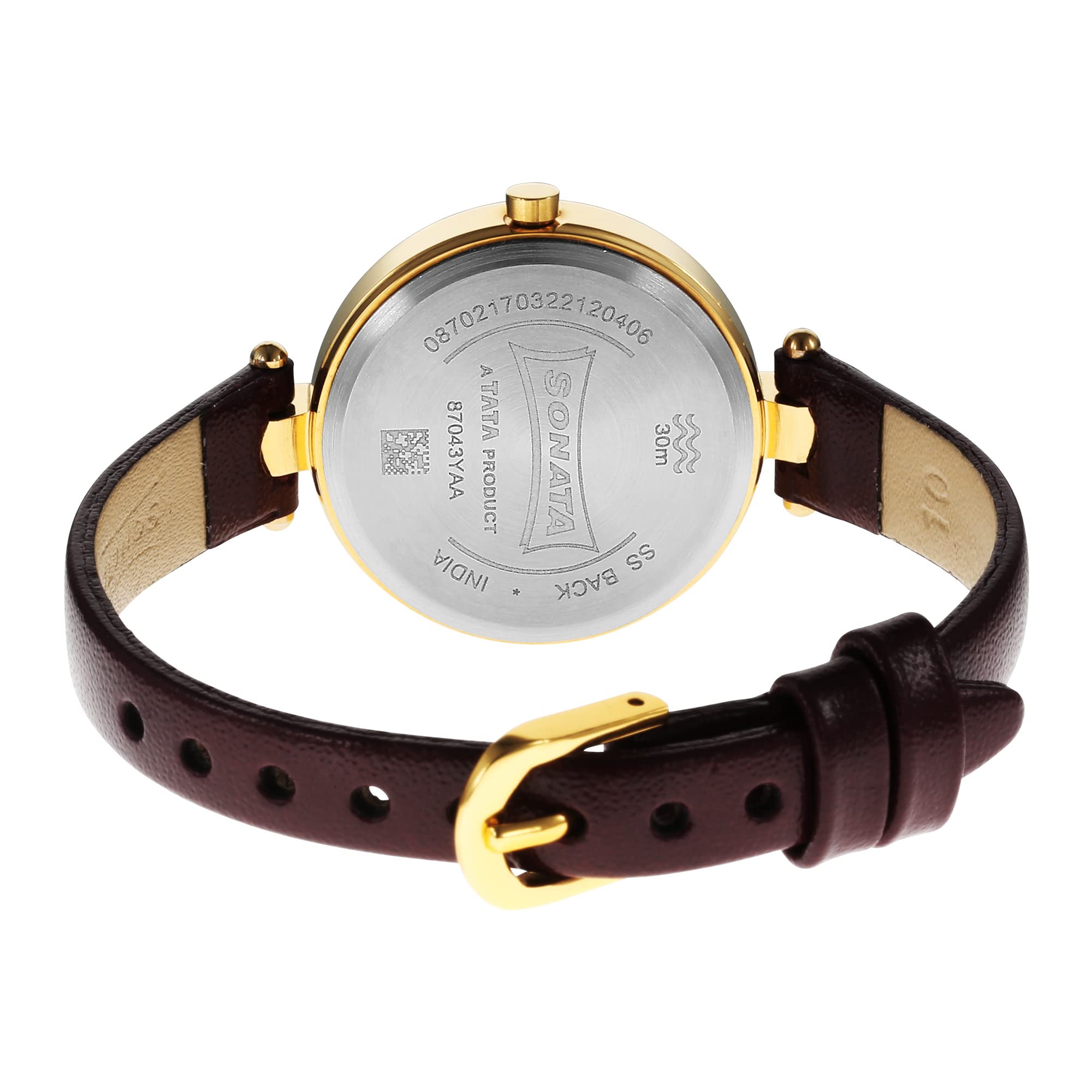 Details: Embrace subtle sophistication with this Sonata Gold Edit watch, designed to deliver everyday elegance. The round champagne dial exudes soft warmth, complemented by minimalist stick hour markers with dot accents and slender hands for a clean, refined look. The gold-tone case pairs beautifully with the rich brown leather strap, blending modern appeal with classic charm. Lightweight and comfortable, this timepiece is perfect for daily wear or understated formal occasions, making it a timeless addition to any woman’s accessory collection.