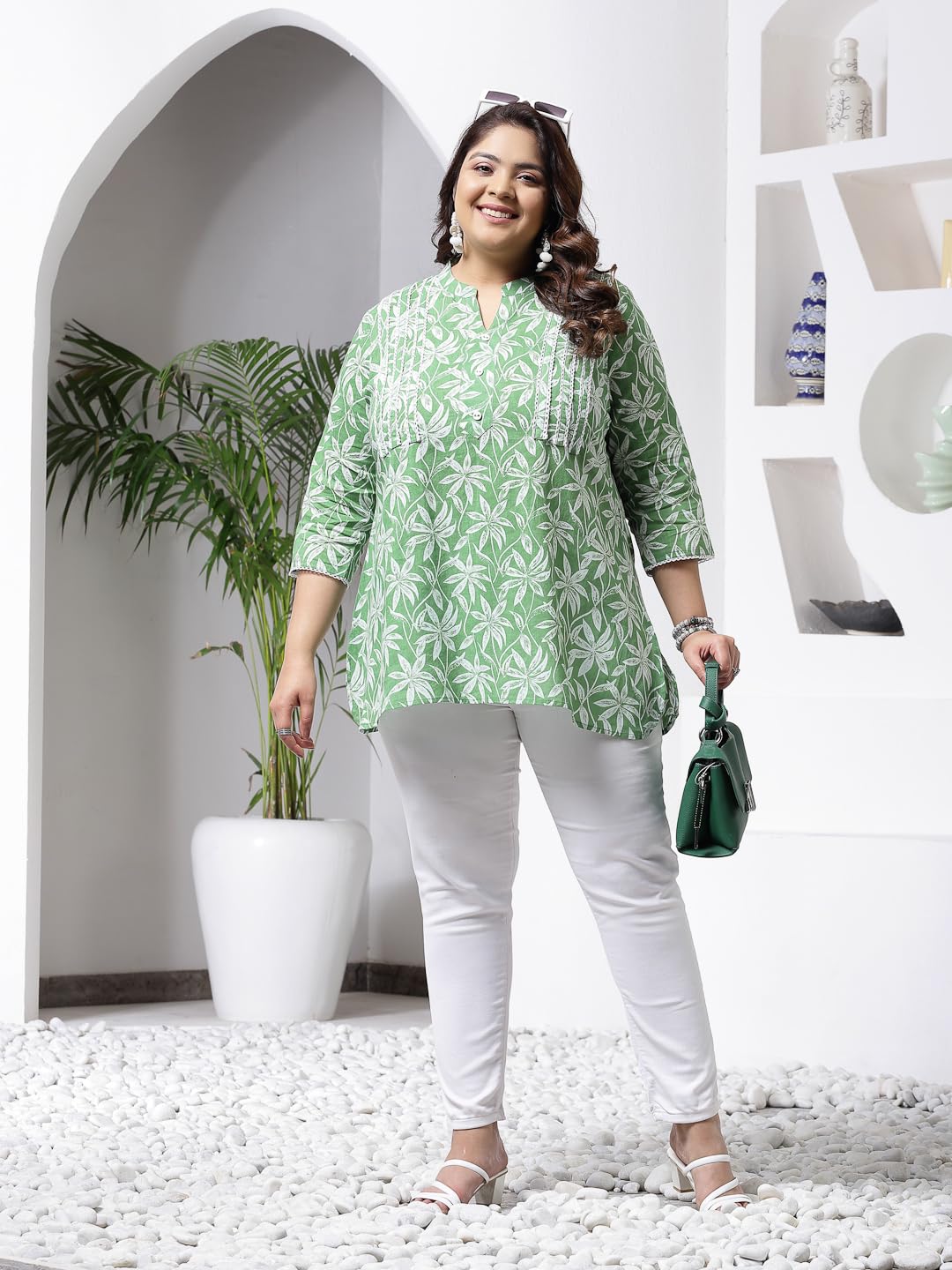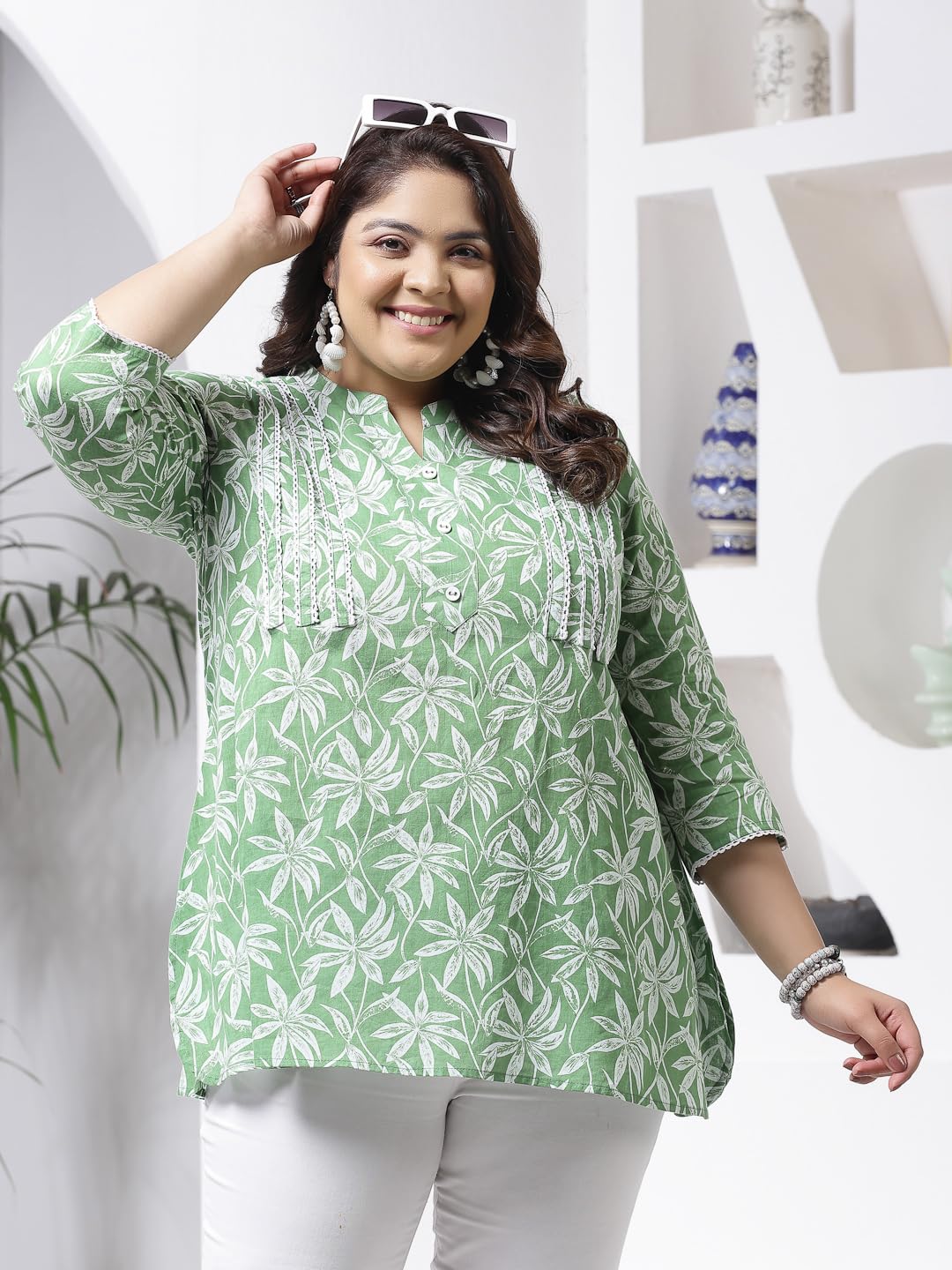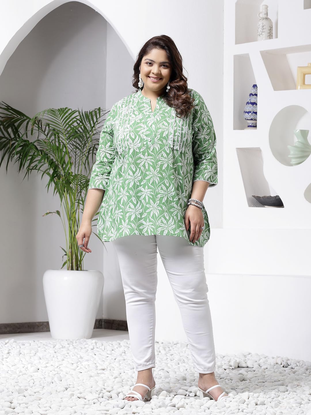 Green tropical printed cotton Empire top with mandarin collar neckline, regular sleeves and cotton lace detaling on front and sleeves.